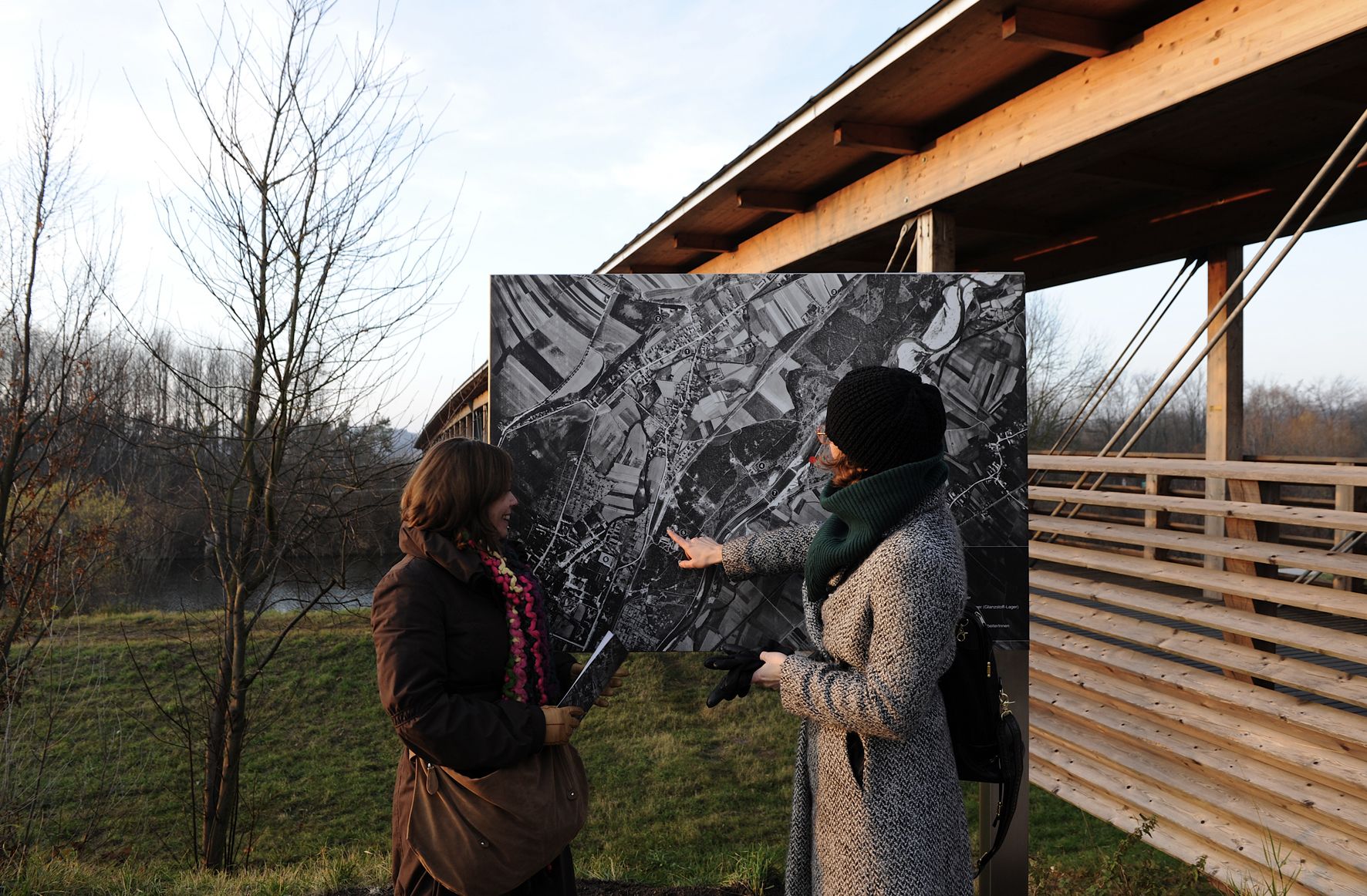 Es ist nicht allzu bekannt, dass in Viehofen bei St. Pölten von 1944 bis 1945 zwei Zwangsarbeitslager existierten. Ab 1967 wurde auf dem Areal eine Schotteraufbereitungsanlage betrieben. Nach der Einstellung des Betriebs legte die Stadt St. Pölten dort im Jahr 2003 ein Erholungsgebiet mit 2 Seen an. Unter einem der heutigen Seen befand sich allerdings ein Lager mit 126 Juden, daneben eines für nicht-jüdische ZwangsarbeiterInnen. Wie in Freizeitarealen üblich, hat Catrin Bolt hat an verschiedenen Stellen auf dem Areal Orientierungstafeln aufgestellt, auf denen üblicherweise neben dem eigenen Standort besonders schöne Aussichtspunkte oder Wege zu sehen sind. Die aufgestellten Tafeln sind genauso gestaltet, sie zeigen allerdings kein aktuelles Bild des Areals, sondern eine Luftaufnahme von 1945 auf der die Lager deutlich zu sehen sind. Die eigene Position ist mit einem roten Punkt markiert so dass die/der BetrachterIn versucht, sich zu verorten, dabei aber bemerkt, dass die Tafeln zwar das gleiche Gebiet, aber eine völlig andere Zeit zeigen. Mit Hilfe der Legende ist es möglich, die zwei Zwangsarbeitslager zu definieren. Vergangenheit und Gegenwart werden hier überlagert. Catrin Bolt verzichtet auf Pathosformeln sowie auf künstlerische Selbstreferenzialität und fordert mittels einer lapidaren Umlenkung des Blicks auf das nicht mehr Sichtbare eine bewusste Auseinandersetzung mit der Geschichte des Ortes ein.