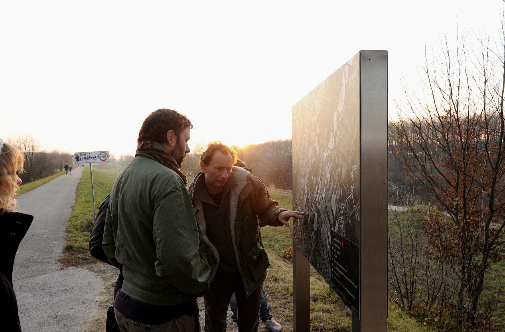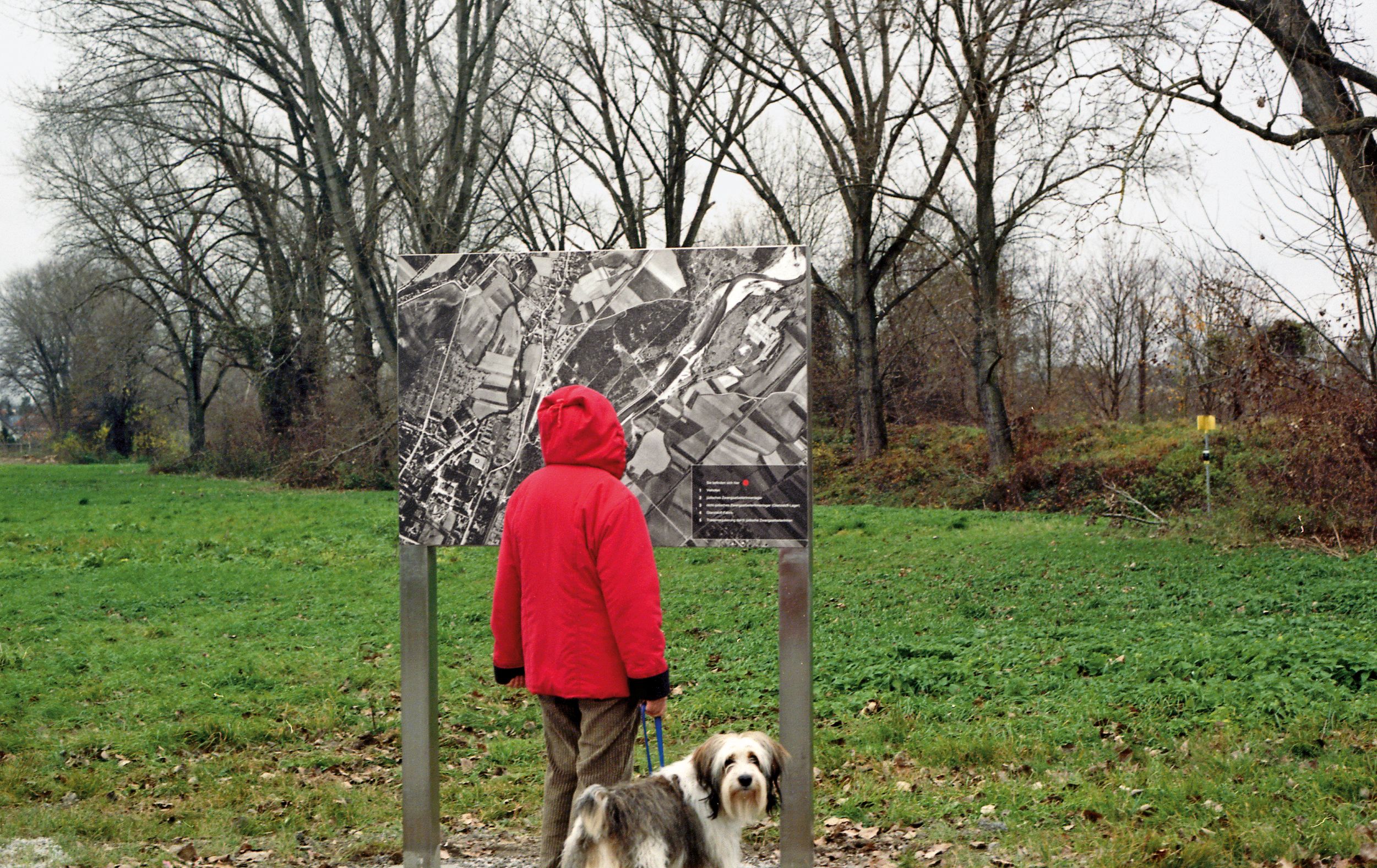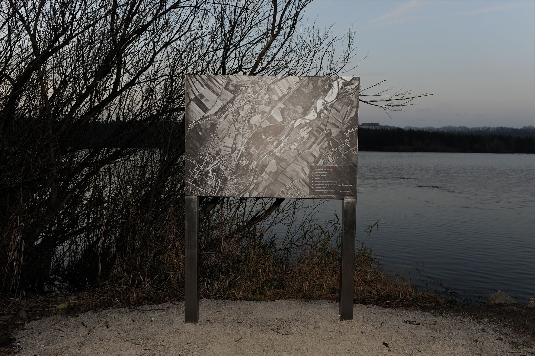 In Viehofen, einem kleinen Ort neben St.Pölten, gab es in den Jahren 1944 und 1945 zwei Zwangsarbeitslager. Später kam auf das Areal ein künstlicher See, der von der Bevölkerung nun als Freizeitareal - zum Schwimmen, Spazieren und Fahrradfahren - benutzt wird. Wie in Freizeitarealen üblich, habe ich an verschiedenen Orten um den See Orientierungstafeln aufgestellt. Die eigene Position ist mit einem roten Punkt markiert, so dass die/der BetrachterIn versucht, sich zu verorten, dabei aber bemerkt, dass die Tafeln zwar das gleiche Gebiet, aber eine völlig andere Zeit zeigen. Mit Hilfe der Legende ist es möglich, die zwei Zwangsarbeitslager zu definieren.