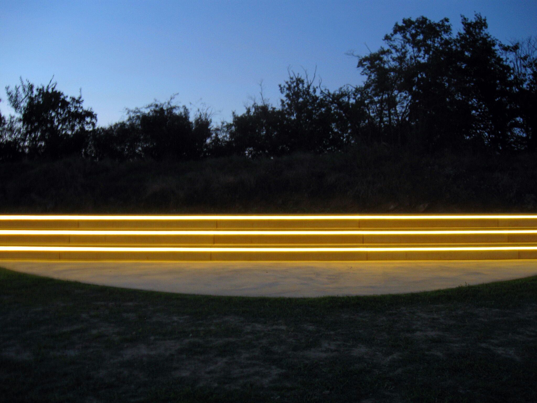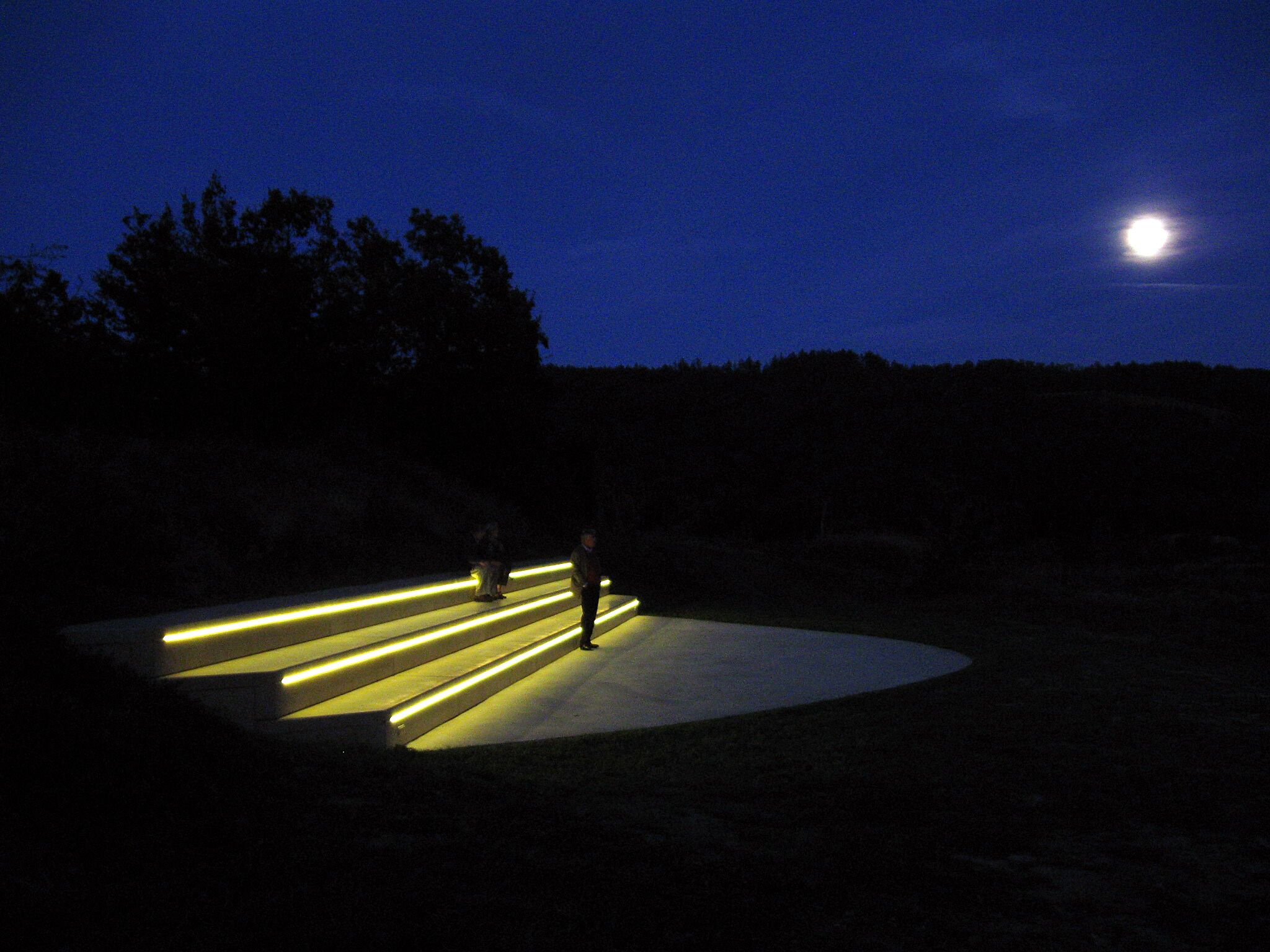 Der im Weinviertel lebende Künstler Norbert Maringer hat seinen Blick geschärft für spezielle Phänomene und Besonderheiten in der Natur. Gleich einem Archäologen sucht er dort, wo andere vorübergehen, spürt auf, was verborgen ist, und verstärkt, was er findet. Er weckt die Aufmerksamkeit, stellt Bezüge her, legt Maßstäbe an und setzt in Proportion. Mit minimalen künstlerischen Interventionen gibt Maringer einen Fingerzeig, empfindsam, klar, aber auch irritierend. In Schönberg am Kamp hat er eine ehemalige Weinbergterrasse unterhalb der barocken Kreuzigungsgruppe für seine künstlerische Arbeit ausgewählt. Der Blick ins Land von hier ist prächtig. Der Künstler hat mit der sehr strengen formalen Lösung die umliegende Landschaft zur Bühne gemacht. Eine Aussichtsterrasse in Form einer Hyperbel aus sandfarbigem Beton mit drei Sitzreihen schmiegt sich in den Hang, wächst in den Hügel hinein und verbindet sich mit der Umgebung. Sehr bewusst hat Maringer für seine Intervention keine Materialien aus der Natur verwendet, sondern Beton und LED-Lampen, technisch entwickelte Produkte des "Homo sapiens", als deutlichen Eingriff in die von Gott geschaffene Natur.