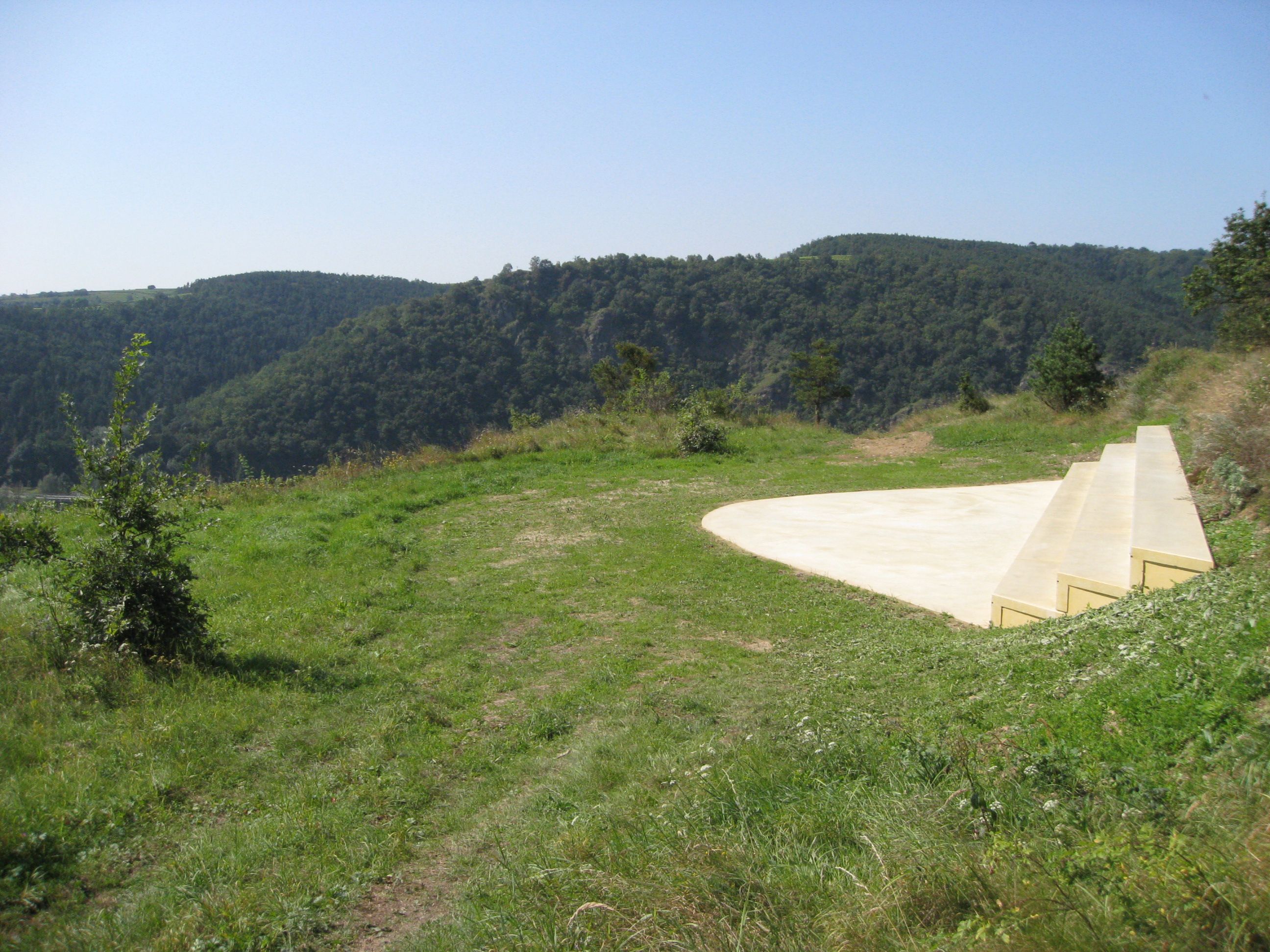 Die "Schaubühne-Sitzplatzskulptur Kalvarienberg" ist eine in den Hügel hinein gebaute Aussichtsterrasse in der minimalistischen Form einer Hyperbel. Der Künstler wählte speziell diesen Platz aus, von dem aus der Blick ein einzigartiges Naturerlebnis erlaubt. Die Materialien der drei mit LED-Leuchten versehenen Sitzreihen aus sandfarbenem Beton sind bewusst als deutlicher Eingriff in die Natur gedacht.