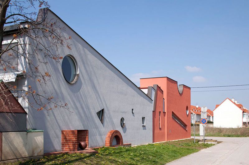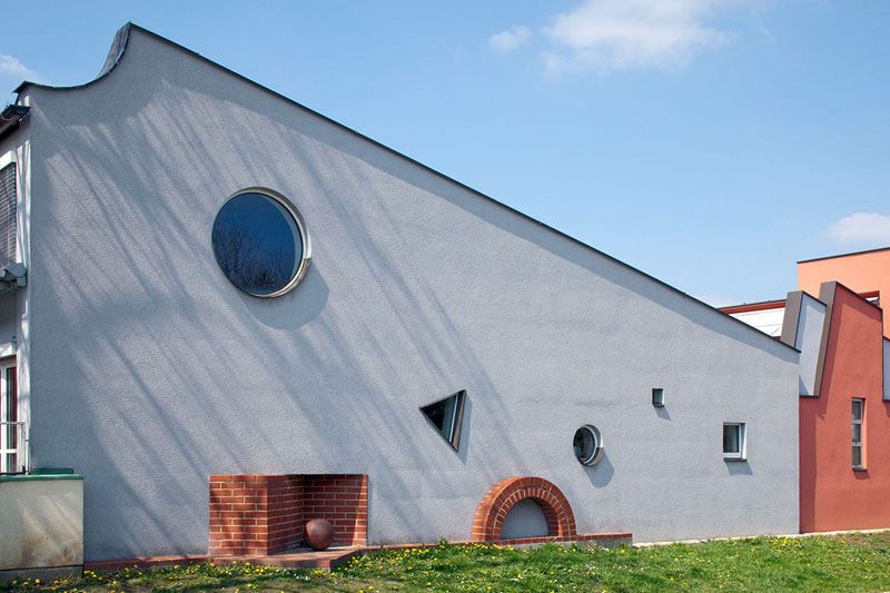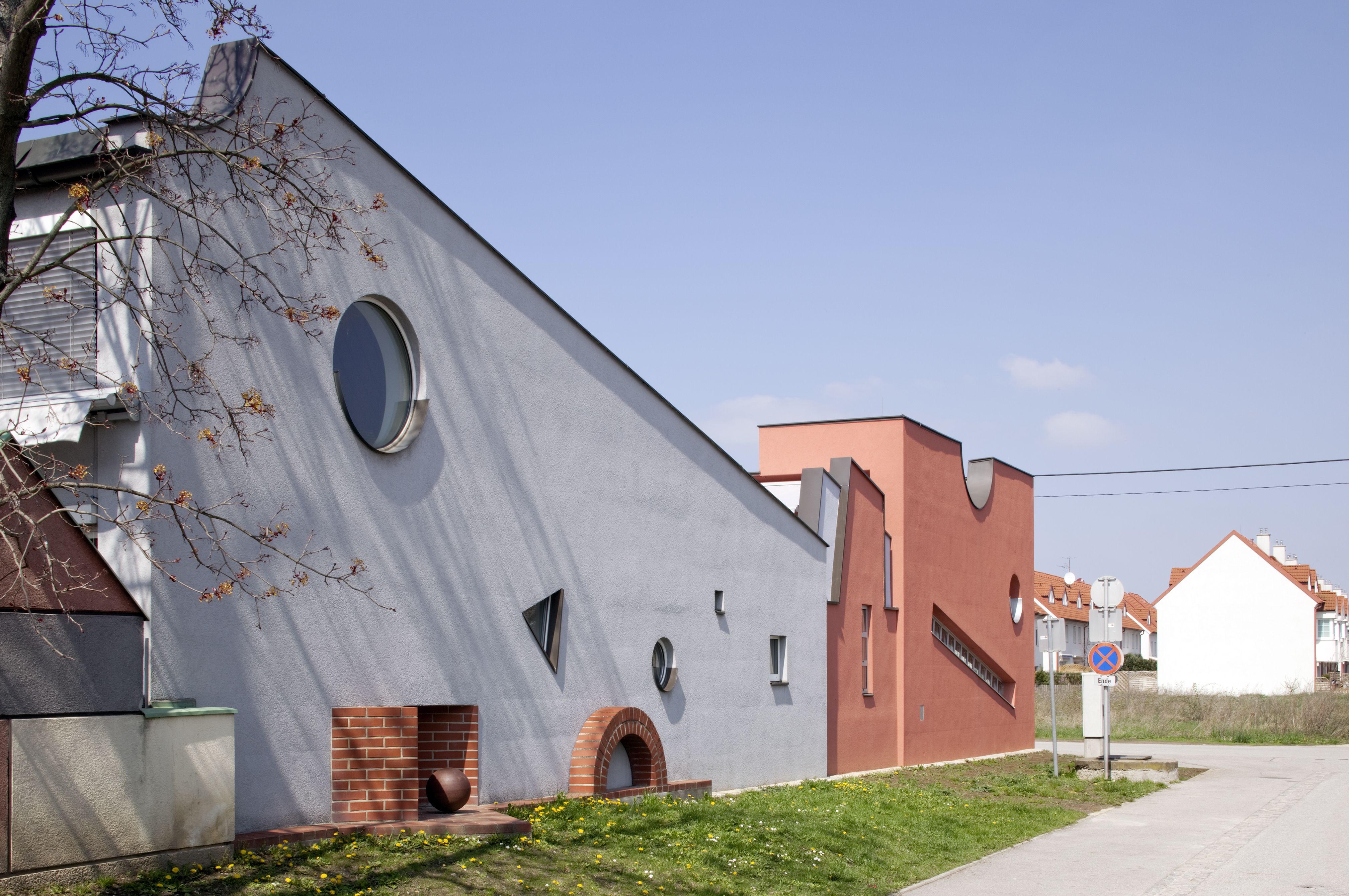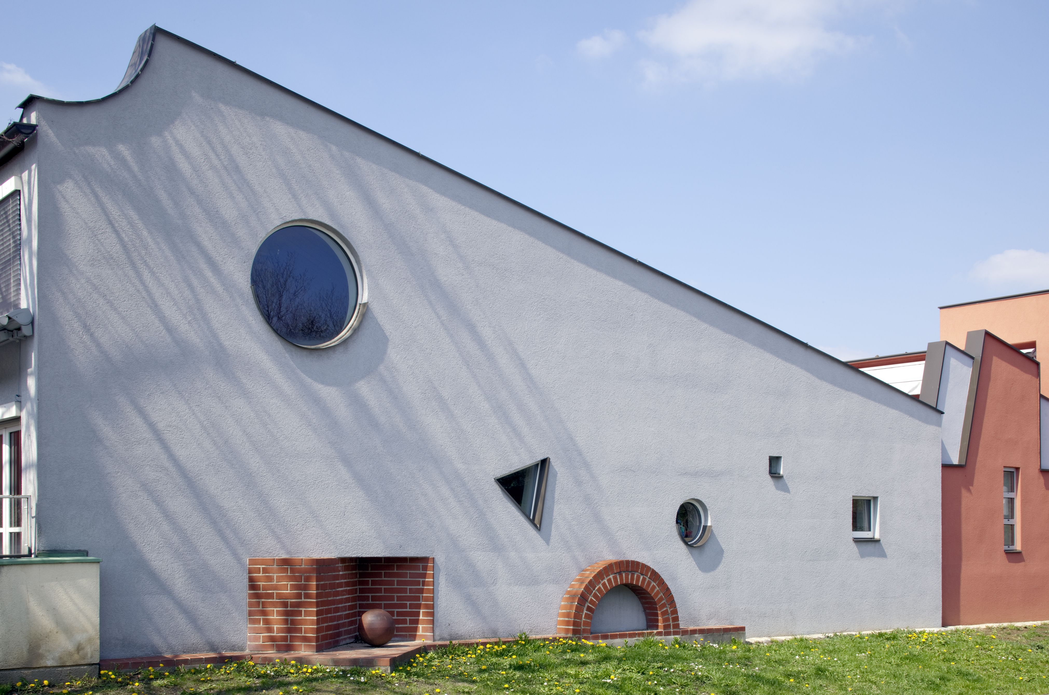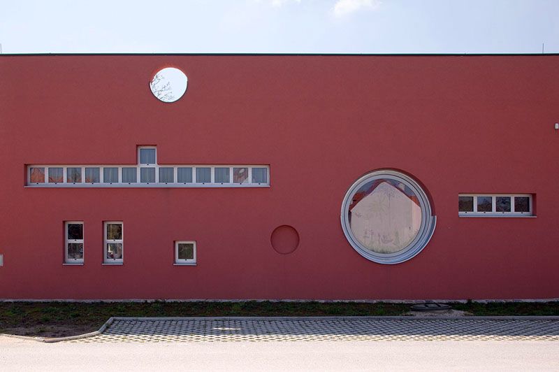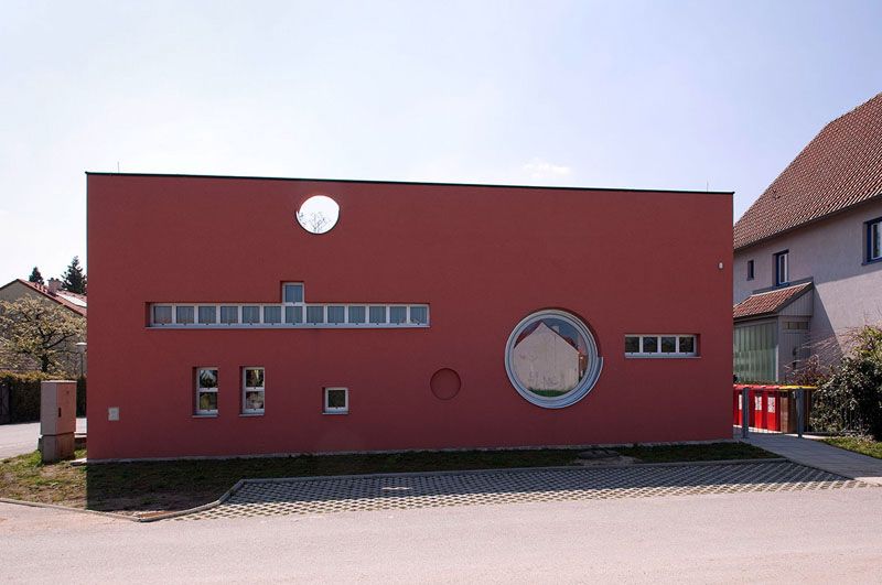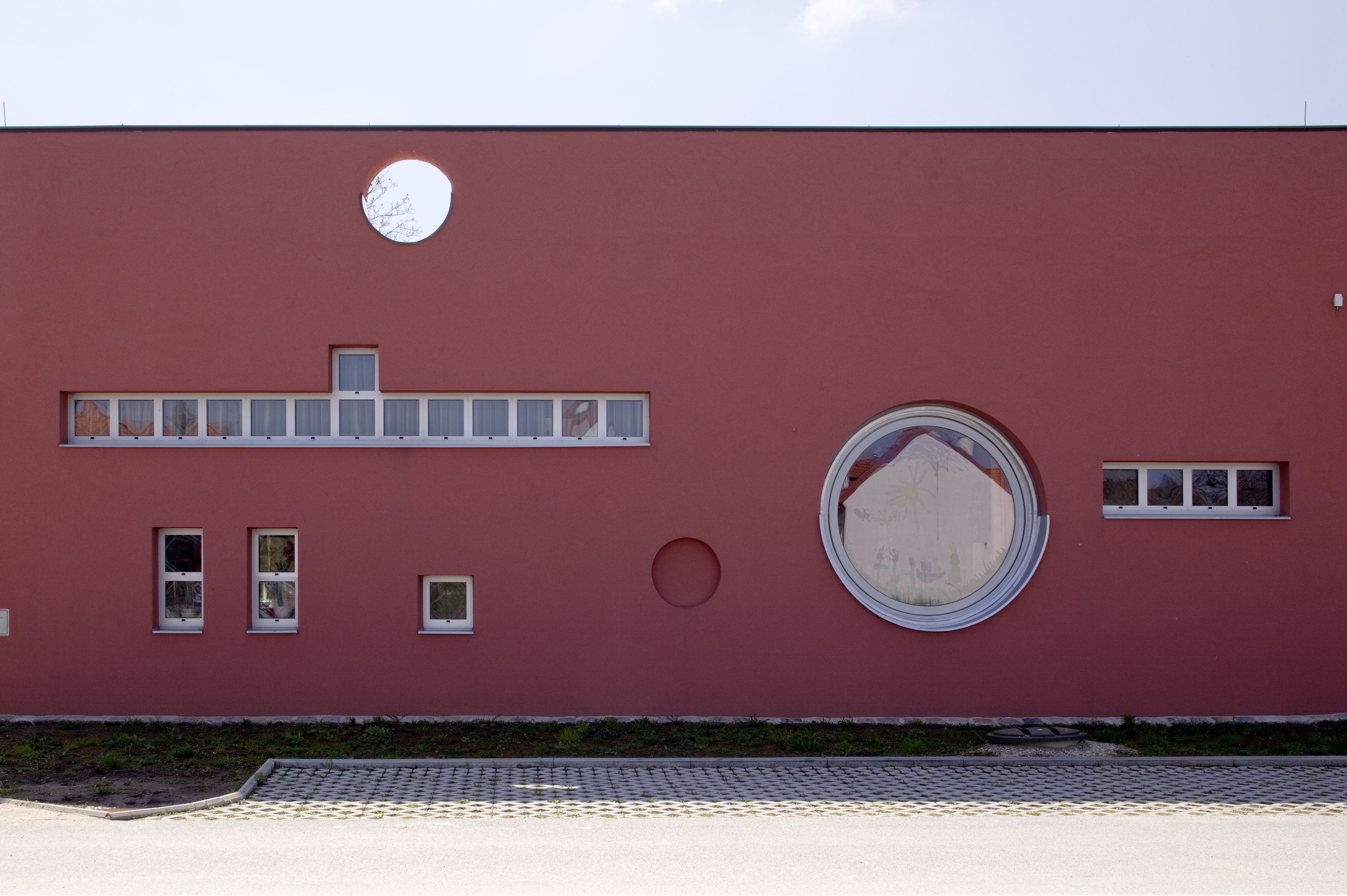Der Bau des Kindergartens von Gerasdorf 1993 machte für das Künstlerteam K.U.SCH. den "Künstlertraum" wahr, ein Haus als Skulptur zu realisieren. 2008 konnte von ihnen auch dessen Erweiterung konzipiert werden. Ganz im Sinne ihrer künstlerischen Denkweise werden nicht nur die medialen Grenzen der klassischen Kunstsparten überschritten, sondern diese auch miteinander verflochten. Der gemeinsam mit Architekt Ernst Mrazek entwickelte gefächerte Grundriss, dessen Fokus eine hoch aufragende Stele markiert, wurde ausgebaut. Gleich einem kriechenden Gürteltier windet sich der skulpturale Baukörper um seine Achse und signalisiert mit einem zeltförmigen Vorbau den Eingangsbereich. Auf den neuen Mauerflächen entstehen durch das Übereinanderreiben von vier Putzfarben bunte Wolkenformen. Mit der Einbindung von Rund- und Blindfenstern wird das Wechselspiel von Licht und Schatten, Bild und Rahmen sowie Skulptur, Architektur und Malerei weitergesponnen. K.U.SCH. steht auch mit dieser Arbeit konsequent in der selbst vorgegebenen künstlerischen Methodik der mehrfachen Bezüglichkeiten und Irritationen des täglichen Lebens. Wie bei den Objekten, Skulpturen, Installationen, Bildern, Performances und Land-Art-Projekten von K.U.SCH. funktioniert hier das Großobjekt Architektur als Signal und spricht in seiner Körperhaftigkeit, Bezüglichkeit und Ausstrahlung eigene Worte. Mit dem "Rühren" am Unterbewussten und dem Anregen zur Assoziation stellen K.U.SCH. Ähnlichkeiten und Sinnverwandtschaften her, die nicht nur den Kindern, sondern auch den Eltern und BesucherInnen des Kindergartens neue Denkanstöße geben können.