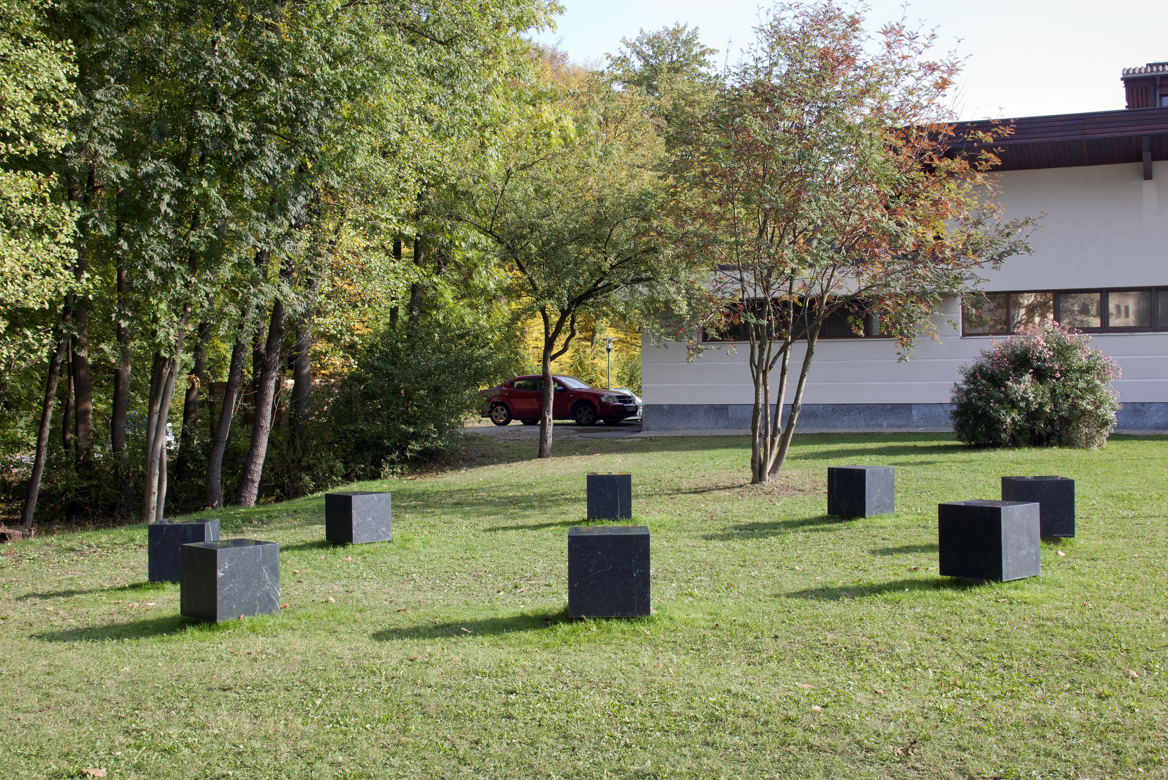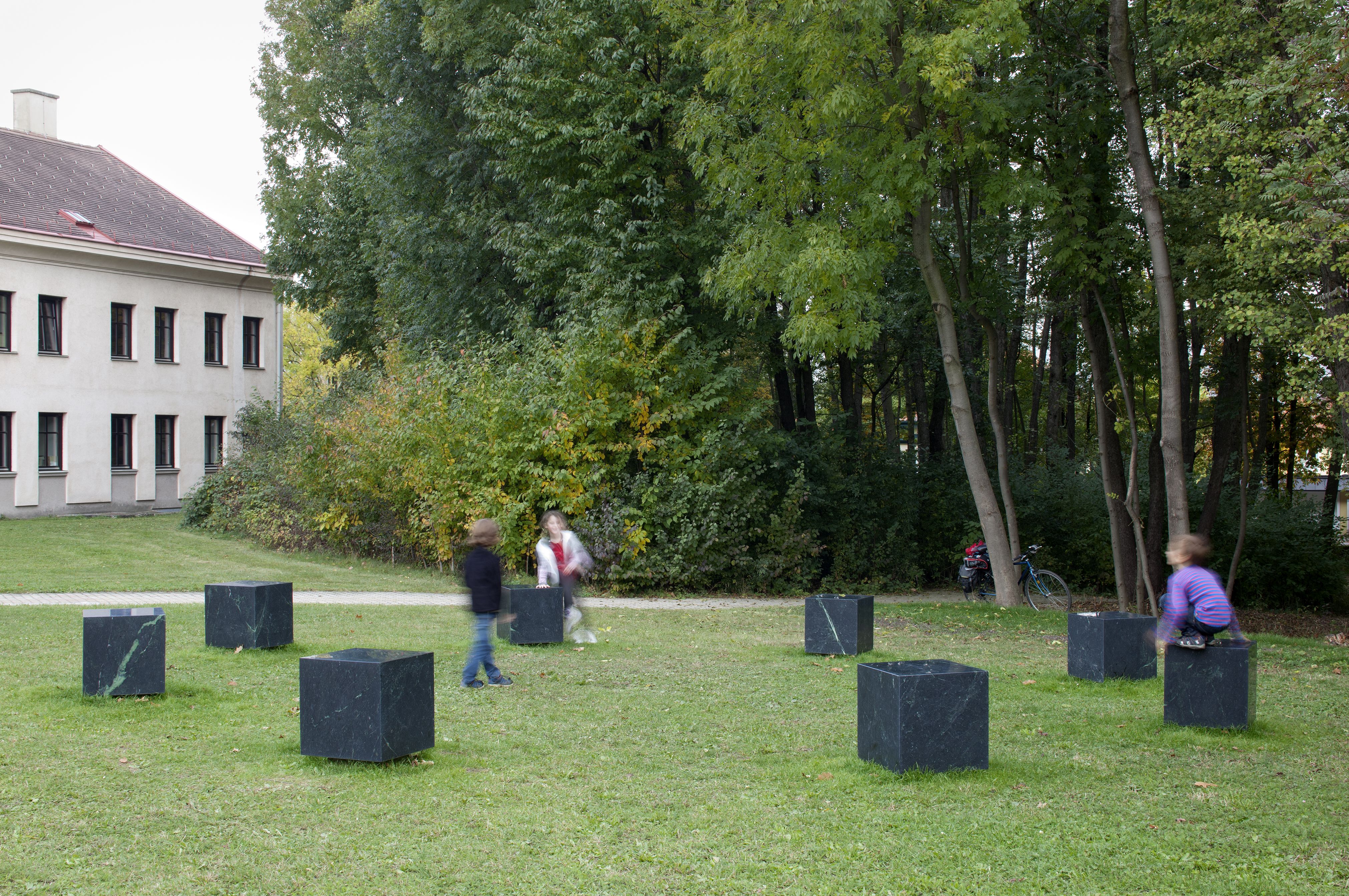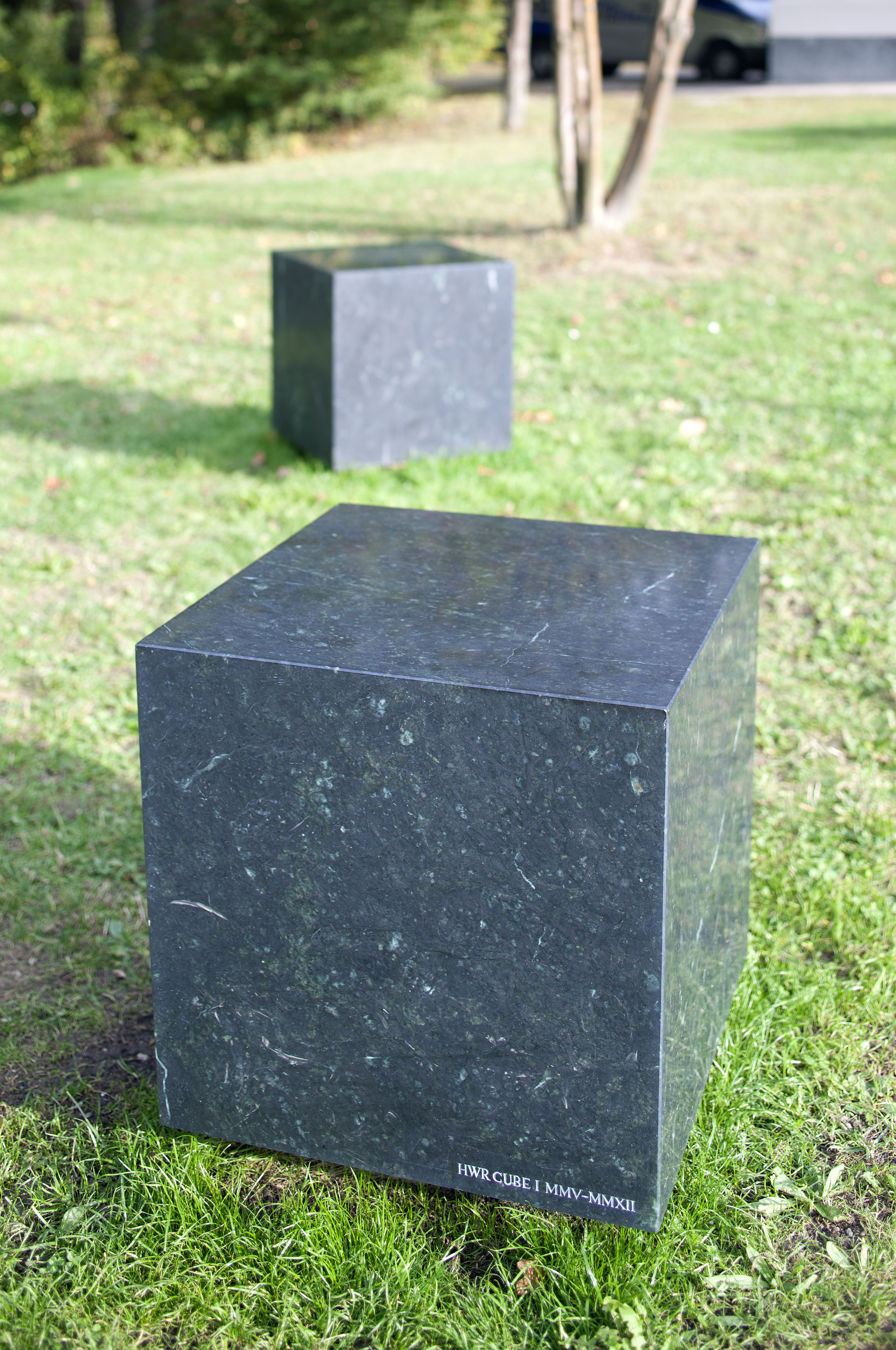 Der Titel der achtteiligen Steinskulptur "Teilung eines Würfels [01]" informiert in aller Sachlichkeit über deren äußere Umstände: Heliane Wiesauer-Reiterer ließ aus dem Urgestein in Prägraten (Osttirol) einen Würfel aus Serpentinit von einem Kubikmeter Größe herausschneiden und durch nur drei zentrierte Schnitte in acht Kuben zu je 50 x 50 x 50 Zentimeter zerteilen.