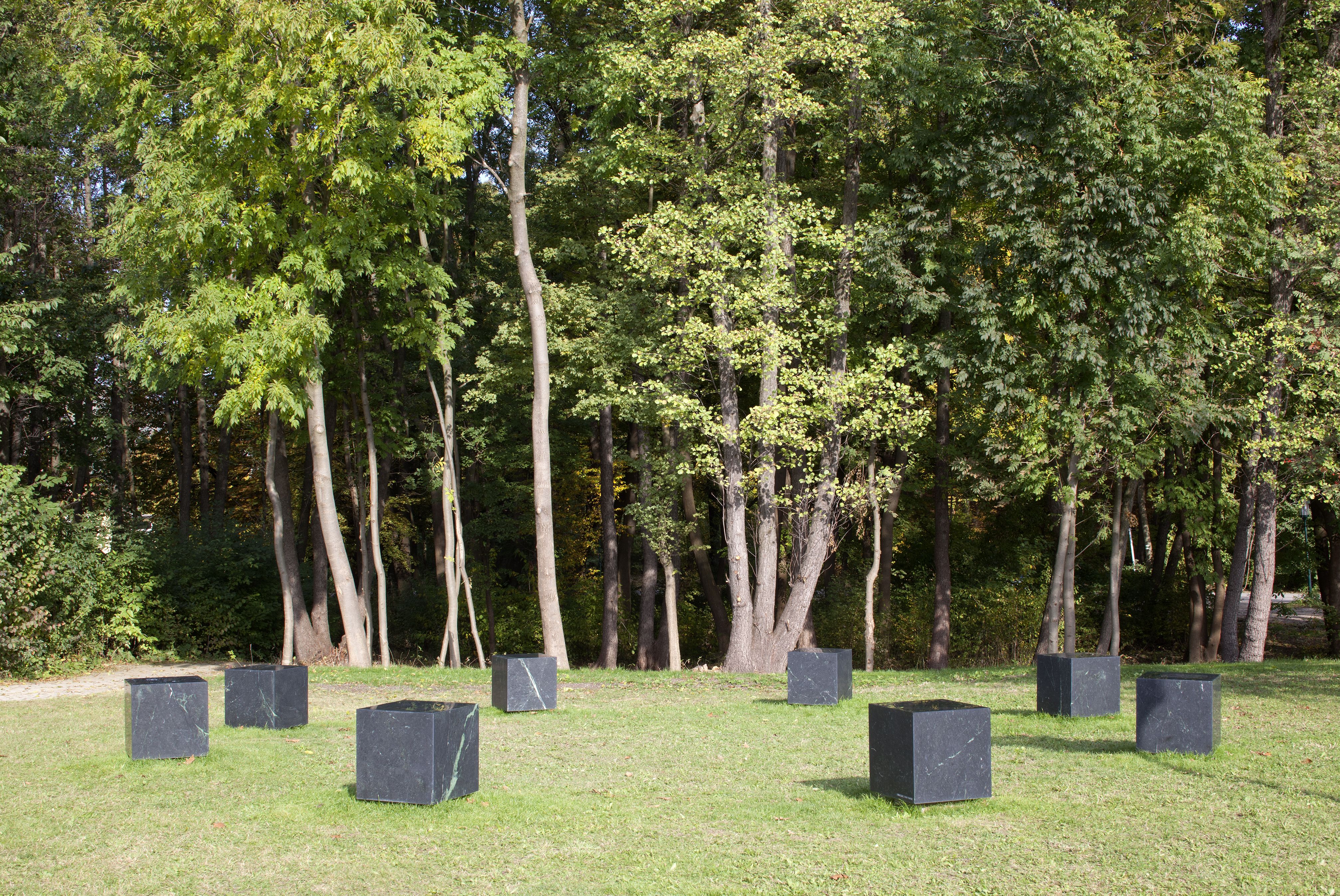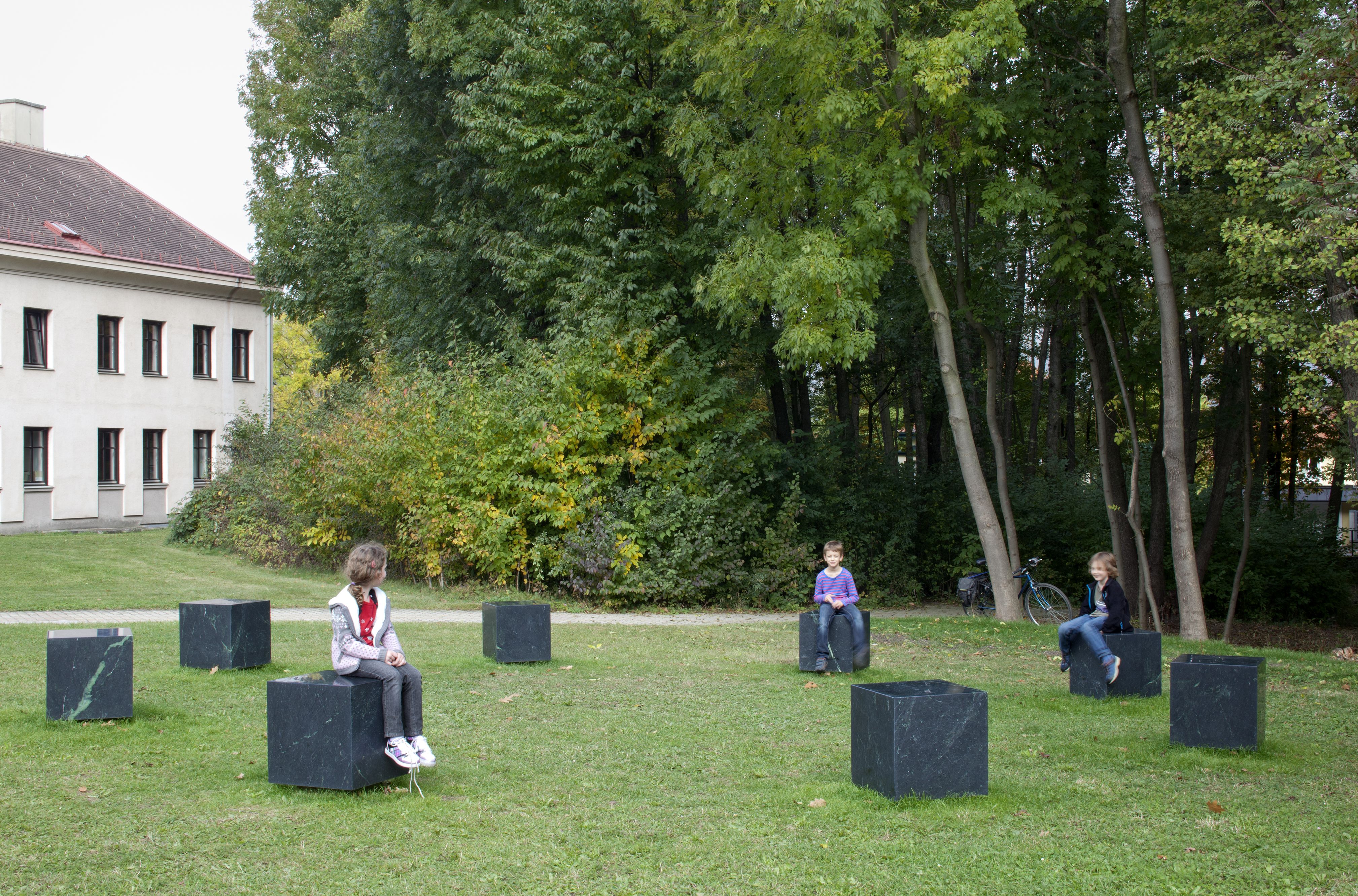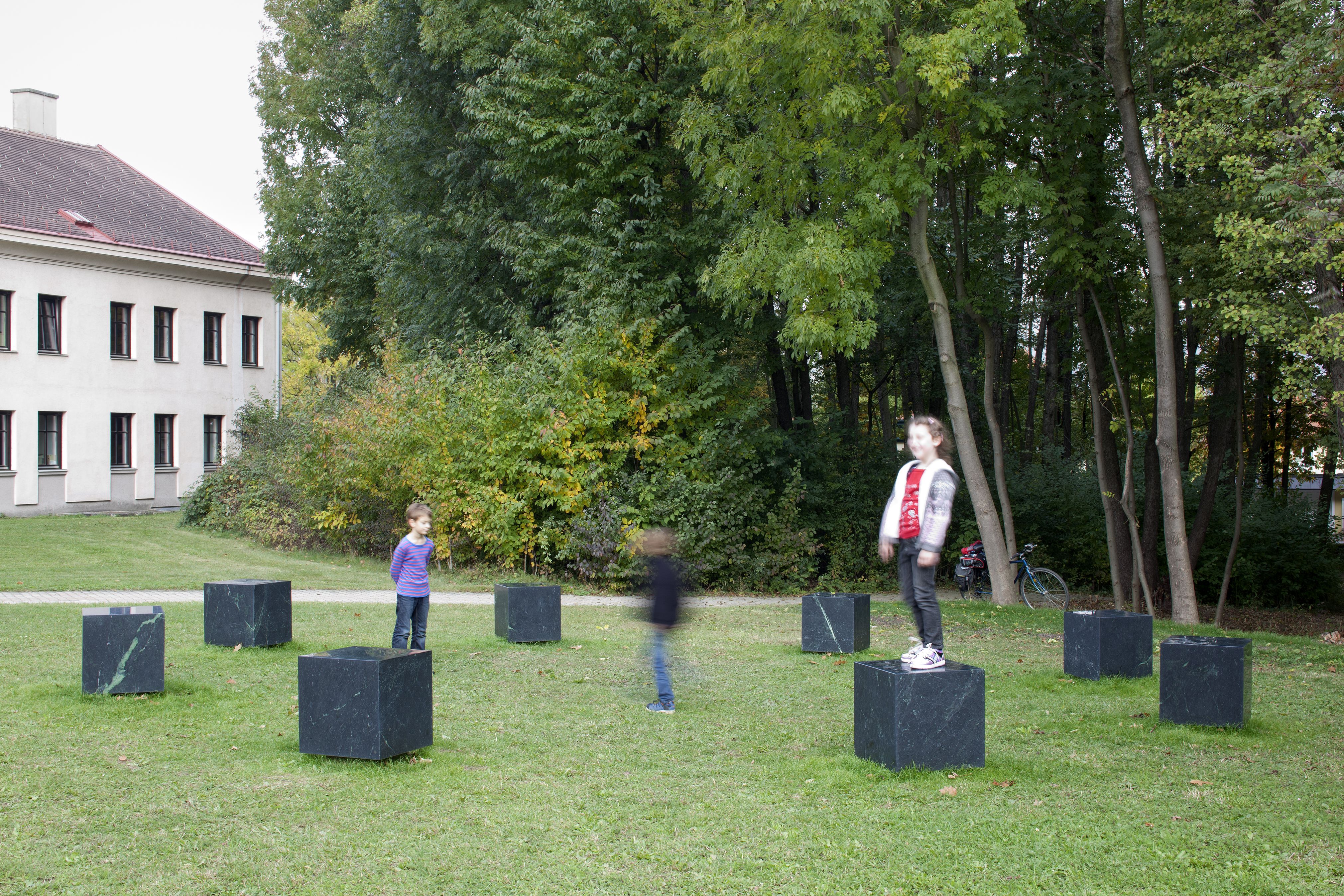 Der Titel der achtteiligen Steinskulptur "Teilung eines Würfels [01]" informiert in aller Sachlichkeit über deren äußere Umstände: Heliane Wiesauer-Reiterer ließ aus dem Urgestein in Prägraten (Osttirol) einen Würfel aus Serpentinit von einem Kubikmeter Größe herausschneiden und durch nur drei zentrierte Schnitte in acht Kuben zu je 50 x 50 x 50 Zentimeter zerteilen.