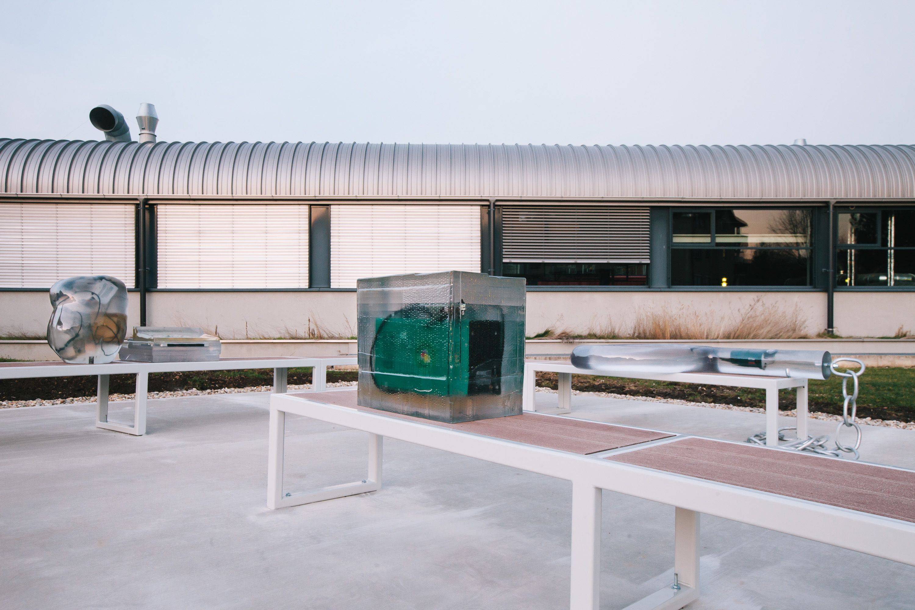 Für den inhaltlichen Fokus des Projekts an der LBS Mistelbach wollte ich zwei Schwerpunkte der Schule, Metallbearbeitung und Elektronik, zum Thema machen. Das ist auch insofern wenig verwunderlich, als eine fantastische Maschinenarmada die Räumlichkeiten des Gebäudes bewohnt. Gleichzeitig interessierte mich aber auch ein anderes Moment im Schulalltag: Der Platz mit seinen Bänken ist einer jener Orte, wo sich die Schüler_innen in den Pausen und nach dem Unterricht treffen, um weitere Gespräche über Themen wie Metallbearbeitung und Elektronik zu führen – Kabelquerschnitt- und Kehlnaht-Smalltalks – und um die anderen in den kurzen Monaten des Unterrichts etwas besser kennenzulernen und um abzuhängen. Zu diesen Gruppen gesellt sich in dem hier vorgestellten Projekt meine eigene "Peer Group". Meine Peers Betoni, Zilli, Flo und Gregorius sind Künstler_innen, deren Arbeiten ich sehr schätze und die außerdem in ihrer Praxis Metallbearbeitung und/oder Elektronik als zentralen Bestandteil einsetzen. Gemeinsam haben alle, dass sie gerade beim Aufbau eines eigenen Maschinen-Fuhrparks sind. Die Kompromisse, die daher beim Ebay-Herumklicken, Will-haben-Studium und bei den verzweifelten Anrufen bei Werkzeughändlern entstanden sind, funktionieren … so einigermaßen. Ganz okay. Aber wie toll wäre denn so was Richtiges? Also wie toll wäre denn bitte Mistelbach-Style! Für die Arbeit "Peer Group" schlug ich den beteiligten Künstler_innen folgendes Tauschgeschäft vor: Ich bekomme ein Gerät aus ihrem Werkzeugbestand und darf eine Form aus ihrem Portfolio zitieren, die ich in die Skulpturengruppe vor der Schule integriere und in die das Altgerät eingegossen wird. Im Gegenzug erhalten sie eine nigelnagelneue Maschine, und mit dem Equipment der Landesberufsschule einigermaßen mithalten kann.