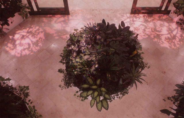 Im Vergleich zum botanischen Garten ist der Ort für die Pflanzen im Krankenhaus ein rein künstlicher und unpoetischer. Die Pflanzen können in ihren Hydrokulturcontainern nur durch eine Nährsalzlösung und durch spezielles Licht überleben. In der sterilen Krankenhausumgebung und der dafür typischen schattenlosen Beleuchtung gibt es keinen romantischen Blick auf Natur. Die Pflanzen laufen Gefahr, sich in geruchlose, unsichtbare Institutswesen zu verwandeln. Der erste Teil der Arbeit betrifft den künstlichen Lichthof, der vom Erdgeschoß und vom ersten Obergeschoß einzusehen ist. Er ist architektonisch gesehen die isolierte Fortsetzung des realen Lichthofes, der ein Stockwerk darüber beginnt. Durch die Anordnung der Pflanzencontainer entsteht eine spezielle, labyrinthische Wegsituation, in der der Einblick in den Raum permanent verstellt ist und man sich den Raum trotz seiner Kleinheit erst erschließen muß. In die Decke wurden sechs in alle Richtungen bewegliche, programmierbare Scheinwerfer eingelassen, die mit Farbverlaufsfiltern und Motivchips versehen sind. Durch die langsame Rotation der Farbfilter und Dias in den Scheinwerfern verändert sich das Licht, zugleich erscheint die bewegte Projektion von Blättern. Im zweiten Teil, ein Stockwerk unter der ersten Arbeit befindlich, stehen zwei Betonsäulen mit Fotos von Pflanzendetails und Wurzeln verschiedener Pflanzen inhaltlich und formal in einem direkten Zusammenhang mit der Installation im Lichthof. Dort verschwinden die Stämme in Trögen und Hydrokulturbehältern und tauchen einen Stock tiefer wieder auf.
