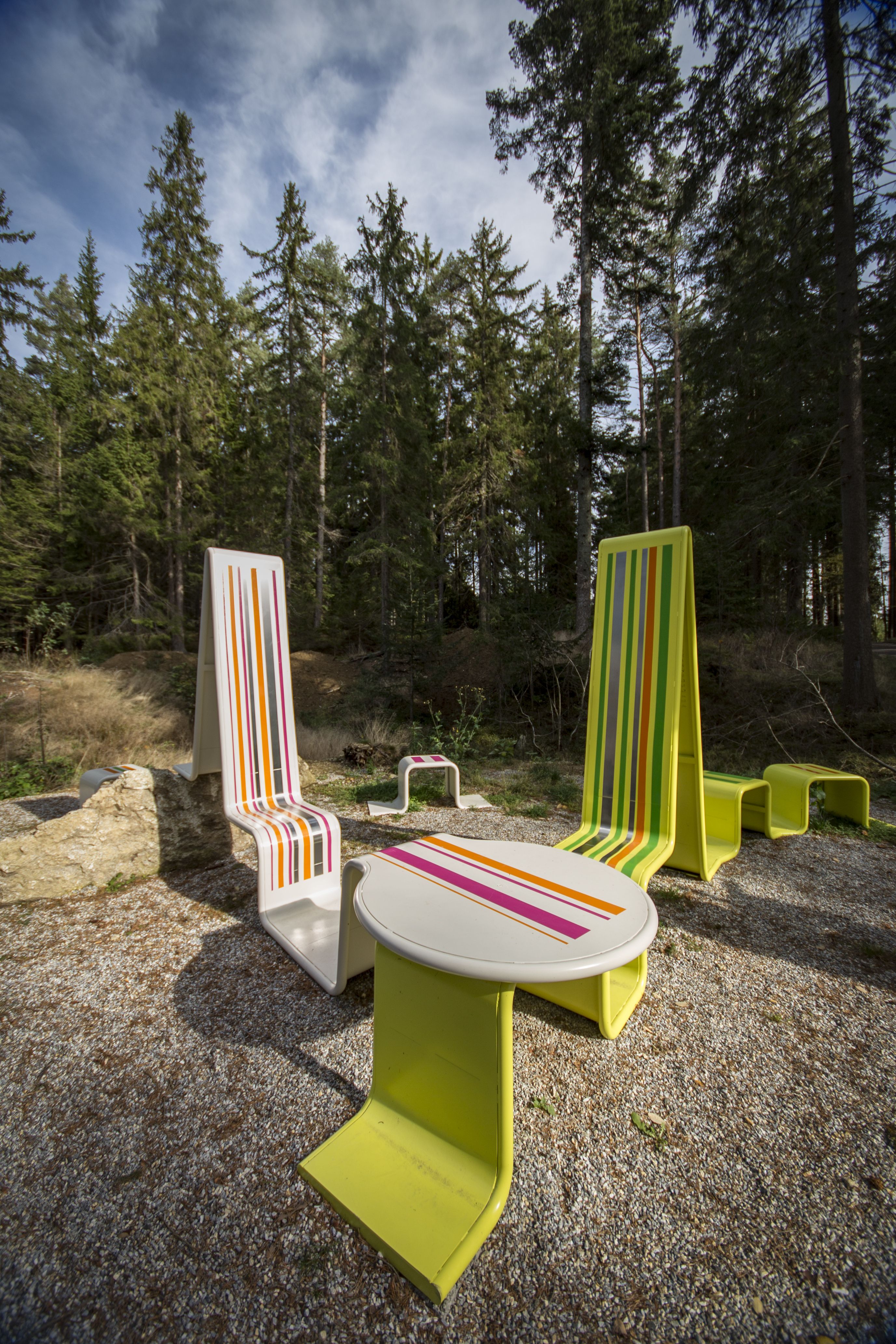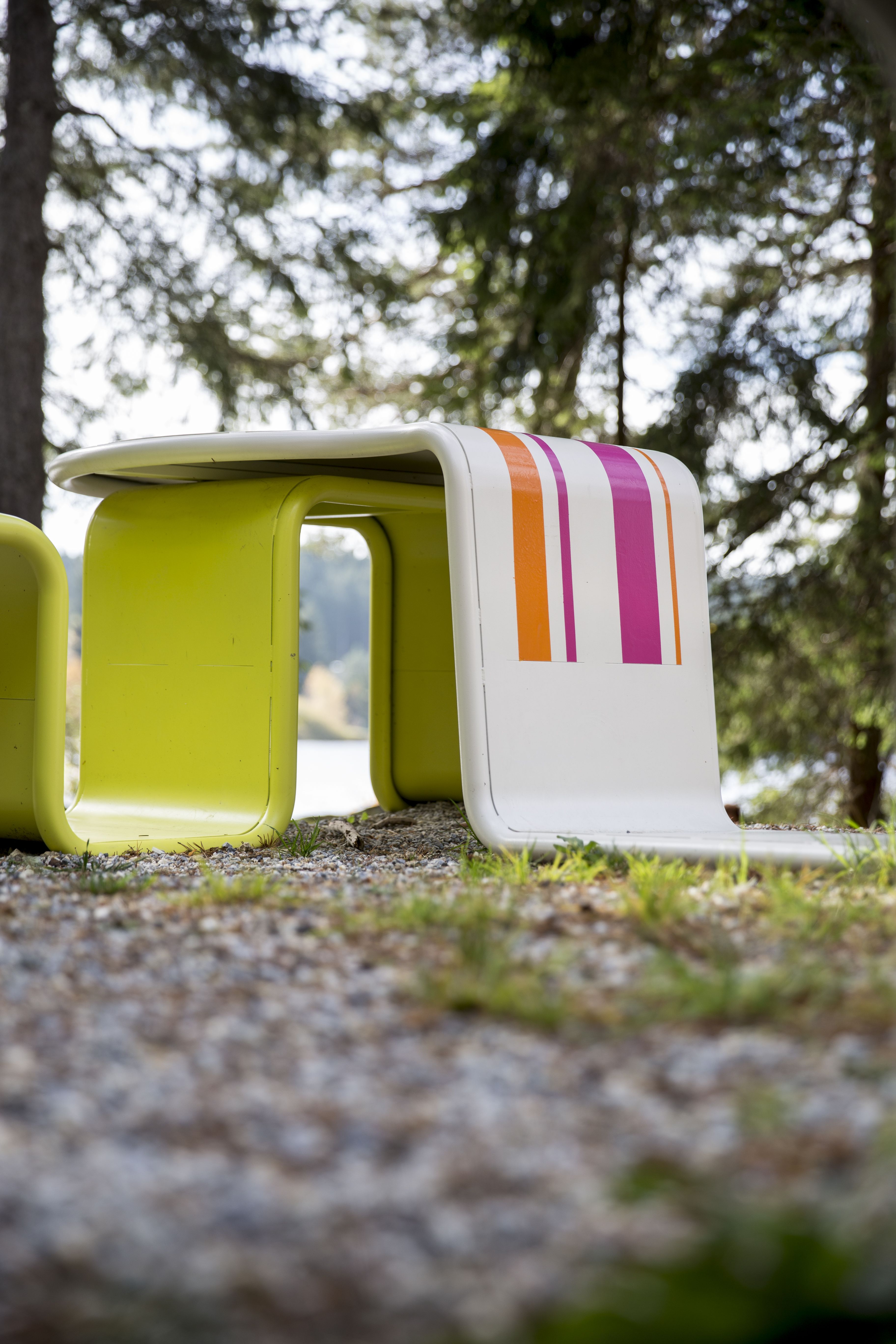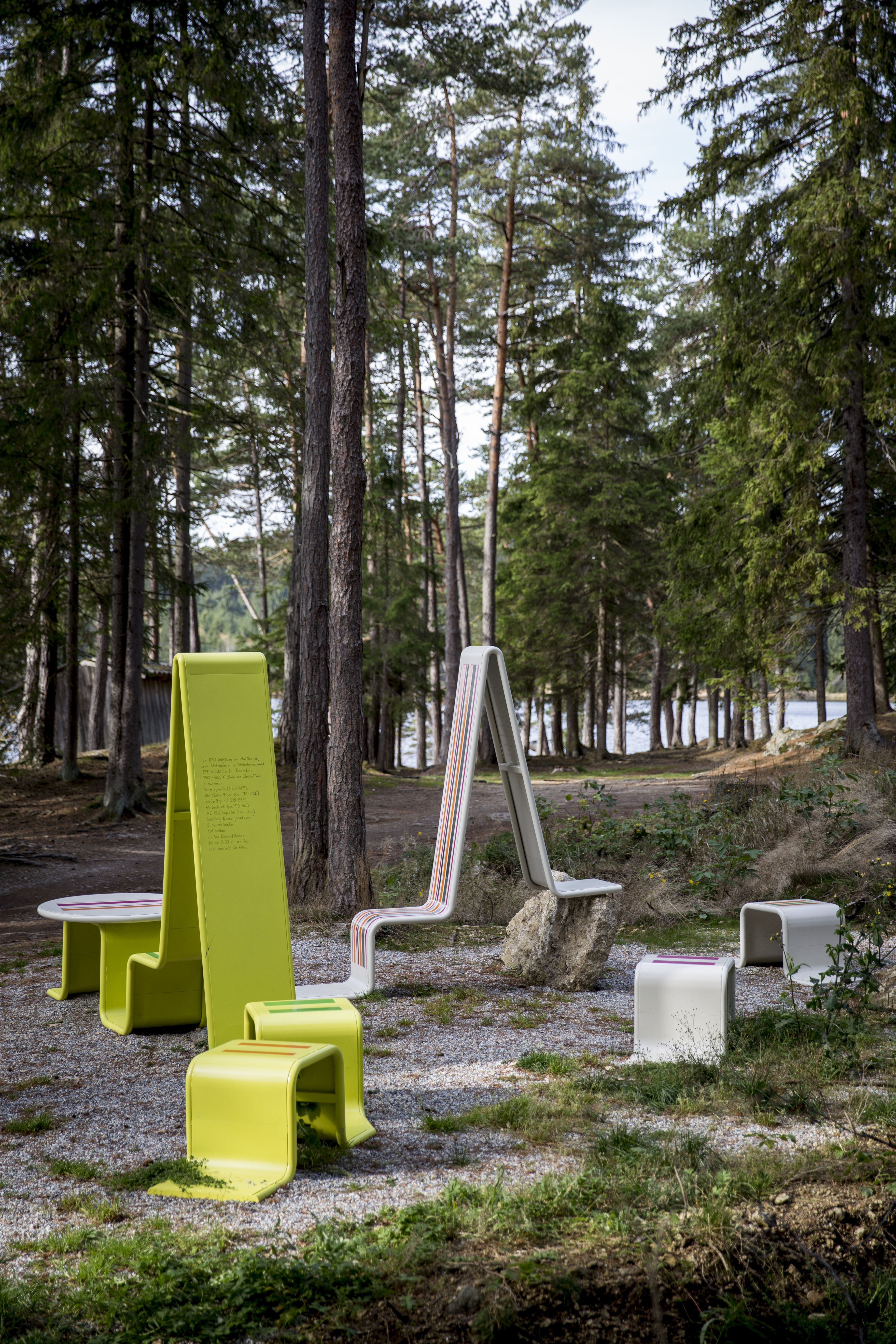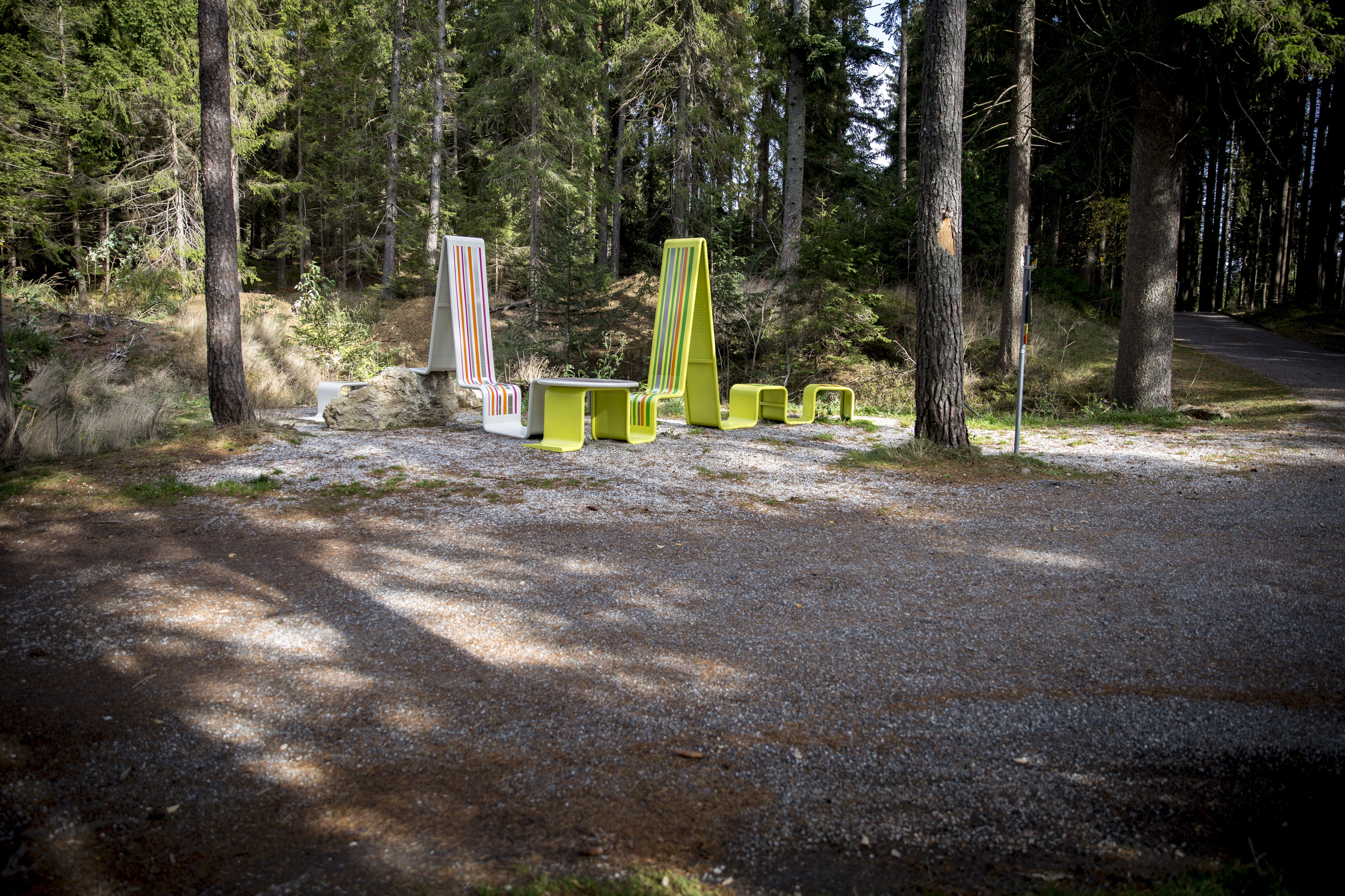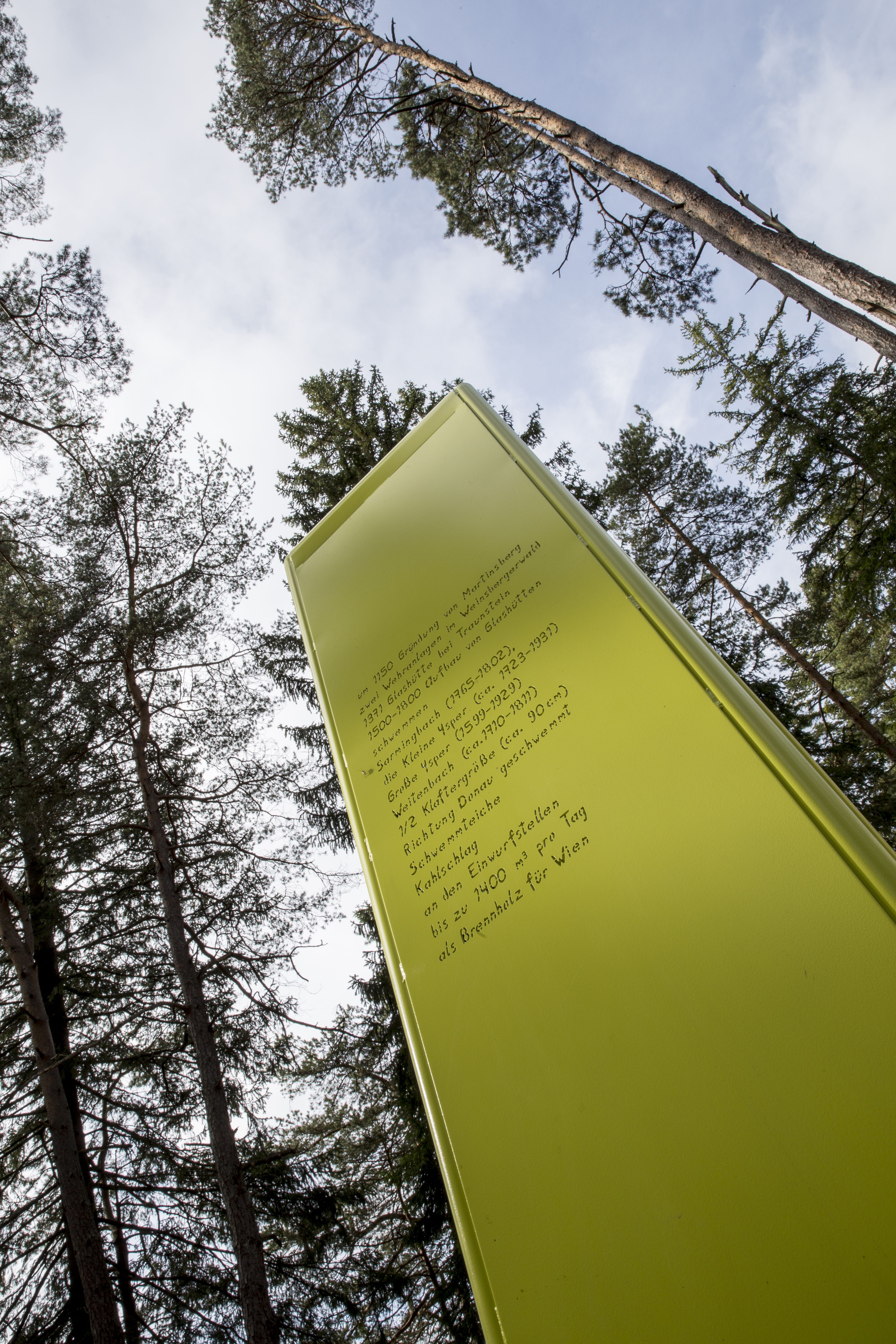 Der Ort, den die Künstlerinnen wählten, befindet sich im Wald mit direktem Blick auf den Edlesberger Teich unweit des Kreuzungspunktes der Wanderwege. Der Edlesberger Teich diente wie andere Teiche in der Umgebung vor allem im 18. Jahrhundert als Schwemmteich für Brennholz, das nach Wien transportiert wurde. Die Schwemmteiche legte man eigens dafür an, um genug Wasser für die Holztrift über die Ysper zur Verfügung zu haben. Die fließende Form des Objekts verweist auf die ursprüngliche Bedeutung von „schwemmen“, nämlich „schwimmen lassen“. Zwei gebogene Metallbahnen greifen formal die Wogen des Wassers auf und bilden am Kreuzungspunkt einen gemeinsamen Tisch und Sitzmöglichkeiten, die das Gegenüber zu Gesprächen anregen. Die kräftigen, lebendigen Farbstreifen, die die Skulptur prägen, erinnern einerseits an Markisenstoffe, wie sie früher auch für Gartenmöbel verwendet wurden. Andererseits verweisen sie auf Markierungen von Wanderwegen, für die diese Farbkombination so allerdings nicht genutzt wird. Erst bei näherer Betrachtung sieht man an den Metallbahnen ausgestanzte Texteinträge. Diese basieren auf Erzählungen von BewohnerInnen, die die Künstlerinnen beiläufig trafen, sowie auf der Recherche von historischen Fakten. Die Texte, die die BenutzerInnen im Sitzen lesen können, vermitteln allerdings nicht faktische Informationen, wie sie üblicherweise auf Informationstafeln angebracht werden. Vielmehr konzipierten Christine und Irene Hohenbüchler für „Schwemmen“ Texte, die fragmentarisch anmuten. Dieses spezielle literarische Format ist charakteristisch für ihren sehr eigenen Umgang mit Sprache, den die Künstlerinnen im Laufe ihrer langjährigen künstlerischen Arbeit für verschiedene Projekte entwickelt haben. Da die Texte sich dem Faktischen entziehen, offerieren sie Leerstellen für das eigene Nachfragen und sprechen das an, was womöglich fehlt – im persönlichen wie im kollektiven Bewusstsein. Damit eröffnen die Künstlerinnen einen Blick auf lokale Geschichte, die in Vergessenheit zu geraten droht, und rücken diese mit der mittlerweile historischen Praxis des Flößens in das aktuelle Bewusstsein. So wurde z. B. im Dezember 2014 die Flößerei als Kulturform in das Verzeichnis des immateriellen Kulturerbes in Deutschland aufgenommen. Ganz nebenbei erweitern Christine und Irene Hohenbüchler somit also eine Sitzskulptur zu einem „Denkmal“ für das Flößen. So wird das Zusammentreffen von zwei Wegen zu einer „Situation“, die im Sinne der langjährigen Praxis von Christine und Irene Hohenbüchler als Ort zur Aneignung und Reflexion zur Disposition gestellt wird.