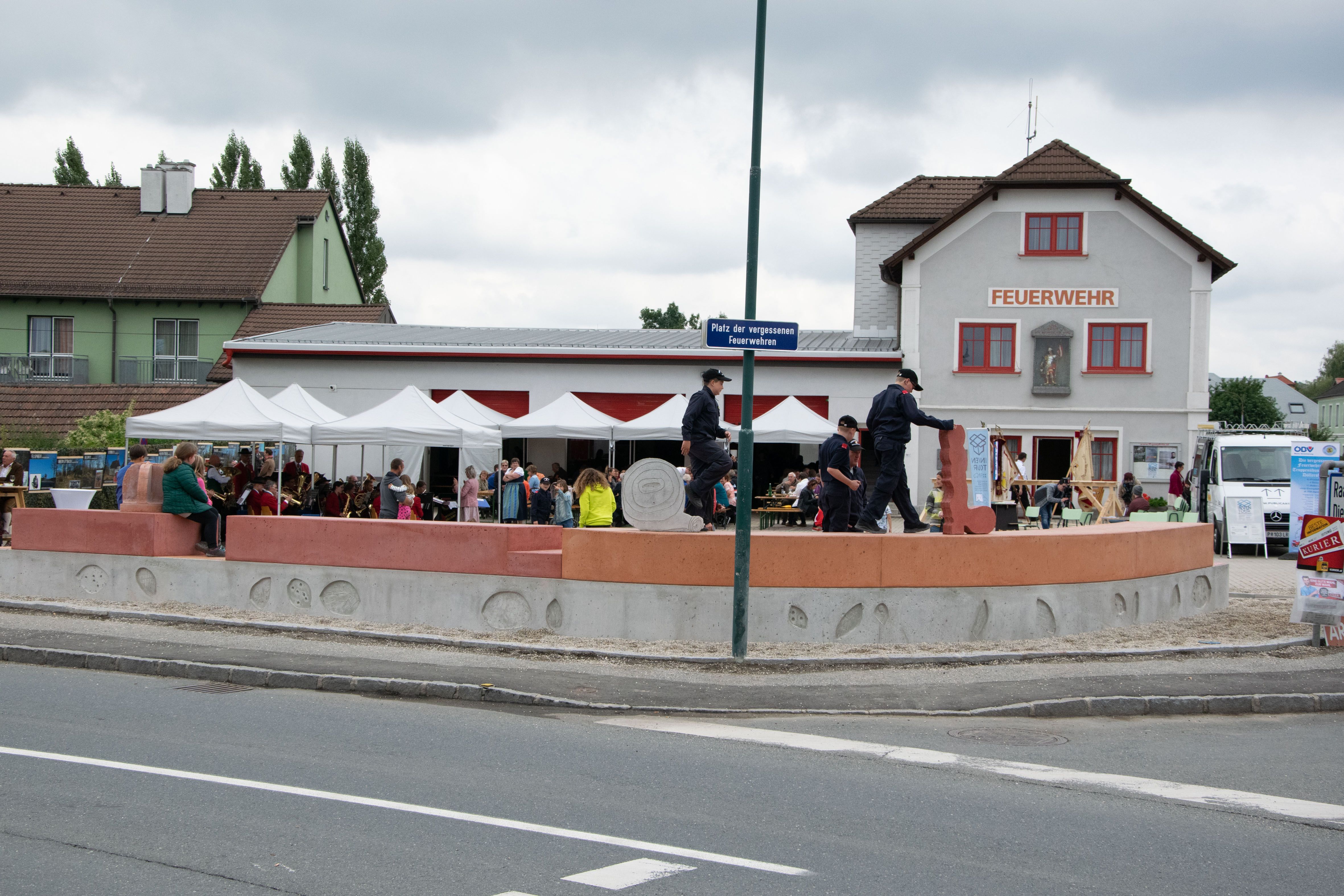 sich als Skulptur im heterogenen Umfeld des Platzes hervor. Auf den Flächen des Objektes, die zur Straße zeigen, sind Abdrücke unterschiedlicher Materialien zu sehen – Kies, Holz, Heu –, die einerseits auf die Einsatzgebiete der Feuerwehr und andererseits auf die Natur referieren, die das Gelände des Truppenübungsplatzes stellenweise wieder zurückerobert hat. Drei skulpturale Objekte auf der Tribüne, ebenfalls aus pigmentiertem Beton, sollen in ihrer abstrahierten Form auf „Insignien“ der Feuerwehr verweisen: Stiefel, Feuerwehrhelm und Wasserschlauch.