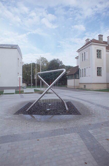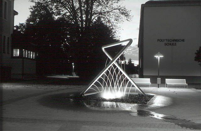 Das Zentrum des Schulhofes bildet ein raumgreifendes Brunnenobjekt aus rostfreiem Stahl. Die Form ergibt von jeder Seite ein völlig neues Erscheinungsbild von einem Triangel zu einem Quadrat bis zu einem X. Aus 20 Düsen tritt Wasser in verschiedenen Parabeln aus.