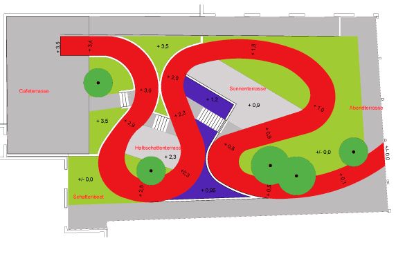 Der kleine Innenhof (600 m2) soll für PatientInnen und Personal ein attraktiver Aufenthaltsort sein. Da er tiefer als das Erdgeschoß liegt, muss ein Höhenunterschied von 3,5 m überbrückt werden. Daher entwarfen die ArchitektInnen eine lange Rampe, die sich als roter Teppich von der Terrasse der Cafeteria im Erdgeschoß in den Hof hinunterschwingt. Sie verbindet mehrere Plateaus, die sich durch ihre Aufenthaltsqualitäten, durch die Entfernung vom Ausgangspunkt voneinander unterscheiden. Die PatientInnen und BewohnerInnen können die Länge ihrer Spaziergänge selbst bestimmen, Schatten- oder Sonnenplätze aufsuchen, am Wasserbecken oder unter einem Baum sitzen, den Duft und den Anblick üppiger Sommerblumen oder frischer Minze genießen. Das Bepflanzungskonzept ist darauf abgestimmt, das ganze Jahr über für neue Attraktionen zu sorgen. Während die Plateaus mit ihren Sitzgelegenheiten Orte der Ruhe sind, soll die Rampe vielfältige Bewegungsmöglichkeiten schaffen und auch für therapeutische Zwecke verwendbar sein. Dazu ist ein Geländer als Handlauf vorgesehen, in dem Kugeln ein Stück weit gerollt werden können. Die Verknüpfung der Plateaus durch Stiegen garantiert die schnelle Erreichbarkeit und gibt den BewohnerInnen die Möglichkeit, zwischen unterschiedlich anspruchsvollen Spazierrouten zu wählen. Eine rote Rampe im kleinen Innenhof belebt als ästhetisch bestimmendes Element den Raum und hält die neu geschaffenen Aufenthaltsorte zusammen.