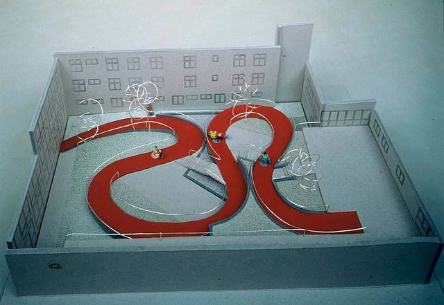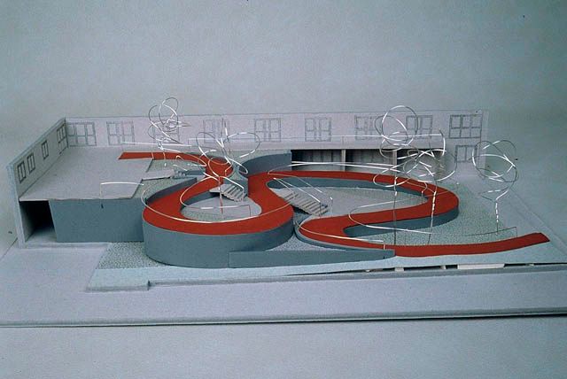 Da der kleine Innenhof 3,5 m tiefer als das Erdgeschoß lag, entwarfen die ArchitektInnen eine Rampe, die sich als roter Teppich von der Terrasse der Cafeteria im Erdgeschoß in den Hof hinunter schwingt und erarbeiteten ein vielschichtiges Bepflanzungskonzept. Der Entwurf wurde nicht realisiert.