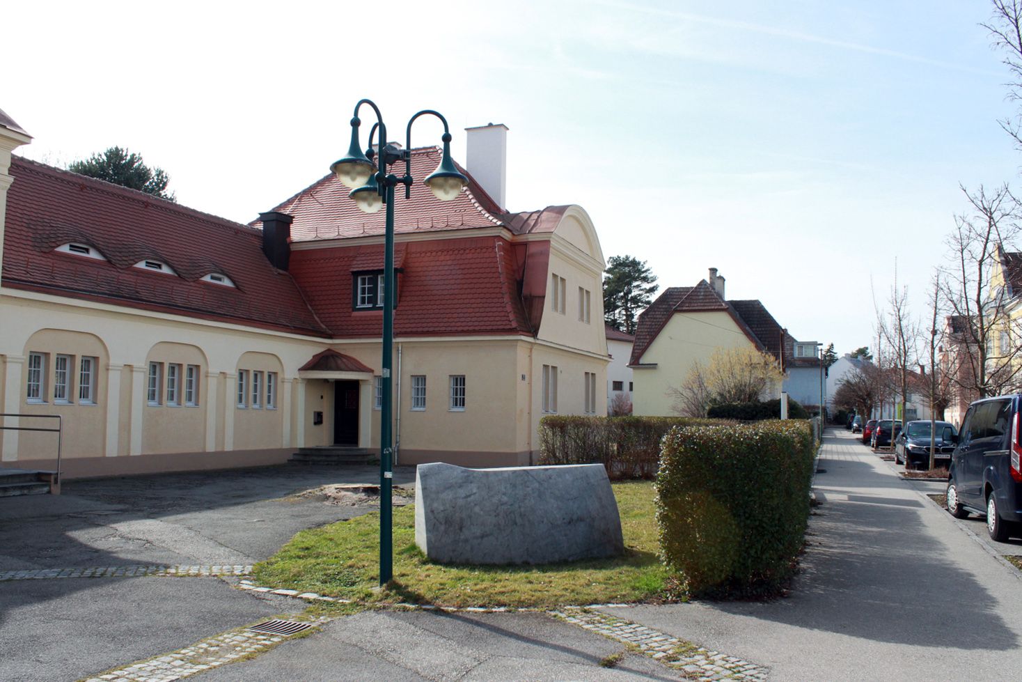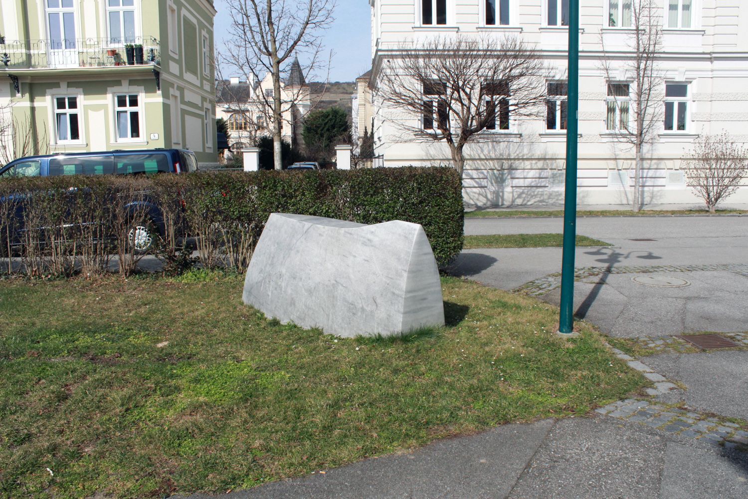 Im Werk von Alois Lindenbauer ist ein wesentlich prozessuales Elemet charakteristisch, das auf Beobachtung und Erforschung beruht. Er setzt Materialien zueinander in Beziehung und thematisiert Einflüsse und Wechselwirkungen. Eine wesentliche Werkgruppe sind seine "Sickerungen", die sich ebenfalls mit der Veränderung des Materials befassen und "einen Prozeß der Volumensveränderungen im direkten Kontakt eines flüssigen und festen Materials vorstellen und die vielschichtige Frage der möglichen Verbindungen bzw. Durchwachsungen formulieren..." (Peter Assmann). Seinen Steinskulpturen liegt eine Beschäftigung mit den Steinbauten megalithischer Kulturen im Mittelmeerraum, in Schweden und in Japan zugrunde. Oft entstehen wie hier in Krems einfache und doch markante Formationen, die eine Verbindung von archaischen Vorstellungen und Gegenwart darstellen und uralte Formen tradieren. Über seinen Brunnen am Marktplatz von Edlitz sagt der Künstler: "Eröffnen ein weites Spektrum wie Wasser unsere Gegend wie unser Leben formt. Lassen fast spielend Übergänge finden zwischen unterschiedlichen Raumdichten, zwischen Archaik und Jetzt, Alpen und Meer..." (Alois L. Lindenbauer).