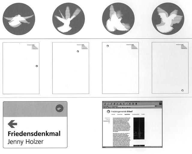 Dieter Auracher entwickelte ein grafisches Konzept mit Orientierungstafeln, Homepage und Briefpapier für die Gemeinde Erlauf, die den Beinamen "Friedensgemeinde" trägt. Als Logo wählte der Grafiker ein bekanntes Symbol: eine Taube, die jedoch immer wieder in einer anderen Flugposition auftritt.