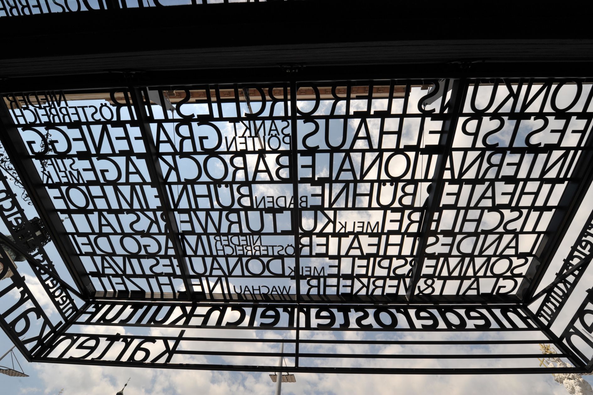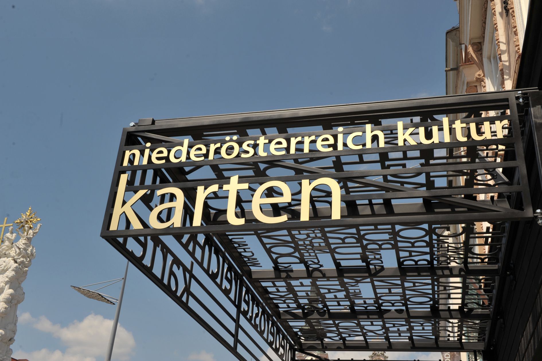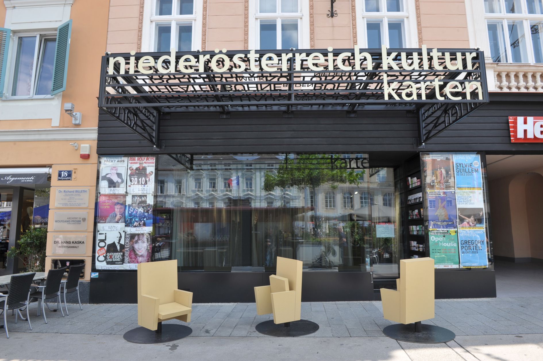 Durch die auf die Drehstühle aufgeklebten Plakate werden diese zu 'Litfaßsäulen' der Institutionen und Schicht für Schicht zu Erinnerungsträgern. Das Vordach – konzipiert als 'bewegliche Markise' – wird zum klaren Zeichen im Raum und wirft zarte Schatten der Namen niederösterreichischer Kulturinstitutionen auf den Platz. So wird das gesamte neue Ensemble zur Bühne des Alltags, auf welcher man fließend zwischen der Rolle des Zuschauers und des Akteurs wechseln kann." (feld72)