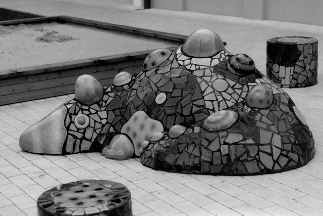Die Außenseite der Objekte ist mit Bruchkeramik verfließt, an den Bruchstellen glasiert. Die Bruchkeramikteile sollen den schuppigen Charakter darstellen. Der kleine Drache "Wurli" ist zum Umarmen, Reiten und Rutschen, wie eine haptische Skulptur der Gemütlichkeit mit den Sitzobjekten rundherum, ein Raum der Märchenwelt, der zum Träumen anregt. Der Künstler hat seine Arbeit dem Kinderpsychologen Bruno Bettelheim gewidmet.