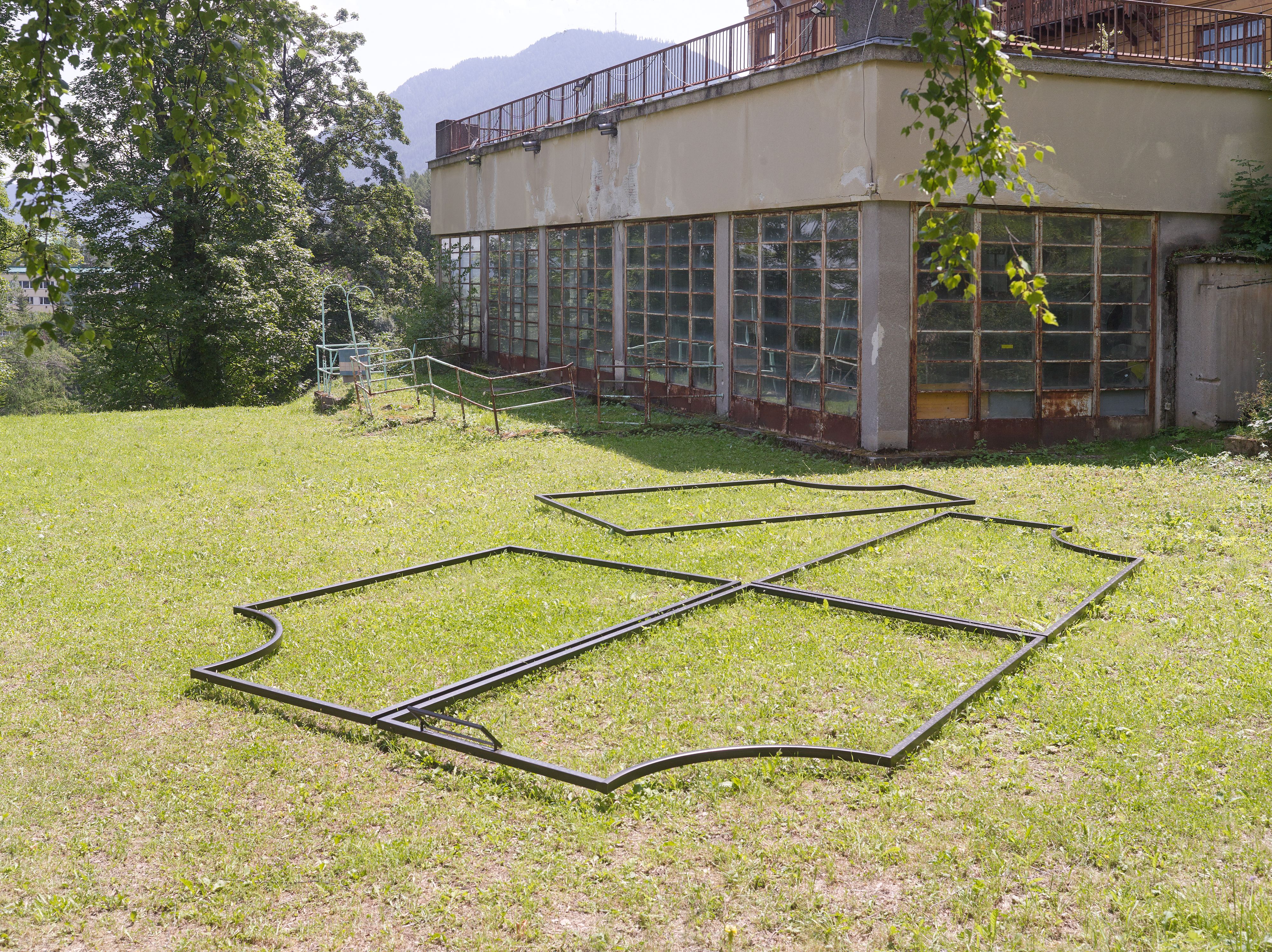 Ein Schlagschatten liegt auf einer Wiesenfläche auf der talseitigen Terrasse des Südbahnhotels. An dieser Stelle stützen Reste einer ehemaligen Mauer einen parkähnlich gepflanzten Abhang. Inge Vavra platziert auf dieser Fläche die Arbeit Schlagschatten, eine Konstruktion aus Vierkanteisen, angelehnt an historische Gartenlabyrinthe und die Grundfesten barocker Gebäude. Die Mauer wird hier zu einer Kulisse. Als Zitat geformt, zeigt sich die historische Differenz durch das fremde Material. Ein Spiegel wird an der Grundkonstruktion angebracht und reflektiert so das Umliegende anekdotisch. Im Hintergrund die Hotelfassade in sanftem Gelb. Der Standpunkt des Blickes formt das Bild, ob oben oder unten, die Konstanten beginnen zu kippen, wechseln den Ort. Neue Räume formen sich im Gras, der Himmel liegt unter den Füßen, die Umgebung löst sich von seinen Ursprüngen.