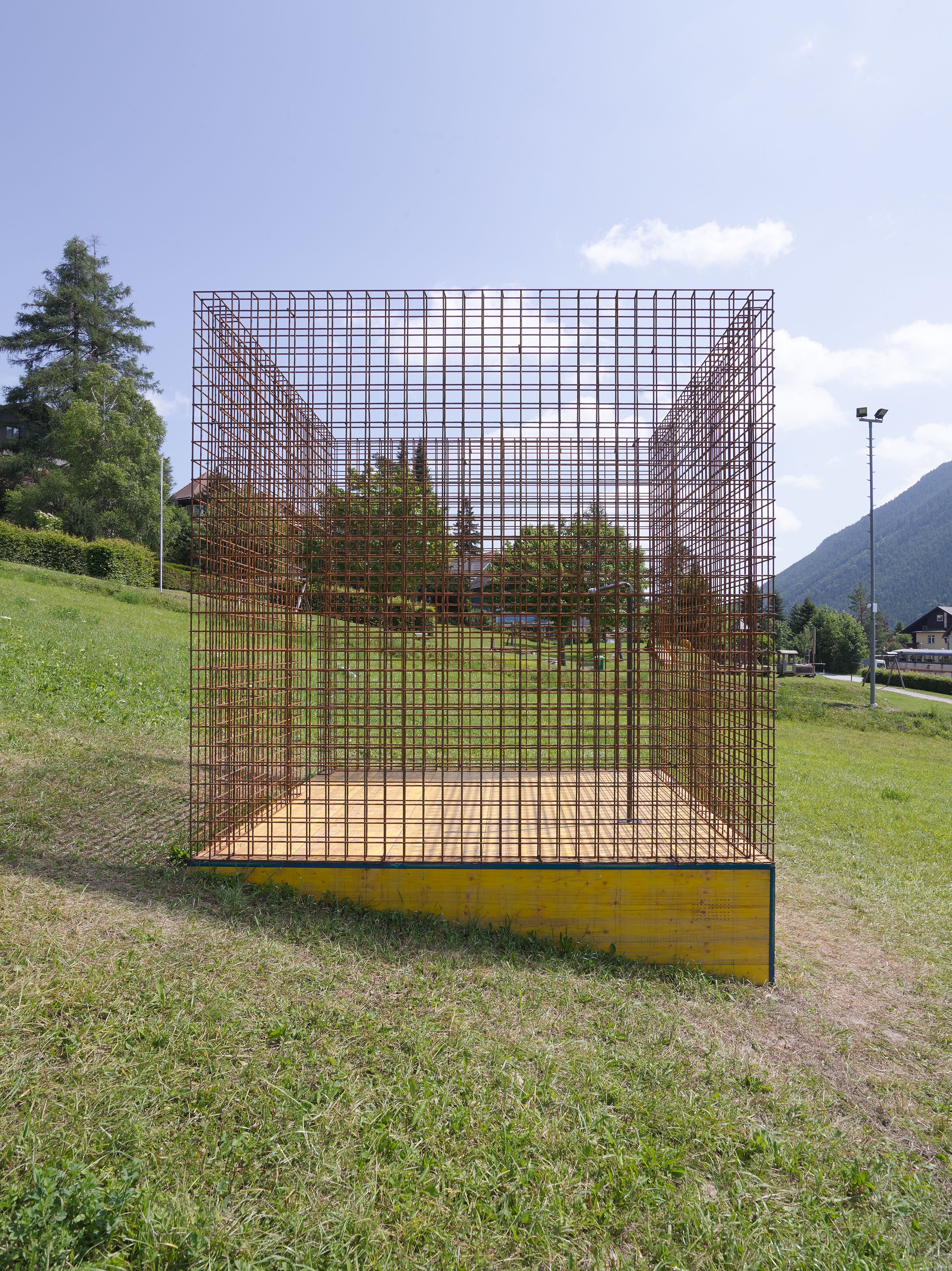 Das Landhaus Khuner im Semmering-Rax-Gebiet ist eine Ausnahme. Als eine der letzten Arbeiten Adolf Loos´ hebt sich das Bauwerk sichtbar von seinem architektonischen Umfeld ab. Loos bahnbrechendes Konzept des »Raumplans«, das Denken in Räumen und Kuben und nicht in Plänen, wurde im Looshaus verwirklicht. Hannes Zebedin verknüpft in seiner Installation am legendären alpinen Golfplatz die Moderne mit den traditionellen Formen. Ein Ausschnitt der Fassade der Villa wurde nachgebaut, wie eine Art Schutzwall steht diese nun im Hang. Das bei Loos gefundene Fensterladensystem reguliert durch seine Bewegung »Ströme«, öffnet und schließt sich wie eine Schleuse. Die industrialisierte Landwirtschaft hat mittlerweile auch alpine bäuerliche Formen der Arbeit zum Verschwinden gebracht. Zebedin erinnert sich ihrer und verwendet eine Formation der vergessenen Heumännchen und Schwedenreitern in strahlenförmiger Anordnung für seine Installation.