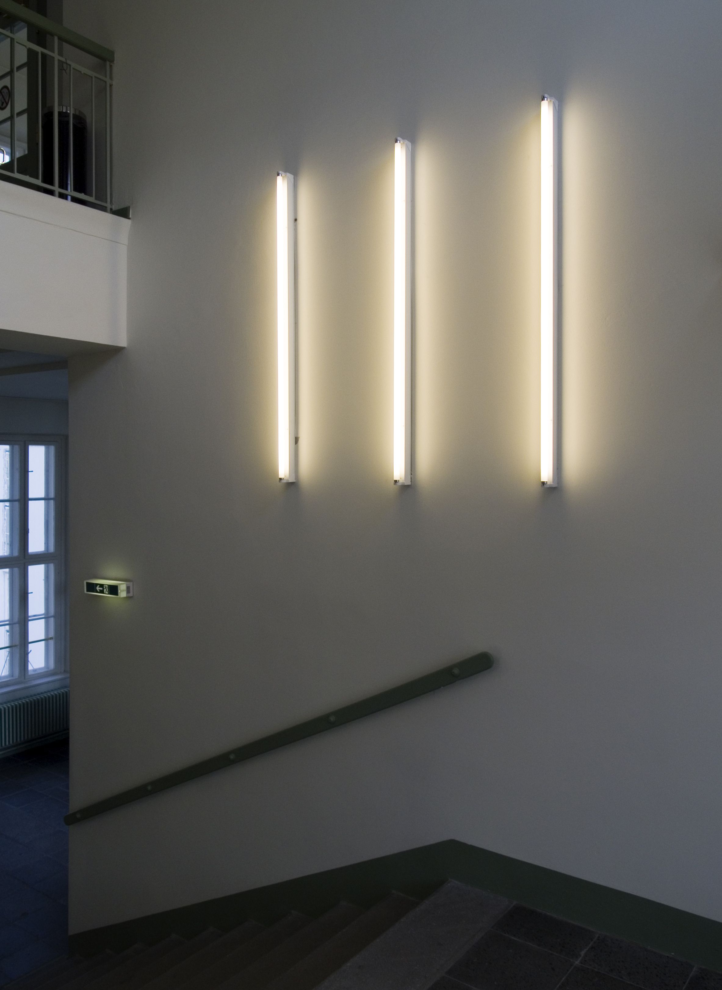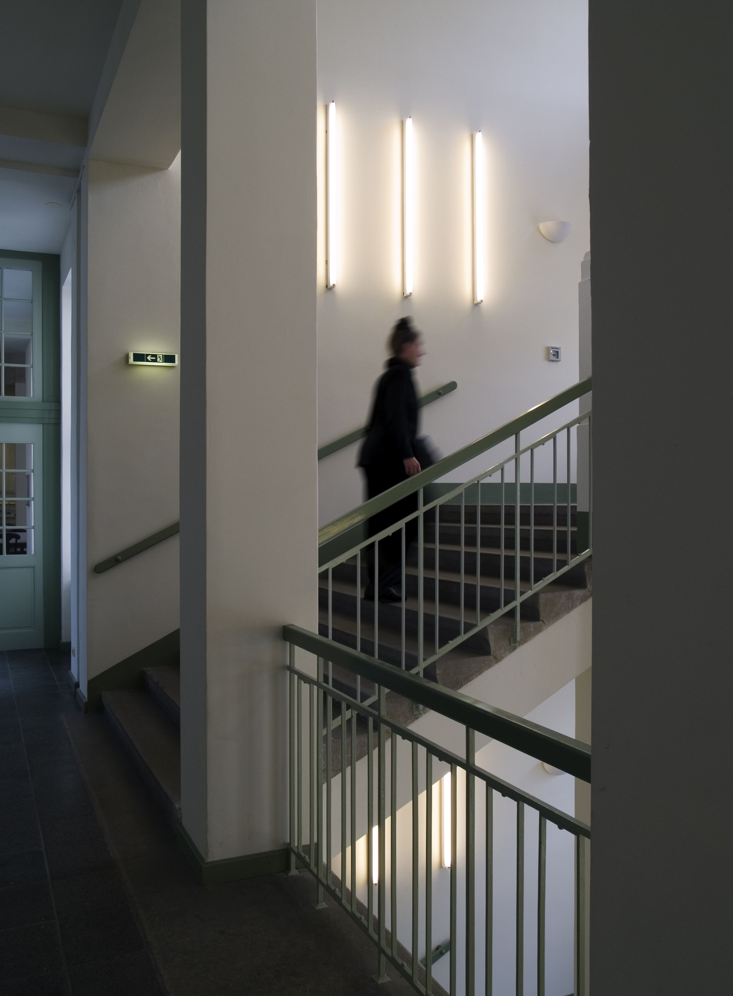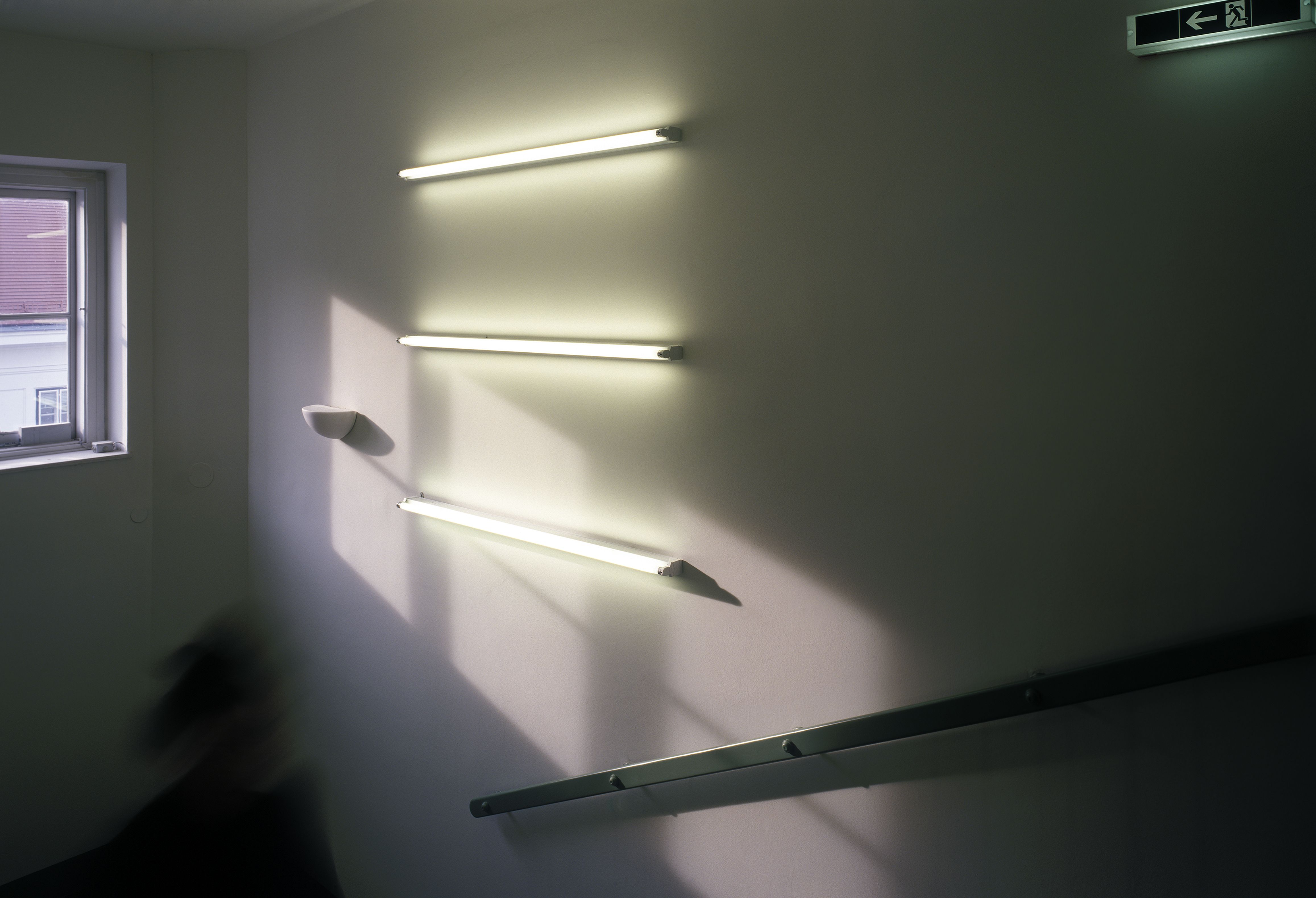 Mit einer steigenden Anzahl von Leuchtröhren pro Stockwerk entsteht ein Ordnungssystem und gleichzeitig ein jeweils anderes minimalistisches "Lichtbild" an der Wand. Die waagrechte Montage der Leuchten steht für die Ebene, die senkrechte für die Verbindungsfunktion der Stiege zwischen zwei Ebenen.