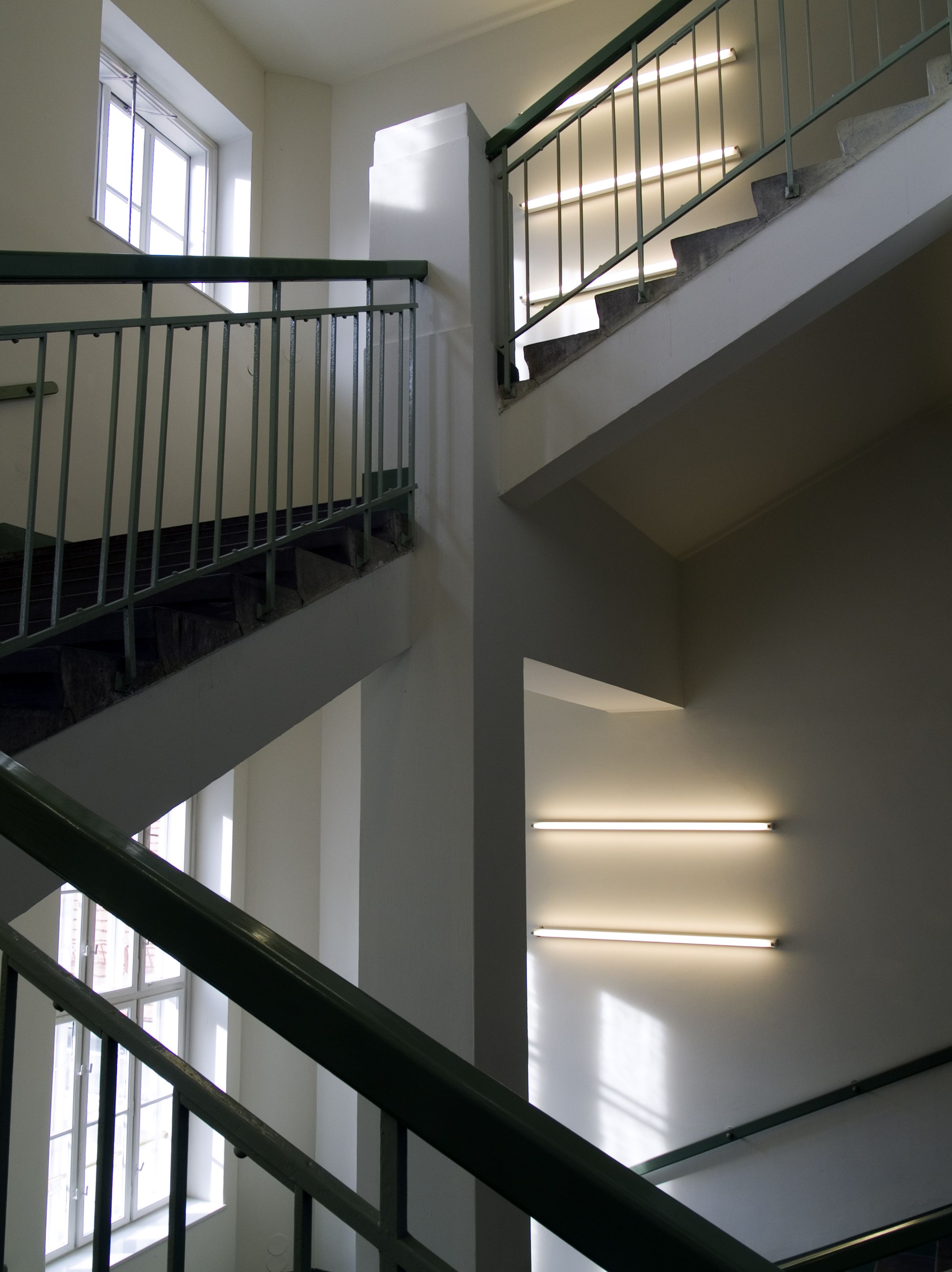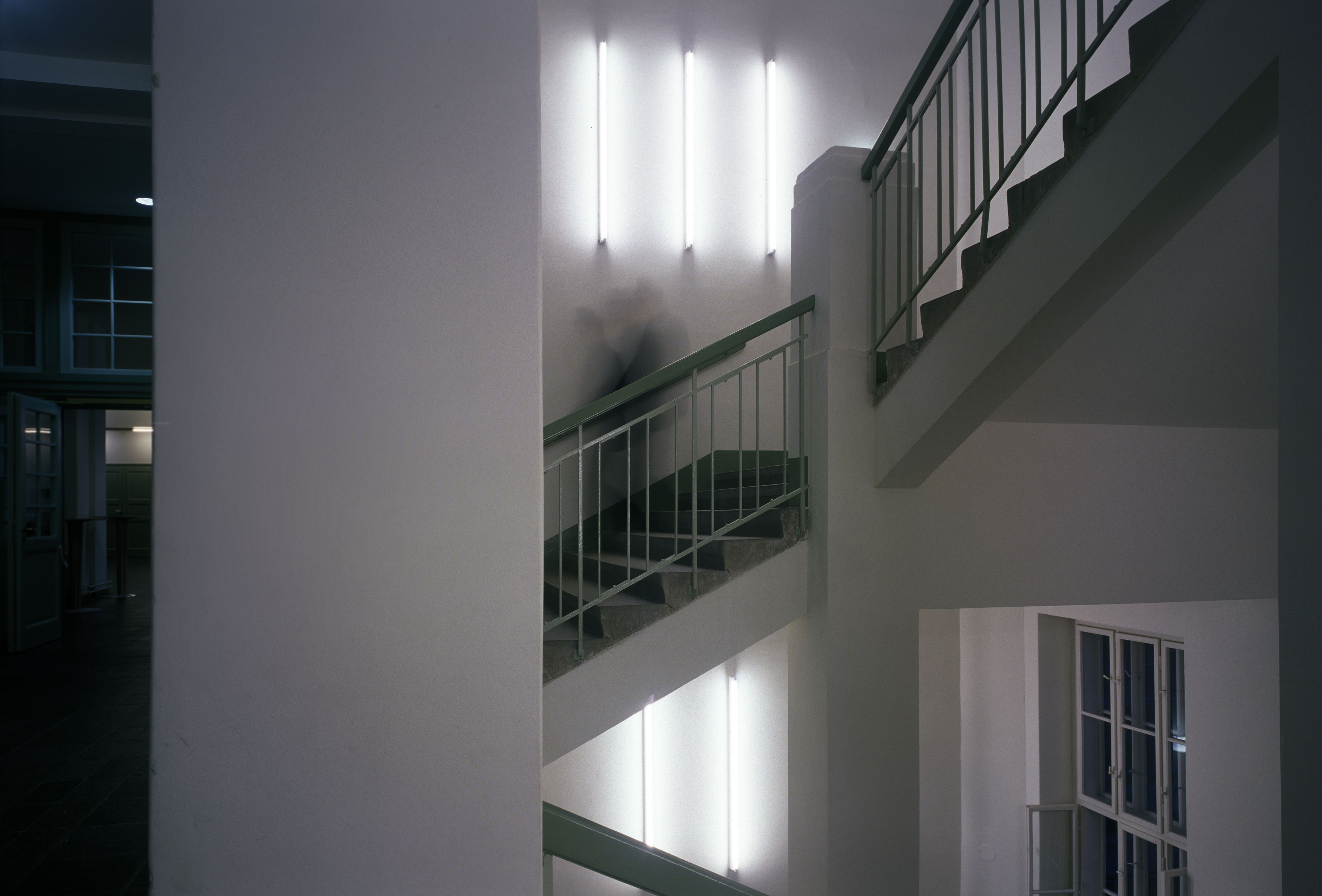 "Lichtinstallation" nennt lapidar und doch so konkret einer der bedeutendsten europäischen Vertreter der sogenannten "Konkreten Kunst", Heinz Gappmayr, seine Arbeit für ein Stiegenhaus in der Donau-Universität Krems. Dabei war er mit genauen Vorgaben konfrontiert: Es ging um einen konkreten Ort, ein Stiegenhaus, und um die damit verbundenen funktionalen Notwendigkeiten – so musste etwa auch das Problem der Beleuchtung im Zuge der künstlerischen Arbeit gelöst werden. Gappmayr reagierte in verschiedener Hinsicht auf die architektonischen Rahmenbedingungen, vom Aspekt eines Industriebaues (ehemalige Tabakfabrik) bis hin zur Architektur des Stiegenhauses. In mathematisch-logischer Weise verband er die Aufgabe der Beleuchtung mit der Symbolik der Stiege. Industrieleuchten fungieren als "objets trouvés": Im ersten Stock sind jeweils eine vertikale und eine horizontale Leuchtröhre montiert, im zweiten Stock sind es zwei vertikale und zwei horizontale und im dritten Stock drei, wobei die letzten drei zusammen auf Grund ihrer Platzierung die Form eines Quadrats und damit eine geometrische Architekturgrundform ergeben. Die waagrechte Montage der Leuchten signalisiert die Ebene eines Stockwerks, die senkrechte die Verbindungsfunktion der Stiege zwischen zwei Ebenen. Mit jeder Etage wird auch mehr Licht installiert, was wiederum auf die Symbolik des Ortes verweist: die Universität als Institution des Wissens, Licht als anthropologische Metapher für (universelle) Erkenntnis. Mit minimalen Mitteln gelingt es dem Künstler, in eindrucksvoller Weise den Ort künstlerisch zu konkretisieren und damit zu transzendieren: das Stiegenhaus als Lebenssymbol.