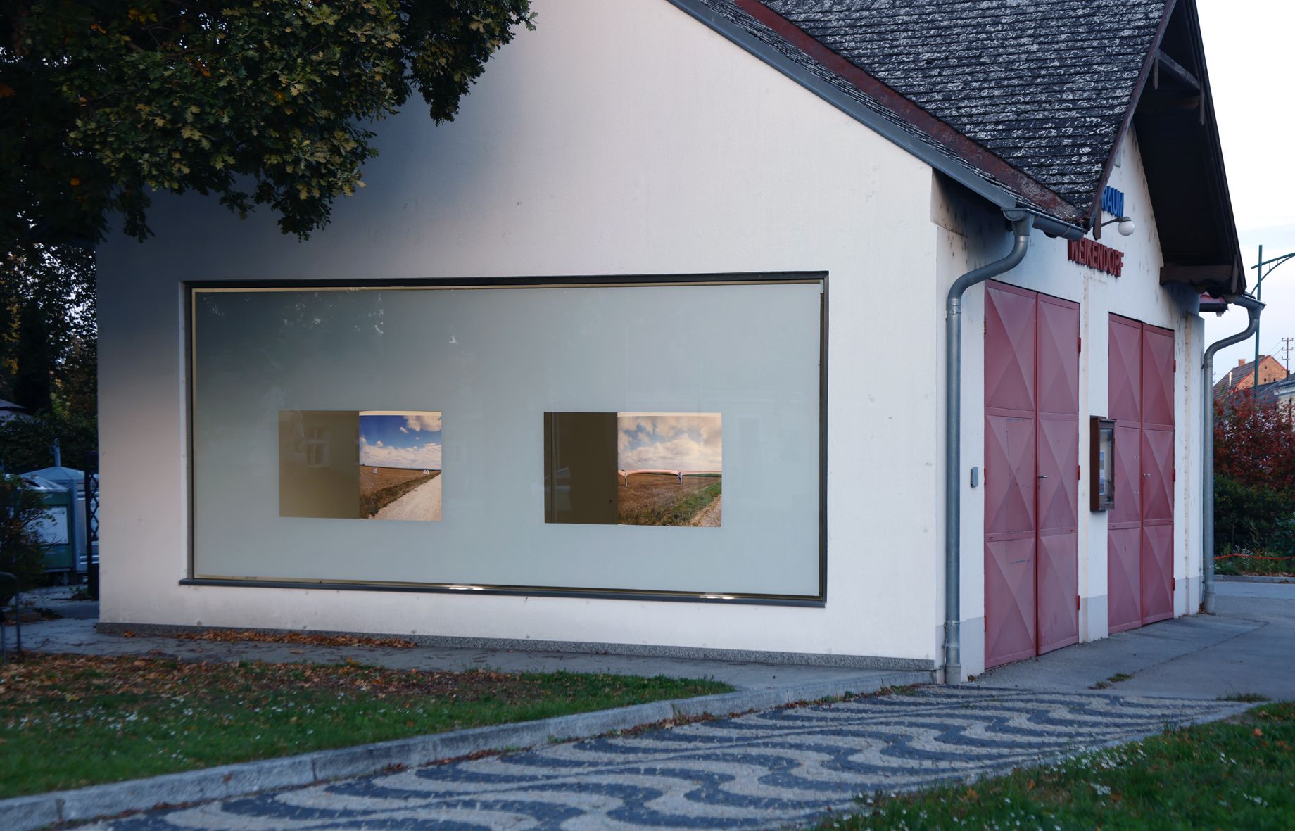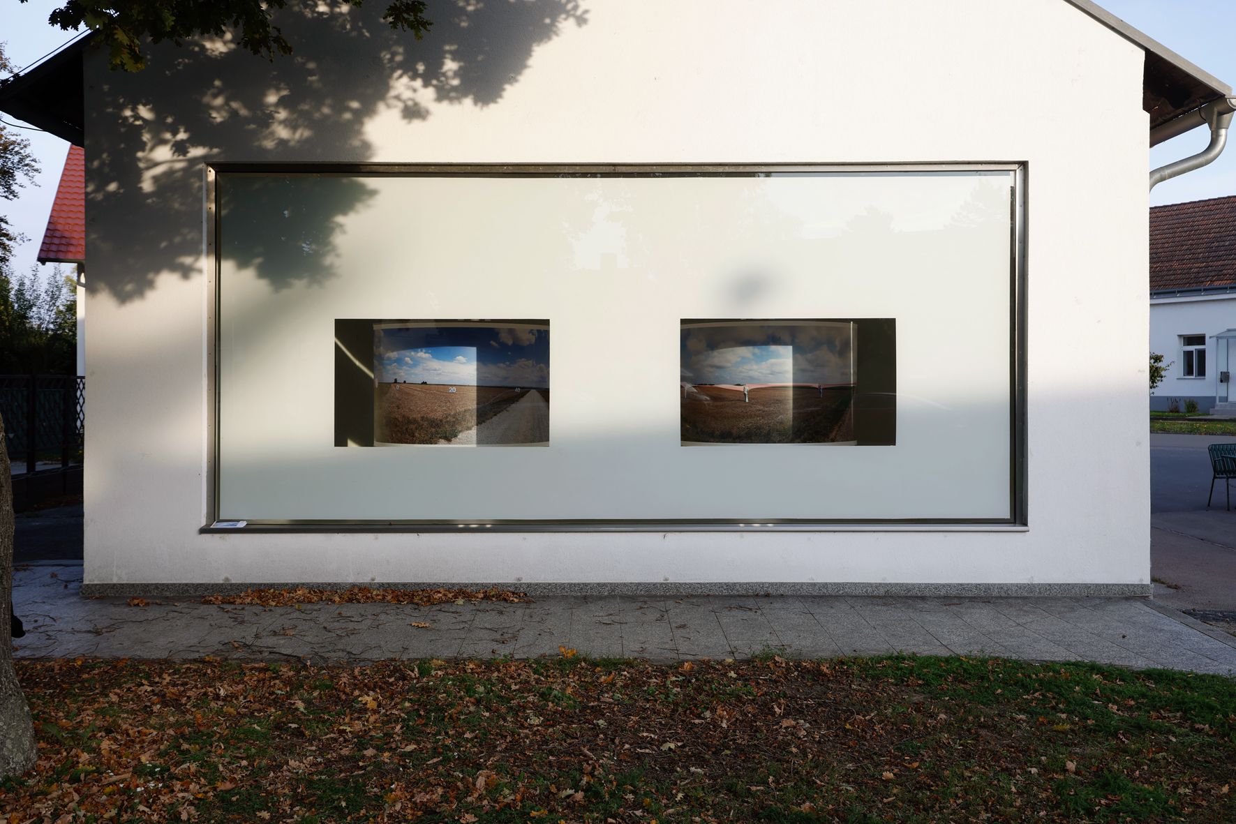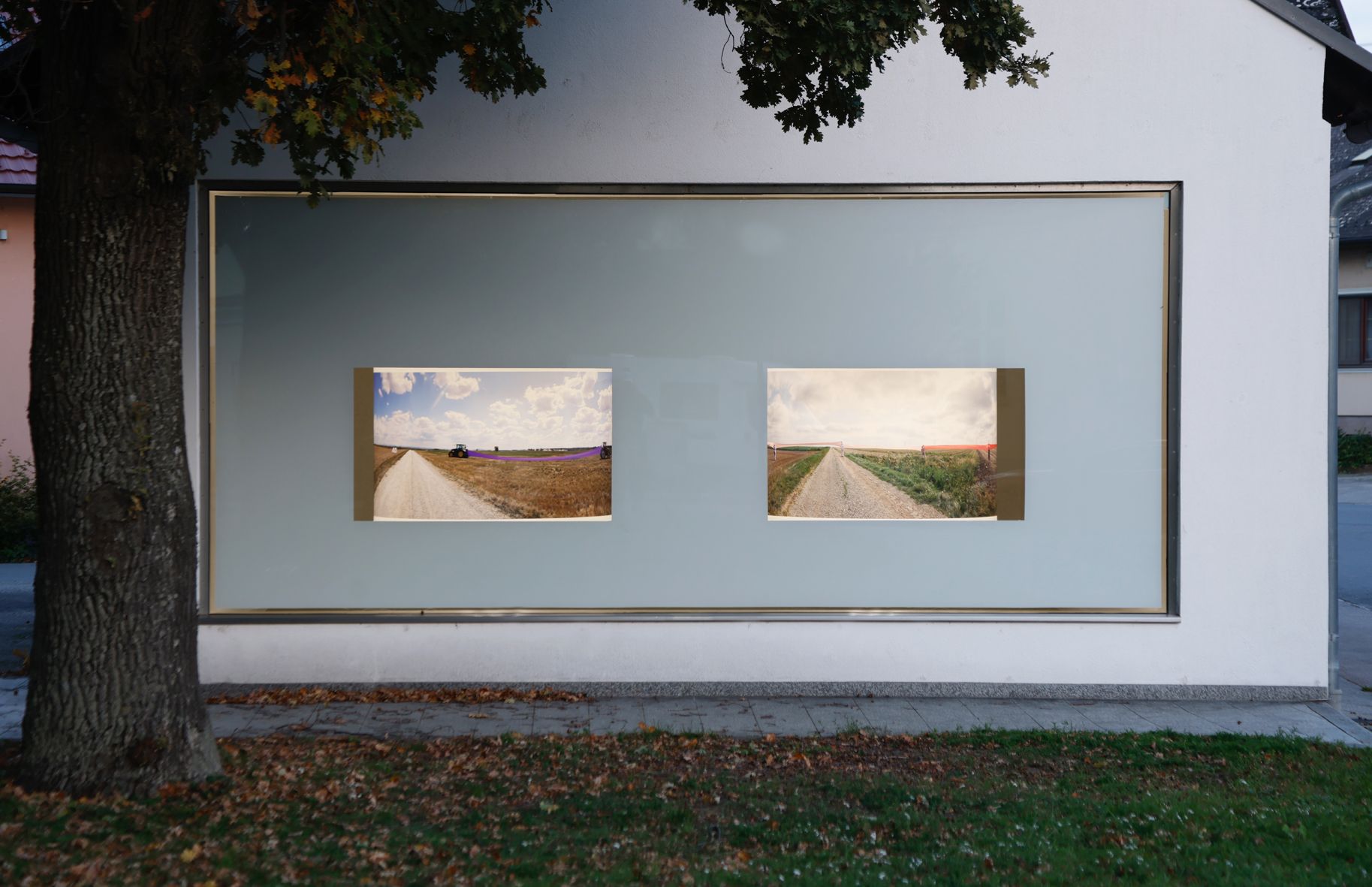 Der Titel peripheria ist von der mathematischen Größe Pi (π) abgeleitet und bezeichnet hier mehreres: die Kreislinie genauso wie die kreisförmige Bewegung. Darüber hinaus ist die "Peripherie" als der abseits vom Zentrum befindliche Raum zu verstehen. Die Verbindung dieser Bedeutgunsebenen - der Kreislinie, der Bewegung und der Randfläche - fasst die zentralen Faktoren von Markus Guschelbauers Installation im Kunstraum zusammen. Zwei fensterartige Öffnungen im großen Schaufenster geben Einblick auf zwei sich um ihre Achse drehende Panorama-Fotografien, die Inszenierungen des Künstlers auf den Feldern um Weikendorf herum mit Unterstützung der örtlichen Bevölkerung zeigen. Stoffbahnen oder Tafeln, die Maßeinheiten angeben, tauchen durch die Drehung der Bildsäulen auf und verschwinden wieder. Die Bewegung gibt somit nie das gesamte Bild, sondern immer nur einen Ausschnitt preis. der "Kreislauf" der Fotografien erzeugt gleichzeitig ein buchstäblich bewegtes Bild, einen kurzen Ablauf, der durch die Beleuchtung von innen noch verstärkt wird.