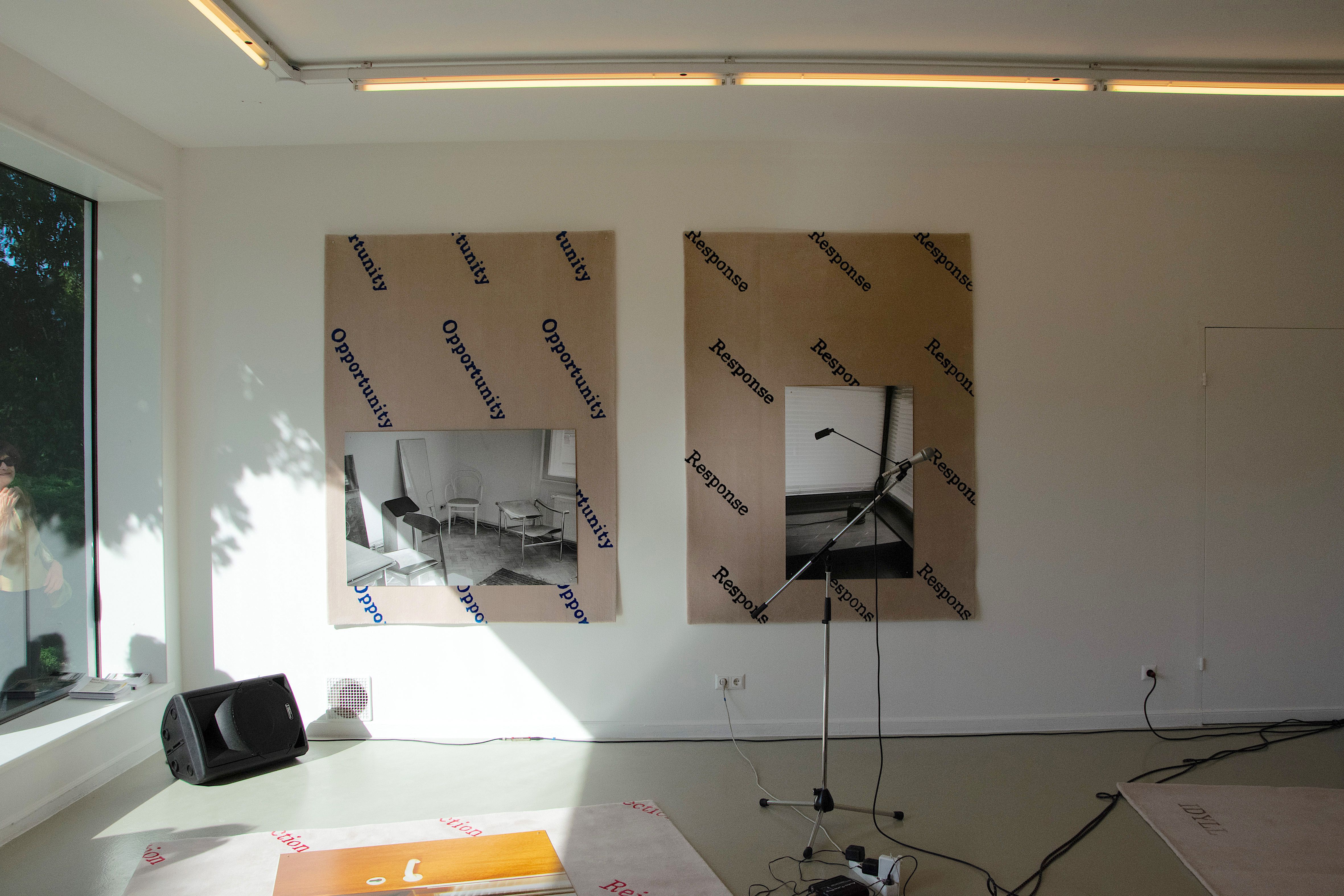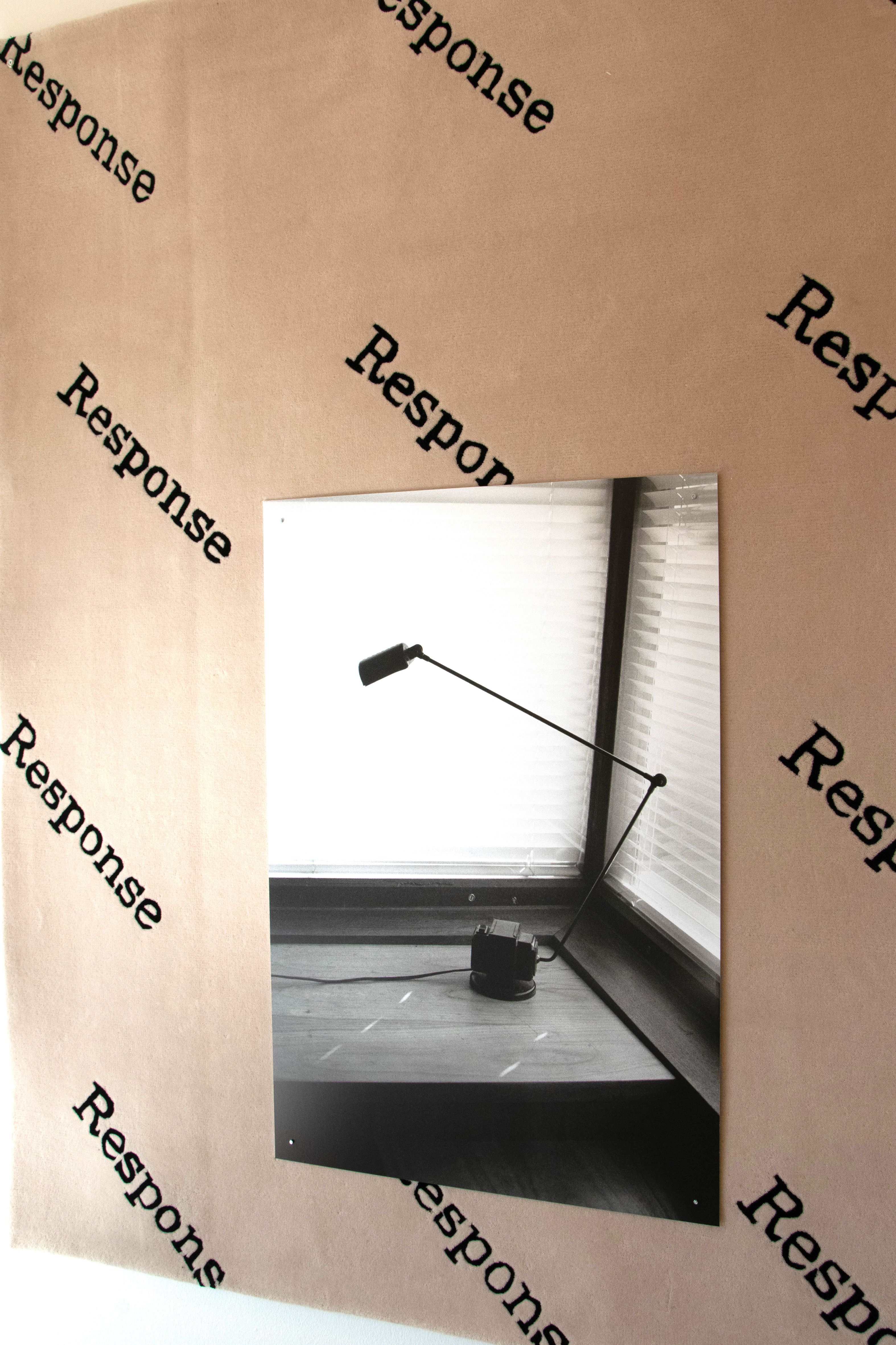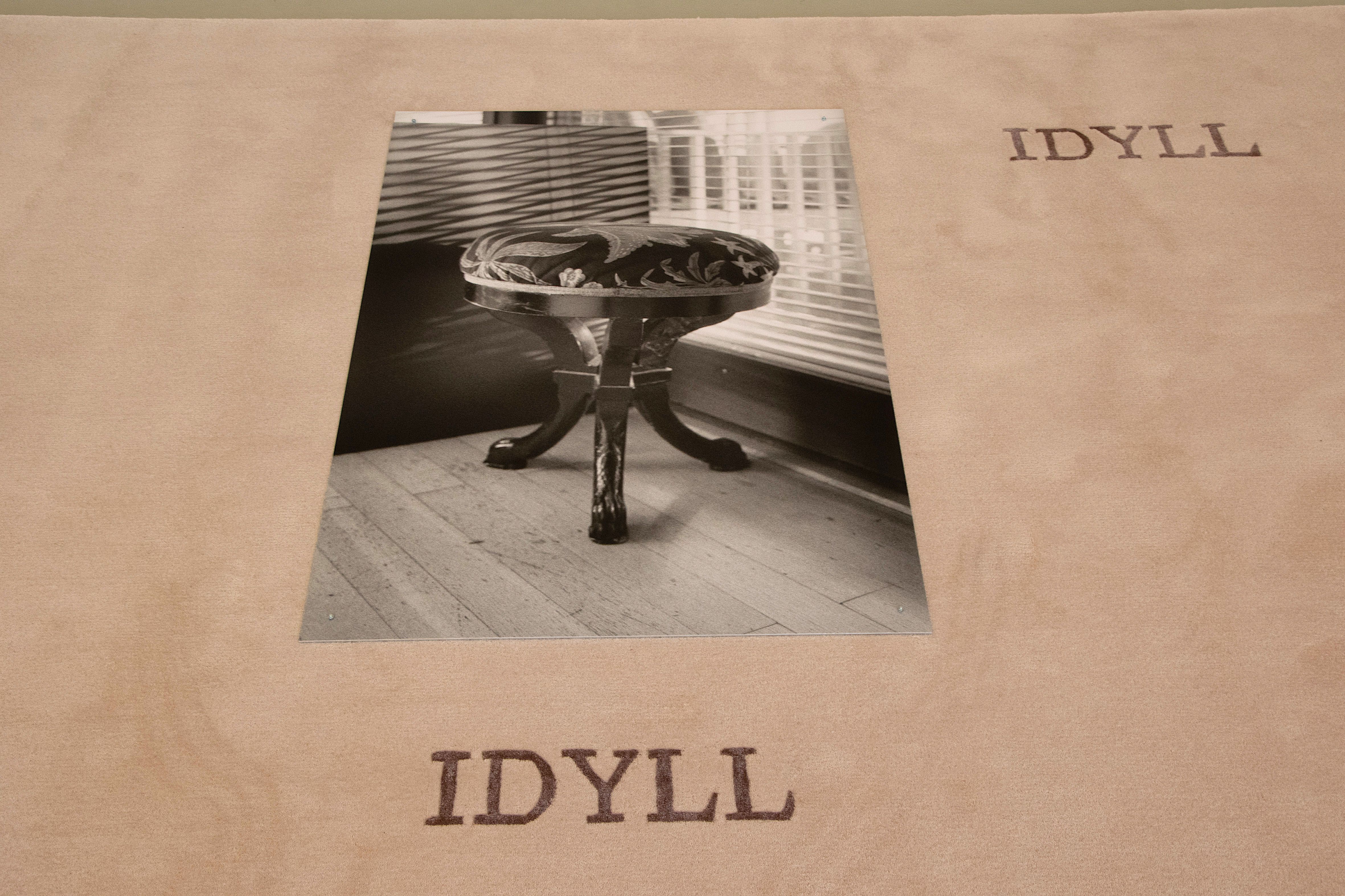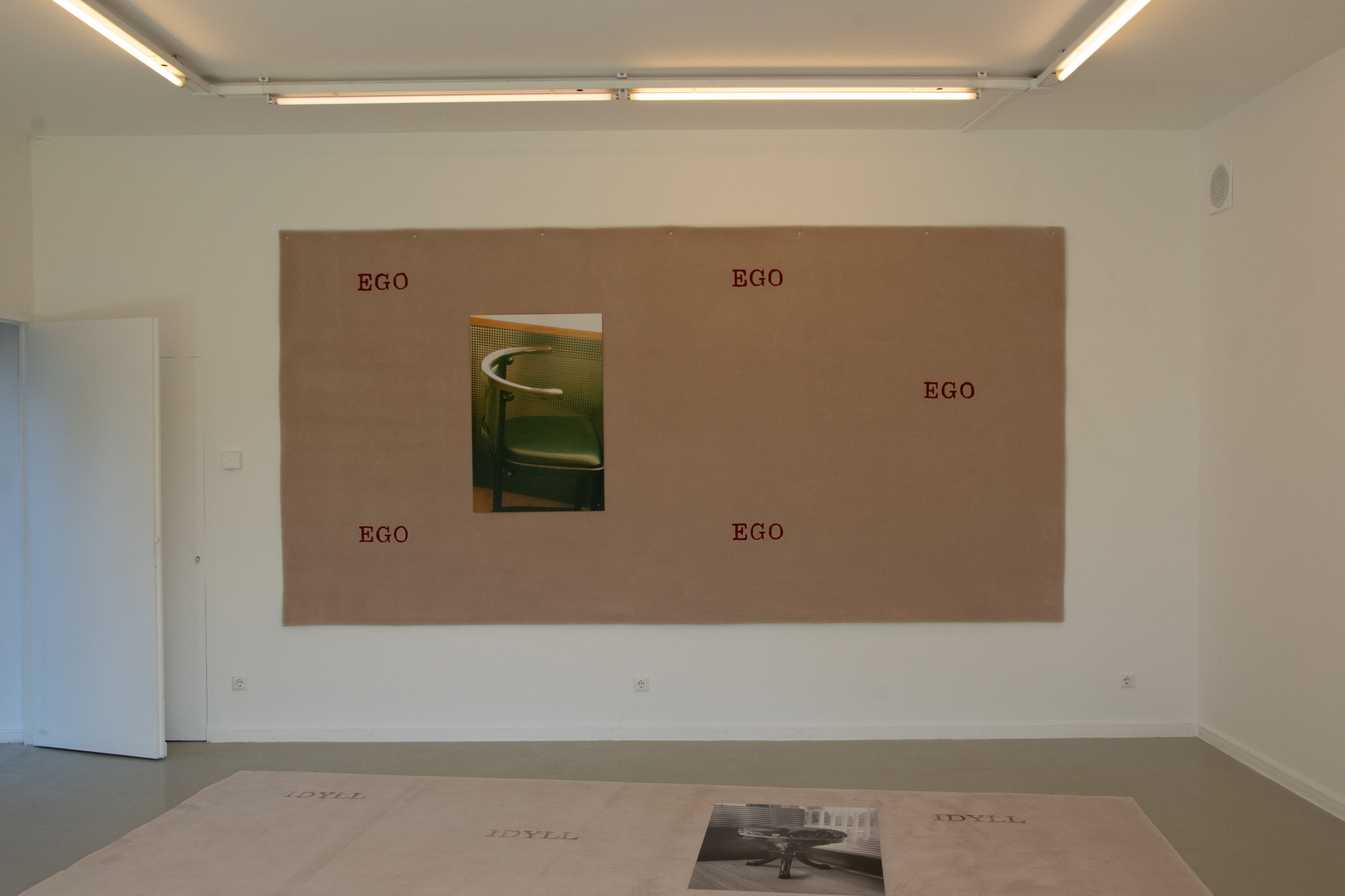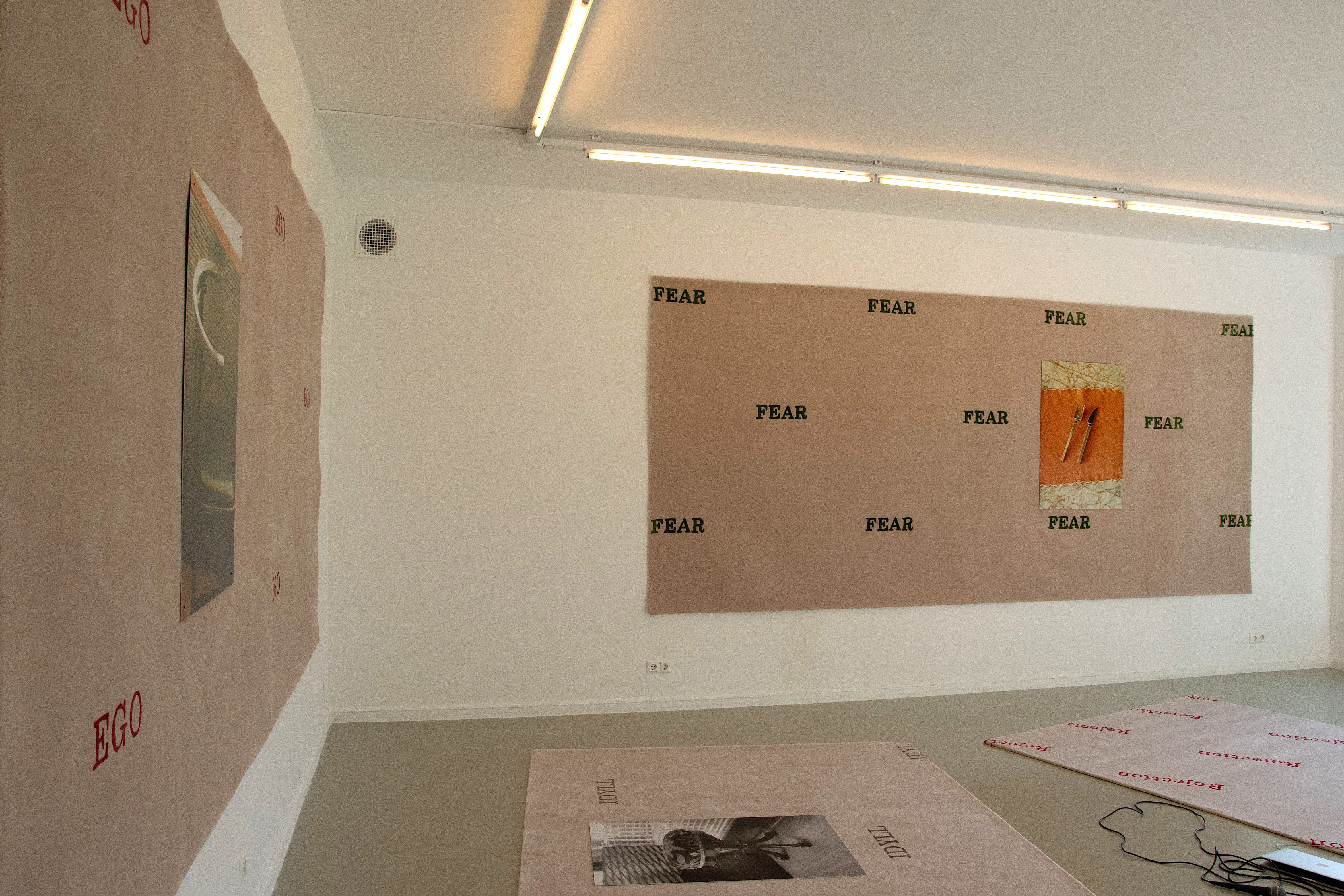 In dieser Ausstellung nehmen die Formate der Teppiche die Dimensionen des Raumes auf, spiegeln die Verhältnisse wider, werden zum Bodenläufer oder bekleiden (1) an Tapisserien erinnernd die Wand. Dabei wirkt jede Arbeit wie ein Zimmer für sich, A Room of One´s Own (2) deutet die Wichtigkeit eines geschlossenen Bereichs im Privaten an, in dessen Sicherheit ein Sich-Öffnen erst möglich wird. Wir sehen auf den Fotos interieurartige Objekte des Alltags abgebildet, blicken quasi durch die abstrahierende Vergrößerung einer Kameralinse in das Leben eines Gegenübers. Fast wie eine Verdoppelung des Fensters, das uns von außen in das Innere des Kunstraums sehen lässt, dringt unser Blick hier in einen weiteren Innenraum vor. Diese Intimität des inneren Erlebens nehmen auch die Begriffe Fear, Ego, Opportunity, Idyll und Response auf. Die einzelnen Wörter beschreiben jeweils subjektive Gefühlszustände und schreiben sich wie emotionale Anknüpfungspunkte in den Teppich ein. Aus dem Schriftbild der Begriffe ergibt sich ein textuelles (3) Ornament; ein Gewebe an sozialen Zuständen und Umständen. Der Nexus zwischen Text und Abbildung ist die Verknüpfung von einem Ich und einem Du. Ein Beziehungsgeflecht, das sich wie die Verkettung der Fäden zu einem Gewebe in Richtung eines Wirs verwebt.
