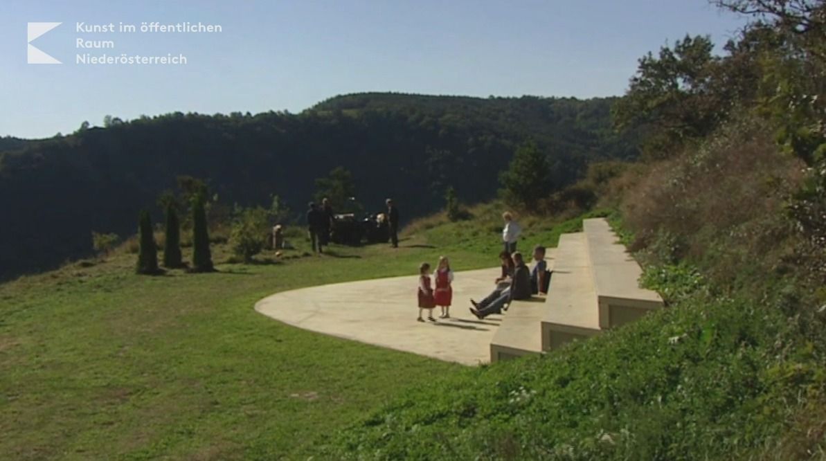 Der im Weinviertel lebende Künstler Norbert Maringer hat seinen Blick geschärft für spezielle Phänomene und Besonderheiten in der Natur. Gleich einem Archäologen sucht er dort, wo andere vorübergehen, spürt auf, was verborgen ist, und verstärkt, was er findet. Er weckt die Aufmerksamkeit, stellt Bezüge her, legt Maßstäbe an und setzt in Proportion. Mit minimalen künstlerischen Interventionen gibt Maringer einen Fingerzeig, empfindsam, klar, aber auch irritierend. In Schönberg am Kamp hat er eine ehemalige Weinbergterrasse unterhalb der barocken Kreuzigungsgruppe für seine künstlerische Arbeit ausgewählt. Der Blick ins Land von hier ist prächtig. Der Künstler hat mit der sehr strengen formalen Lösung die umliegende Landschaft zur Bühne gemacht. Eine Aussichtsterrasse in Form einer Hyperbel aus sandfarbigem Beton mit drei Sitzreihen schmiegt sich in den Hang, wächst in den Hügel hinein und verbindet sich mit der Umgebung. Sehr bewusst hat Maringer für seine Intervention keine Materialien aus der Natur verwendet, sondern Beton und LED-Lampen, technisch entwickelte Produkte des "Homo sapiens", als deutlichen Eingriff in die von Gott geschaffene Natur.