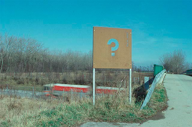 Christian Gmeiner markiert das Gelände des größten Kriegsgefangenenlagers aus der Nazizeit in Österreich an dessen vier ehemaligen Eckpunkten mit jeweils einer Tafel, in die ein großes Fragezeichen eingeschnitten ist. Eine weitere Tafel nennt das Wort "Erinnern" in den Sprachen aller Inhaftierten.