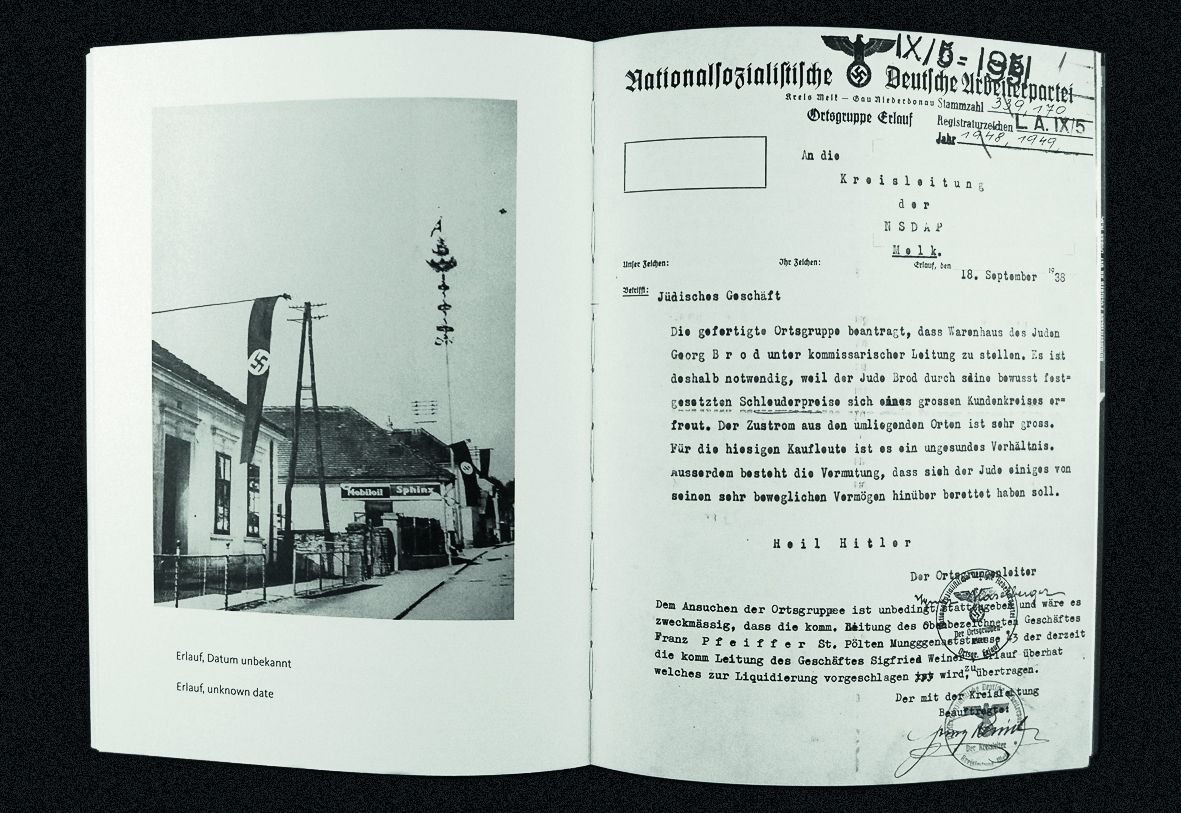 Anlässlich der Eröffnung des Museums ERLAUF ERINNERT 2015 thematisierte die Künstlerin Tatiana Lecomte das Leben der aus Erlauf vertriebenen Ernst Brod und Frank Schanzer. Aus ihren Recherchen ging das Buch „Then Hitler invaded Austria. Vertreibung in die Sehnsucht“ hervor, das sie als vergängliches Ausstellungsobjekt im Museum installierte. Die gesamte Buchauflage wurde als Stapel in der Ausstellung positioniert, und die Besucher_innen waren aufgefordert, sich ein Exemplar und somit auch ein „Stück Erinnerung“ mit nach Hause zu nehmen. Der sich dadurch ständig wandelnde Bücherstapel diente gleichermaßen als dynamische, interaktive Skulptur wie als Mahnmal gegen das Vergessen.