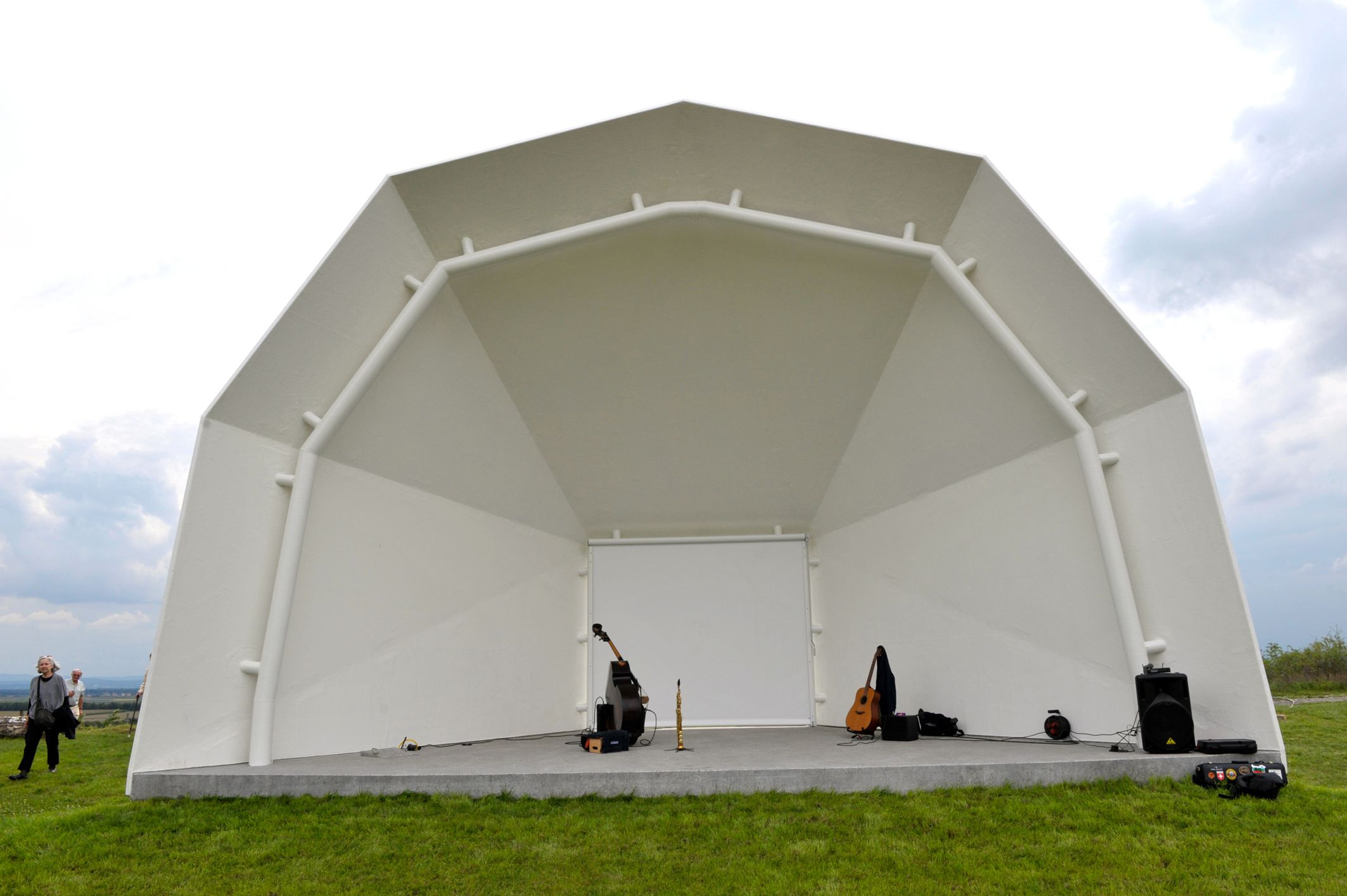 Das WagramFenster von Martin und Werner Feiersinger ist eine Bühne, die sich für Auftritte des örtlichen Chors und der Musikkapelle ebenso eignet wie für Weinverkostungen oder Theaterabende. Gleichzeitig ist das WagramFenster eine begehbare Skulptur, eine Loggia, ein Übergangsbereich zwischen innen und außen, muschelförmig überdacht. Sie liegt auf einem Hochplateau am Dorfrand, von wo man über die Scheunendächer und die weite Landschaft bis zur Donau blickt.