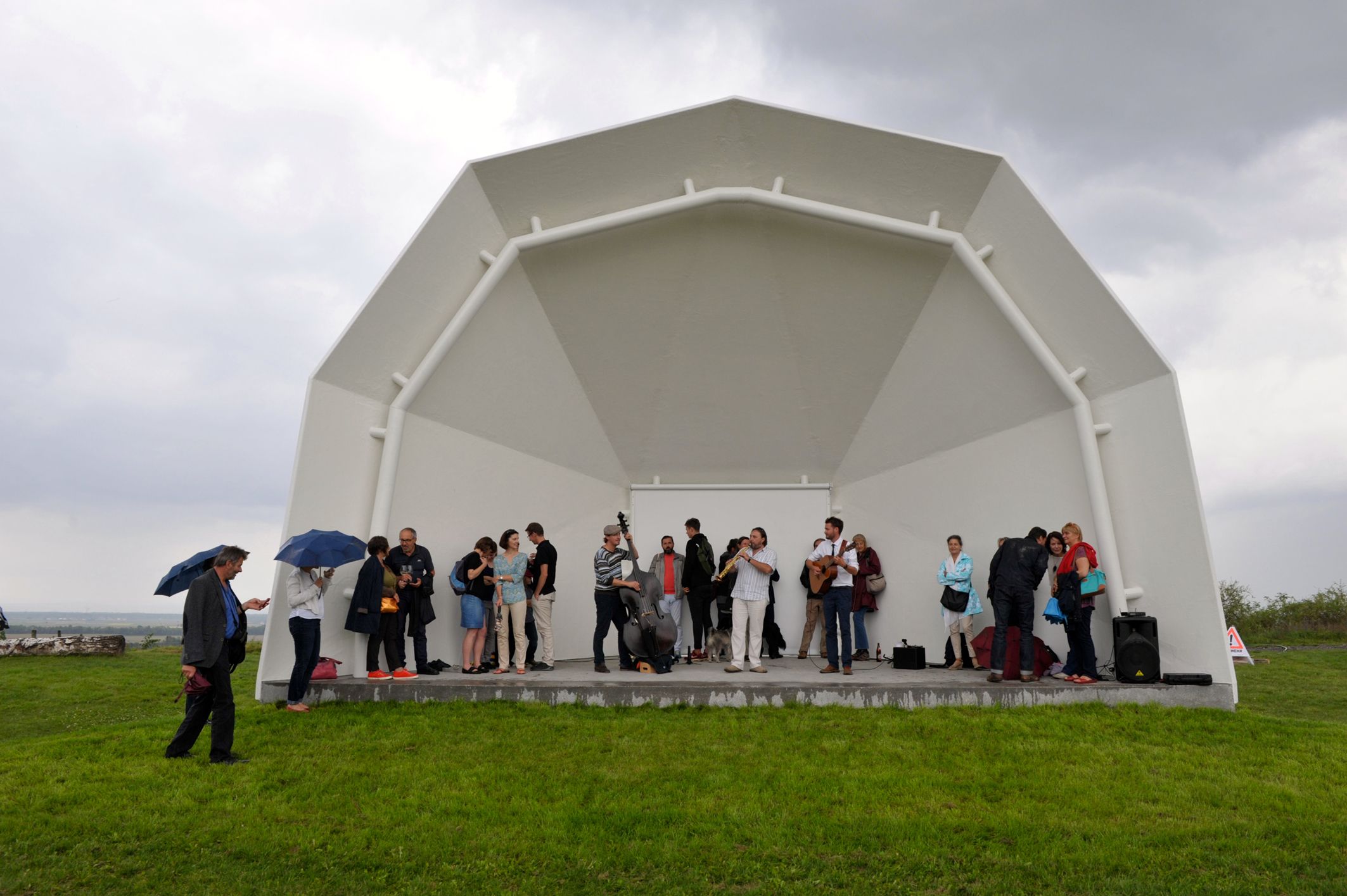 Der Dialog zwischen Architektur und Plastik gehört zu den aufregendsten künstlerischen Phänomenen. Die Brüder Martin (Architekt) und Werner (Bildhauer) Feiersinger haben dieses Spannungsmoment in der Gemeinde Königsbrunn am Wagram eingesetzt. Ihr WagramFenster ist eine Bühne, die sich für Auftritte des örtlichen Chors und der Musikkapelle ebenso eignet wie für Weinverkostungen oder Theaterabende. Die begehbare Skulptur liegt auf einem Hochplateau am Dorfrand, von wo man über die Scheunendächer in die weite Landschaft bis hin zur Donau blickt. An dieser Geländekante, inmitten von Weingärten, haben die Feiersingers aus der Chiffre des anonymen ländlichen Bauens heraus einen frei stehenden Pavillon entwickelt, dessen markante Silhouette schon von Weitem auf den neuen Versammlungsort aufmerksam macht. Das Konzept der Loggia als Übergangsbereich zwischen außen und innen und die Methode muschelförmiger Überdachung ergänzen einander. Mit seinem blendenden Weiß erinnert das WagramFenster an die Naumburg Bandshell im New Yorker Central Park oder die Hollywood Bowl in Los Angeles. Künstlerischer Diskurs und architektonisches Programm gehen eine ideale Verbindung ein, die Raumerfahrung und ästhetisches Empfinden der KönigsbrunnerInnen verändern wird.