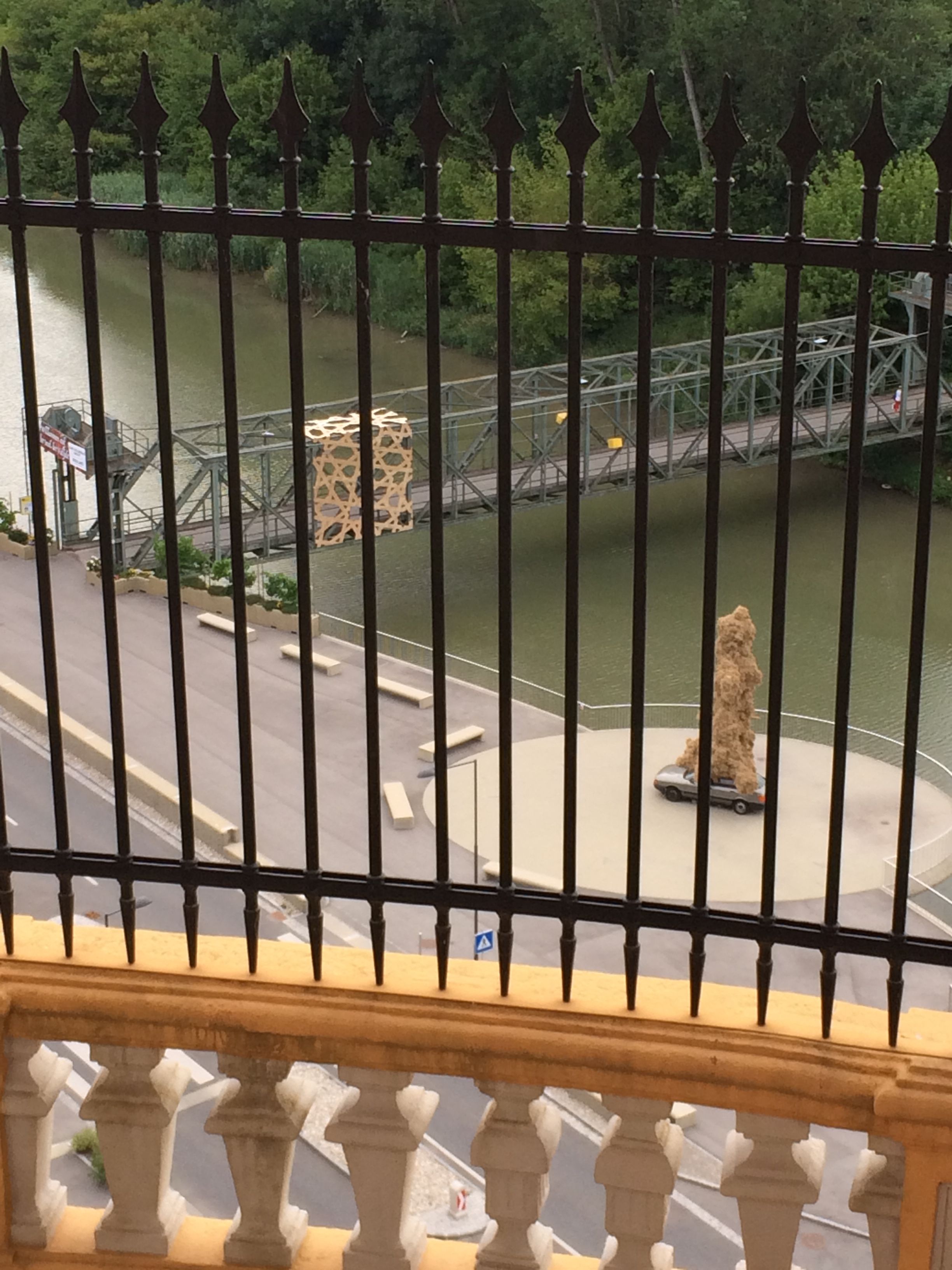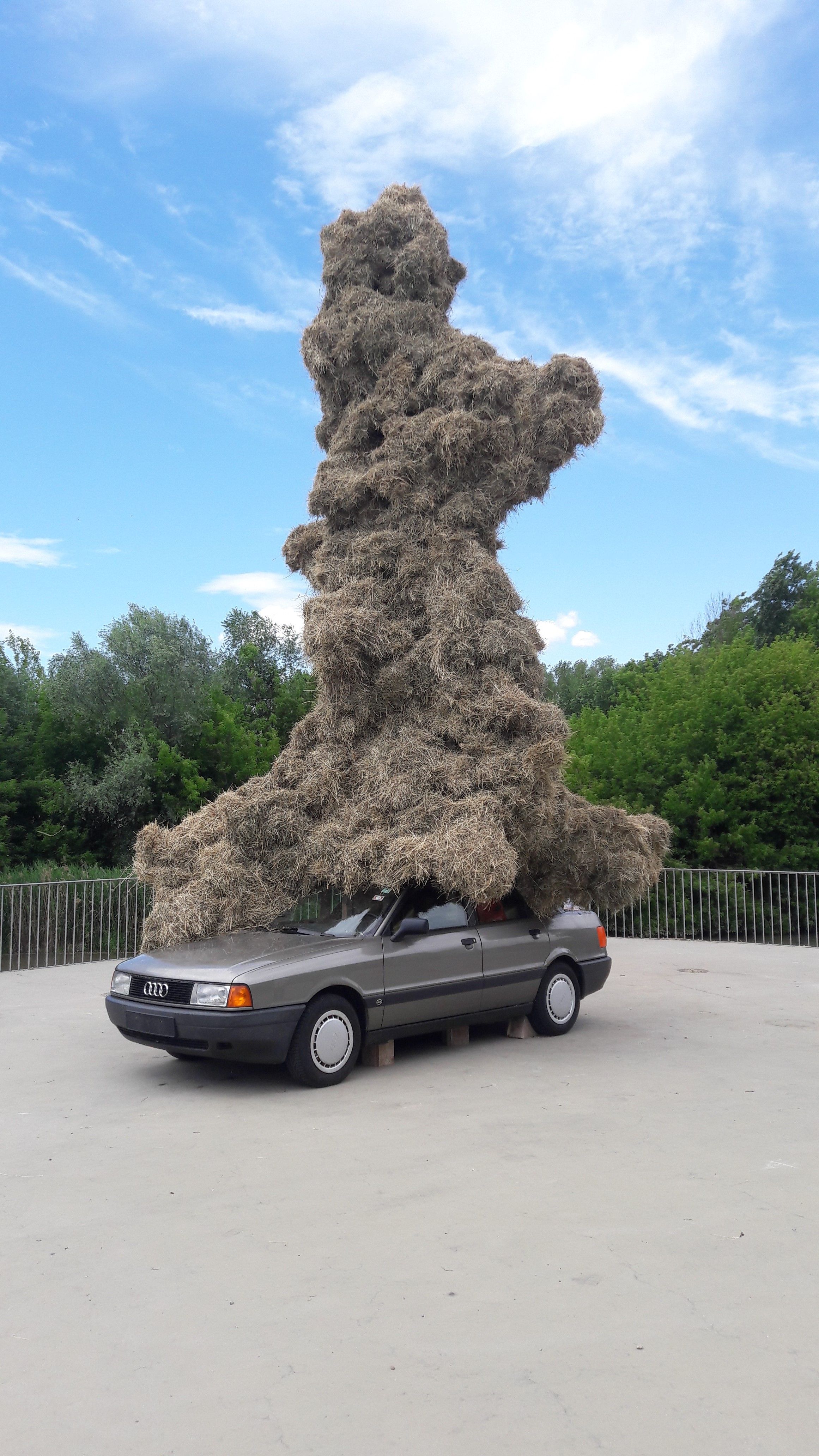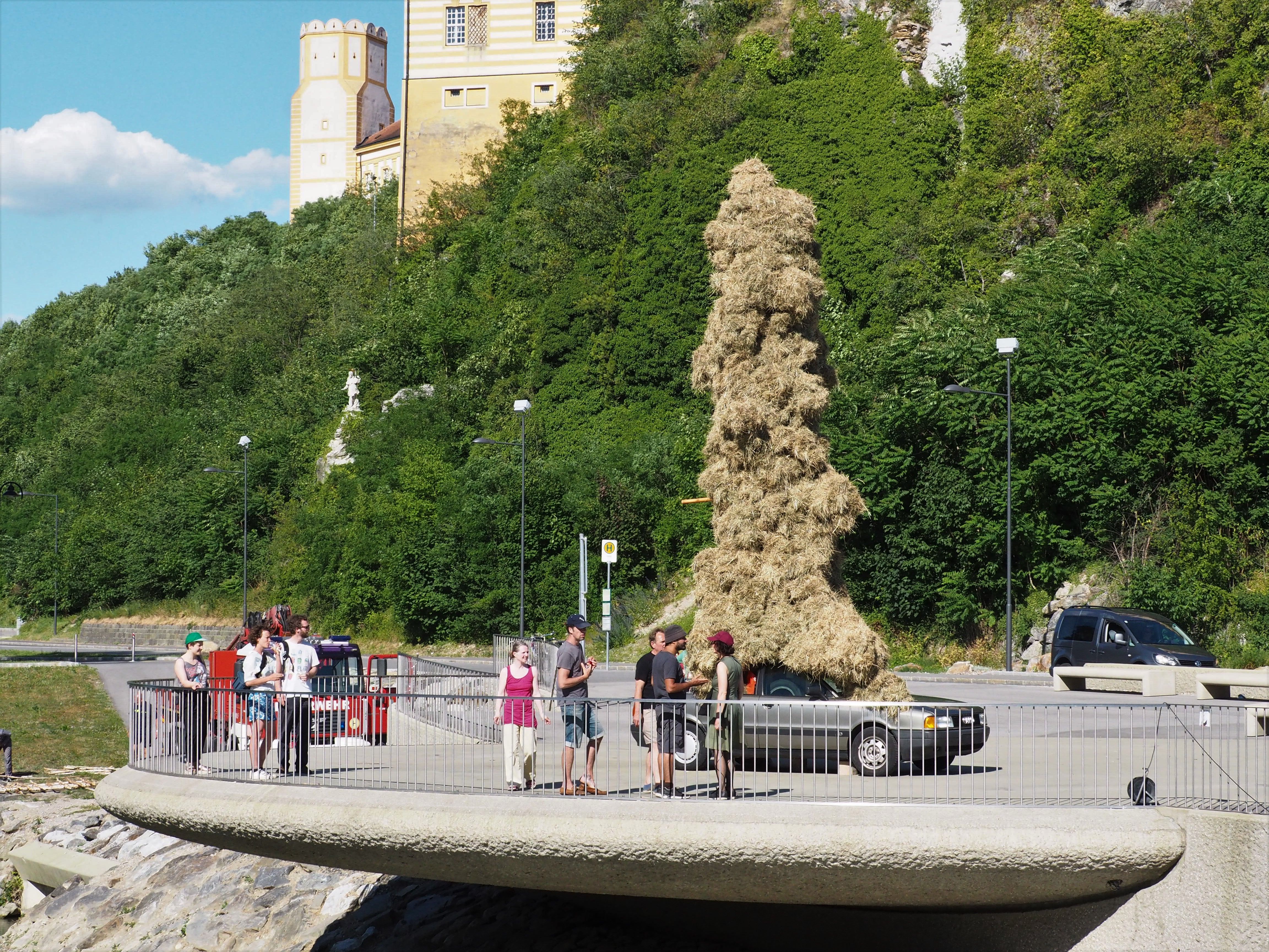 Auf einem Auto montiert, befindet sich eine säulenartige Skulptur aus Stroh auf einem Holzgerüst, die an eine Pestsäule erinnert. Wir haben an die Pestsäule gedacht, weil sie als Skulptur im öffentlichen Raum im ganzen ehemaligen Gebiet der k. und k. Doppelmonarchie vorkommt und so einen unüblichen Hintergrund hat. Ein Monument für eine unkontrollierbare Kraft, die die Menschheit an sich bedroht. Heute ist zwar eine andere Situation, aber der Anstieg des radikalen Extremismus, die Gewalt in Zusammenhang mit der »Flüchtlingskrise«, die Kriege und Konflikte in Syrien, Afghanistan, etc., die Drohgebärden verschiedener Staatsobermänner und der blühende Populismus tragen alle bei zu einer Stimmung des Ausnahmezustands und Hilflosigkeit gegenüber einer Welt, die im Chaos und Unheil zu versinken scheint.