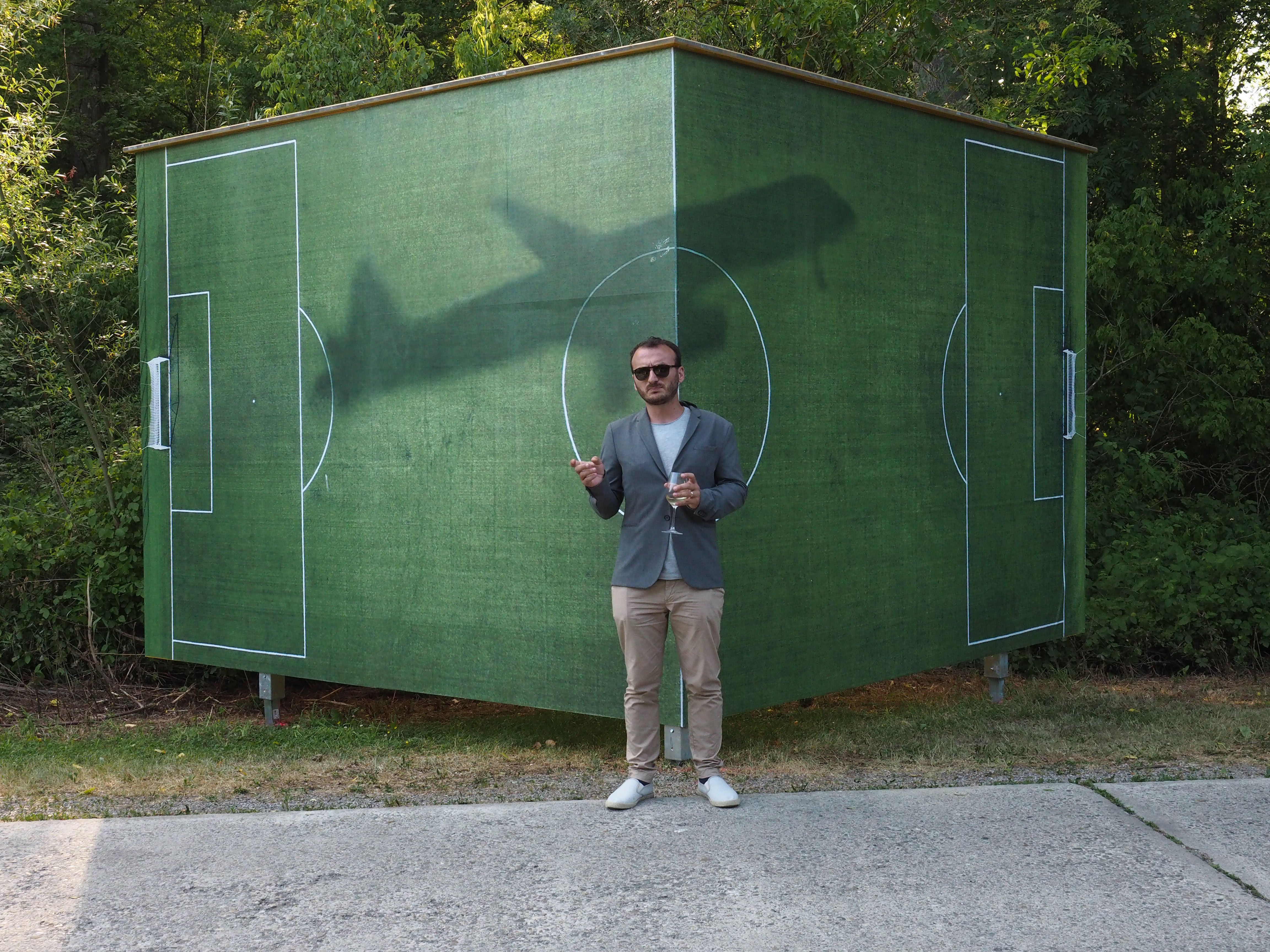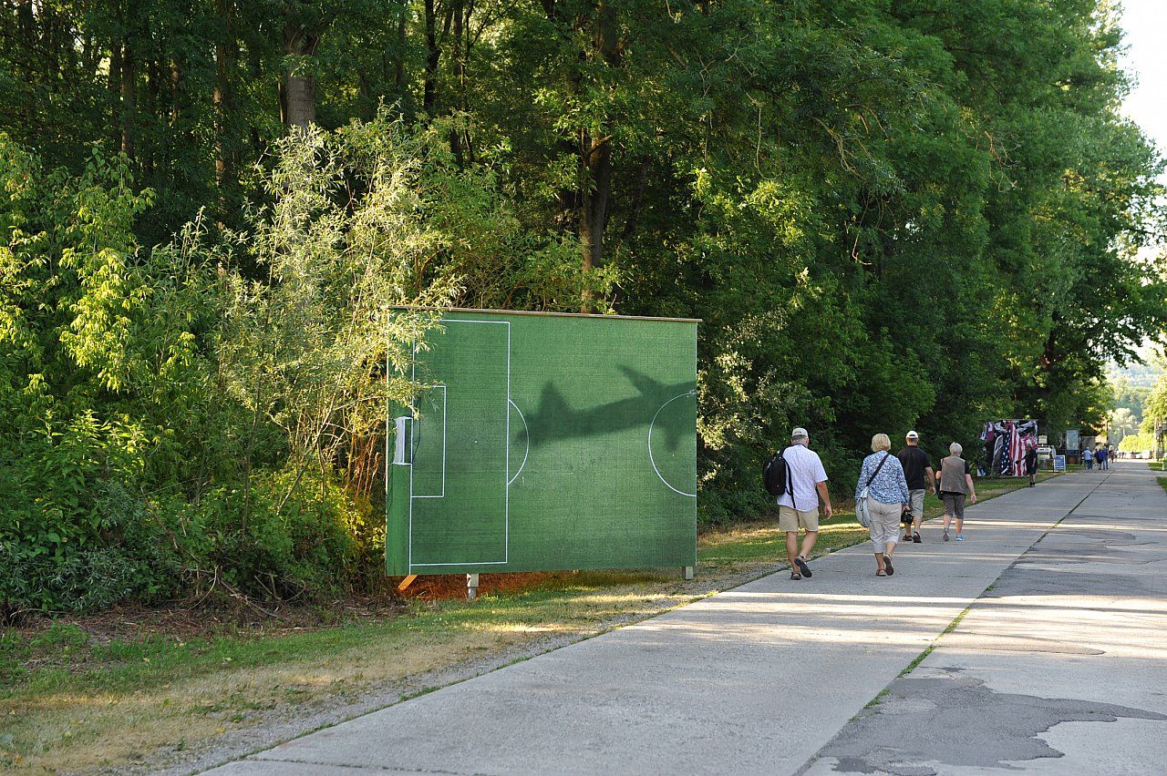 von Österreich nach Albanien schaute ich aus dem Fenster des Flugzeuges und bemerkte wie das Flugzeug ein Fußballfeld in der Nähe des Flughafens überfliegt und einen Schatten wirft. Diese Episode veranlasste mich dazu, auf dieses Territorium zurückzukehren, um ein Foto von dem Fußballfeld zu machen, mit dem Schatten eines Flugzeuges darüber.