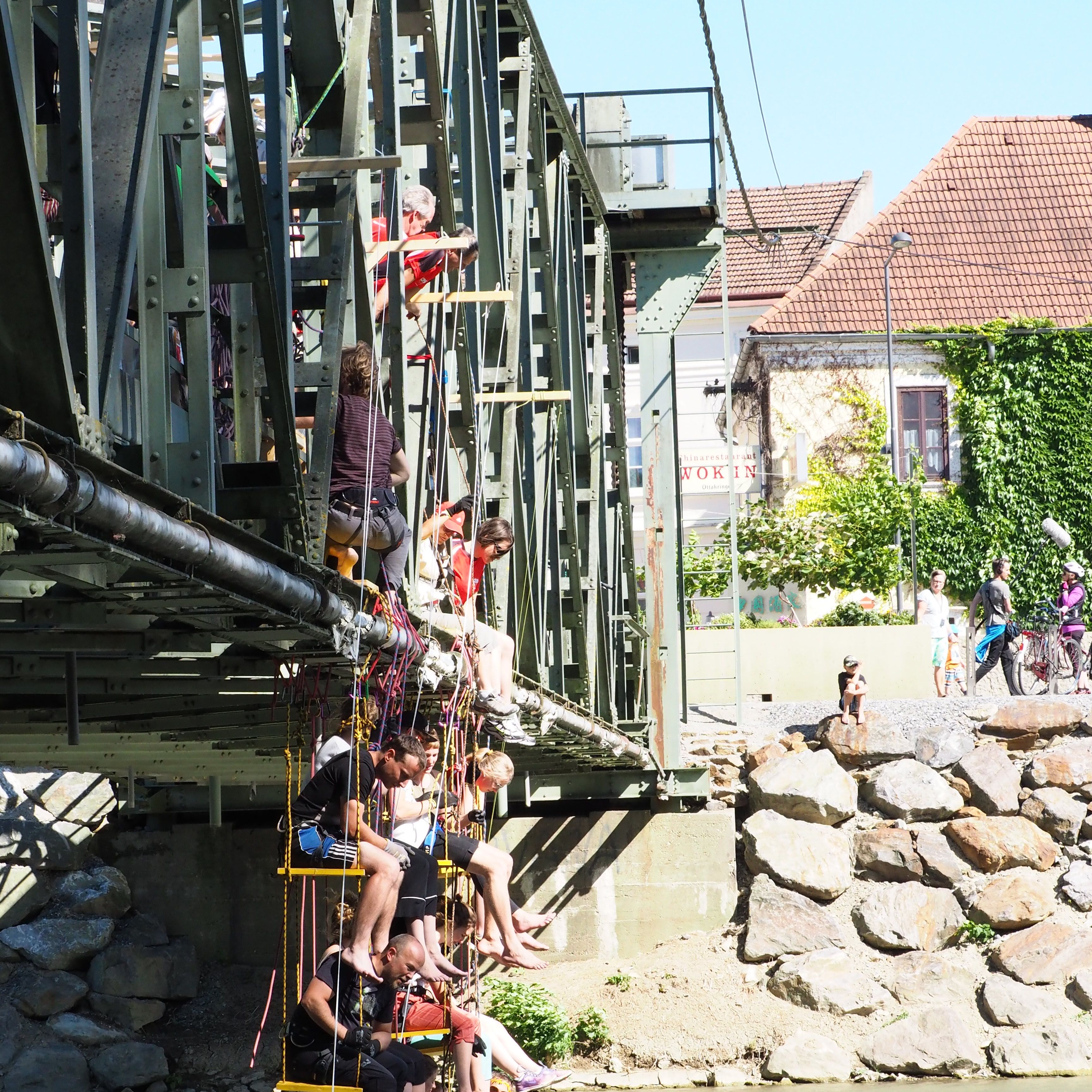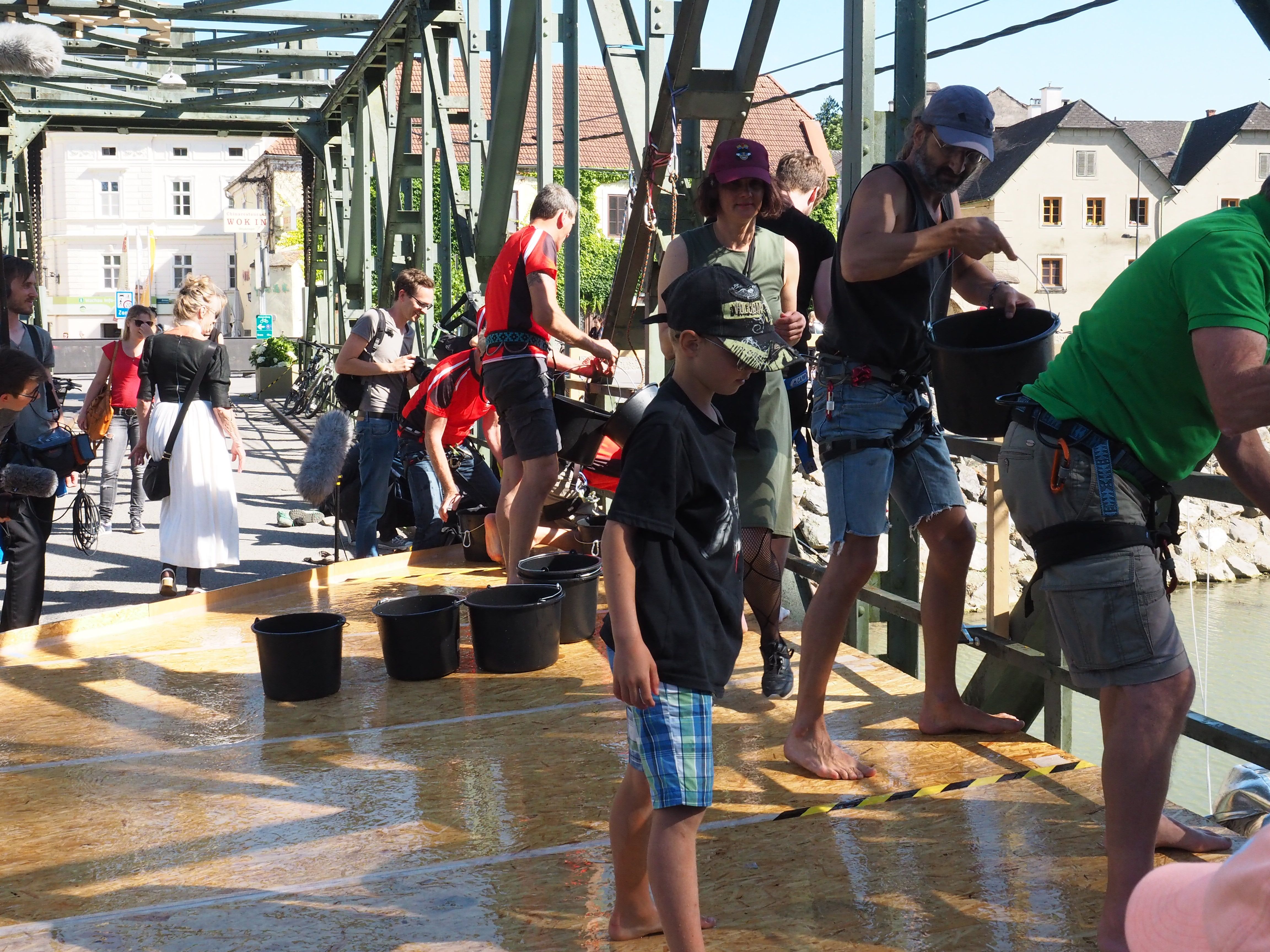 Die Donau treibt Touristen nach Melk - sie prägt die Schönheit der Wachau. Wassermassen, die an den Augen vorbeirollen. Doch birgt diese Naturgewalt auch beachtliche Gefahren. In Melk ist das potentielle Hochwasser omnipräsent – die Stadt ist gerüstet gegen die drohenden Wassermassen. Die Stahlbrücke über den Donauarm hat eine besondere Schutzvorrichtung: eine Hebekonstruktion, mit der sie bei Hochwasser nach oben gezogen werden kann. Mit Niagara Melk wollen wir eine Hochzeit zwischen der Brücke und dem Fluss feiern. Bei Hochwasser ist die gängige und erste Möglichkeit, das überflutete Objekt von Wasser zu befreien, indem man eine Menschenkette bildet und mit Kübeln das Wasser ausschöpft. Dieser Formensprache bedienen wir uns. Nicht um einer Naturkatastrophe entgegenzuwirken, sondern um ein Naturspektakel zu generieren. Ein Wasserfall der durch Zusammenarbeit und die Kraft vieler Menschen generiert wird. Die Geräusche der Performance werden aufgenommen und sind als akustisches Gedächtnis in den nächsten Wochen als Sound-Installation auf der Brücke zu hören.