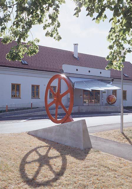 Die Objekte für den Vorplatz des neu errichteten Kindergartens sind als Symbole für Spiel und Bewegung gedacht. Ball und Rad signalisieren eine Bereitschaft, auf die Straße zu rollen - eine Aufforderung zur Tempominderung der Autofahrer.