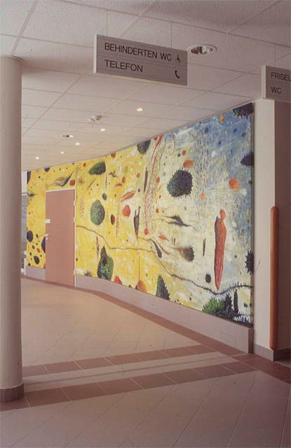 Im Eingangsbereich des Pensionistenheimes sollte eine großflächige Malerei dem Foyer einen zentralen Blickpunkt geben. Die Arbeit umfaßt die große Wand neben dem Eingang und ist auf die zentrale Halle ausgerichtet. Eine in der Wand befindliche Tür wird von dem Bild umschlossen, ein Wandknick mitgenommen. Das Bild ist in dominanter Gelbfarbigkeit und hat vom linken Rand her eine Ballung von Weltformen, die sich zur Mitte hin verlieren und einer Großflächigkeit Platz machen, wobei vom rechten Rand in einer erneuten Verdichtung der Formen eine große "Betrachterfigur" eine Blickrichtung ins Zentrum angibt. Die Malerei ist in der Technik Öl auf Leinwand auf Aluminiumrahmen ausgeführt und wurde vor Ort montiert. Sie hat das Format von 800 x 260 cm.