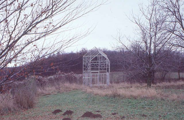 Dieses im oberen Teil des Skulpturengartens installierte Gehäuse paraphrasiert Haus und Garten. Es ist ein Gerüst aus verschieden dimensionierten, verzinkten Stahlrohren, das Pflanzen als Klettergerüst zur Verfügung gestellt wird und so sein Erscheinungsbild mit den Jahreszeiten in Form und Farbe ändert. Die hausförmige Skulptur steht am Anfang da wie eine Architekturzeichnung und mutiert - vielleicht erst nach einigen Jahren - zu einem Labyrinth aus Zweigen und Blättern.