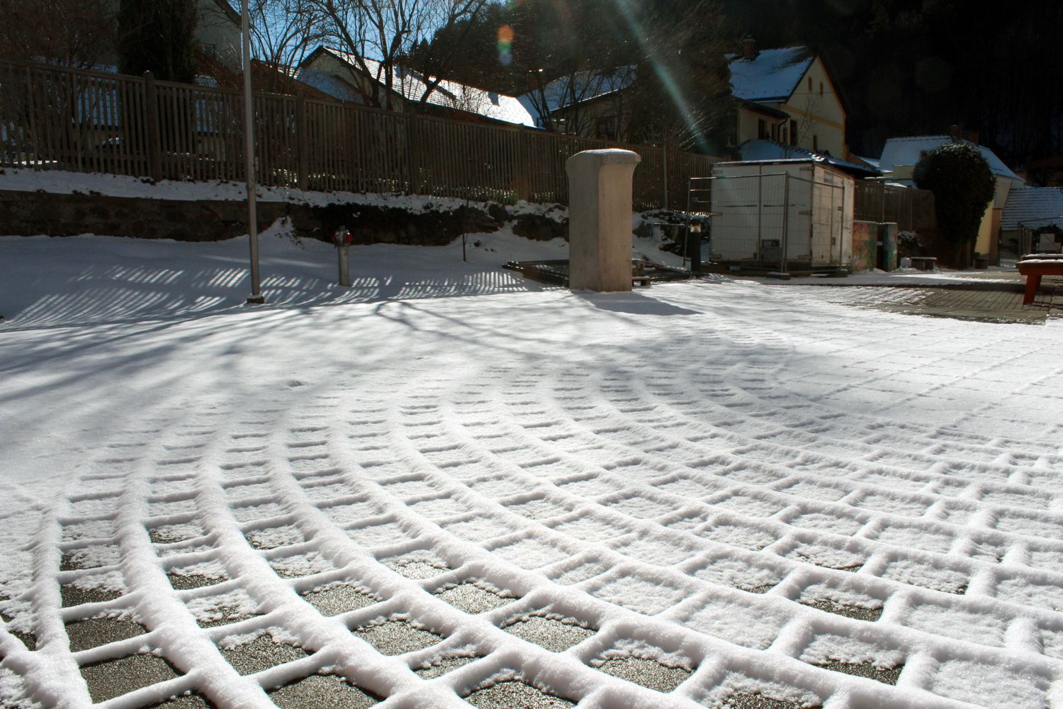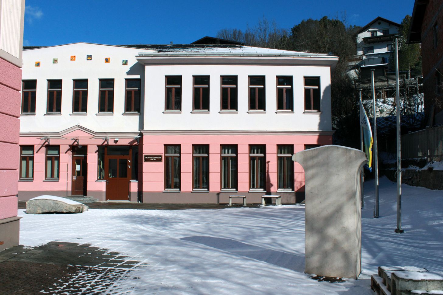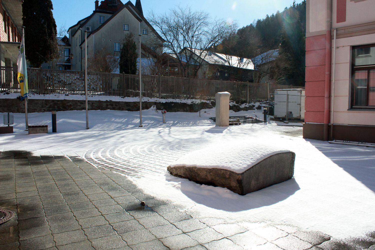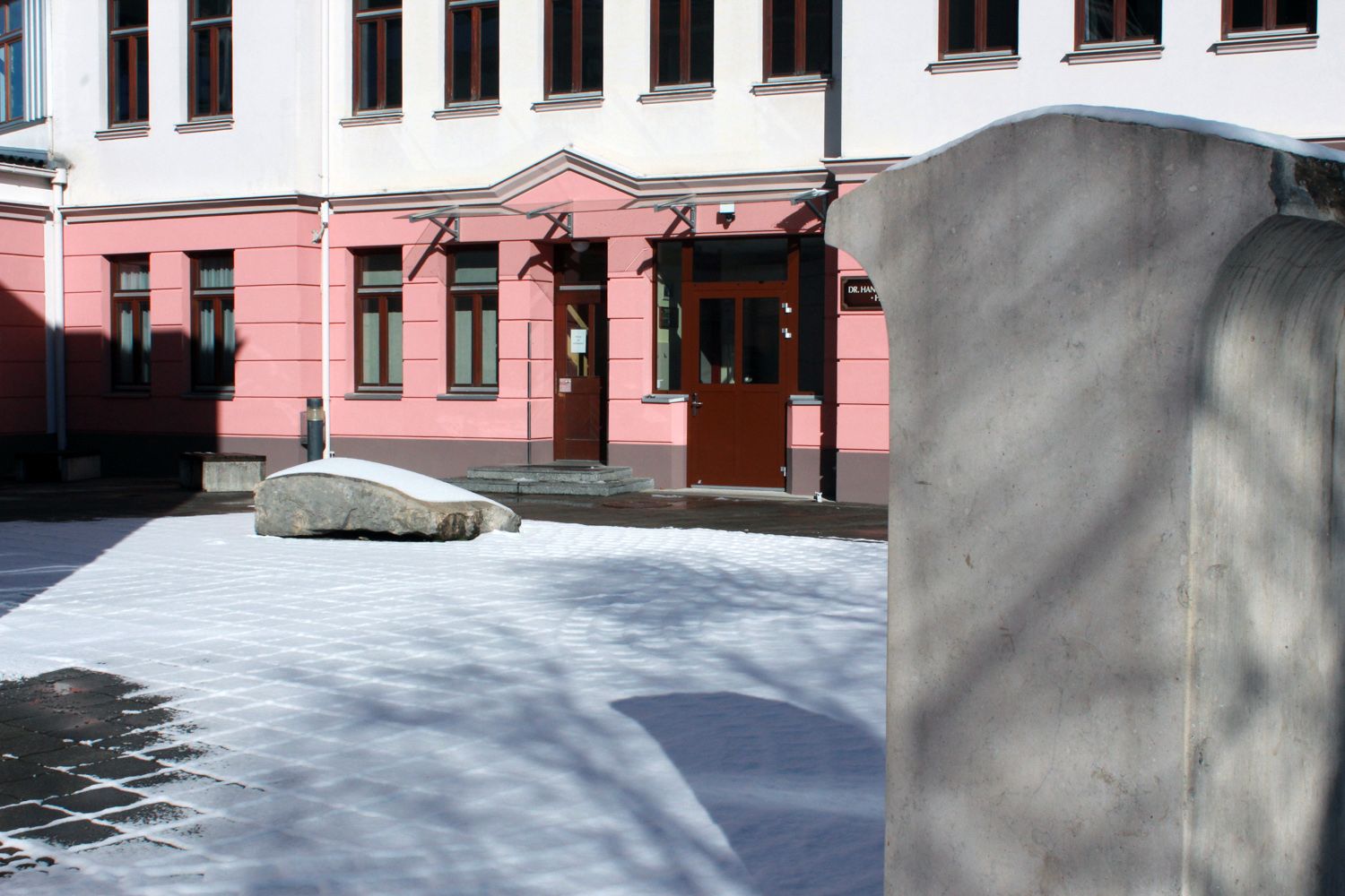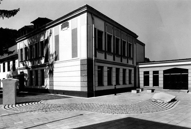 Der Weg zur Schule führt von einem Torstein, der bei der Einfahrt aufgestellt ist, über mehrspurige Graslinien zum Sitzstein im Hof. Vom Torstein zum Sitzstein. Sehen, wie sich das Gras bewegt. Der Torstein soll in seiner Position den Zugang zum Platz besonders betonen, als Torfunktion. Graslinien als gewachsene Zeichen von Bewegung, Linien, die sich bewegen. Als Korrespondenz mit der anderen Hofseite. Sitzstein – gewölbt. Aus der Summe von Bewegungen der Linien gehoben und gewölbt, als Korrespondenz mit der umgebenden Landschaft.