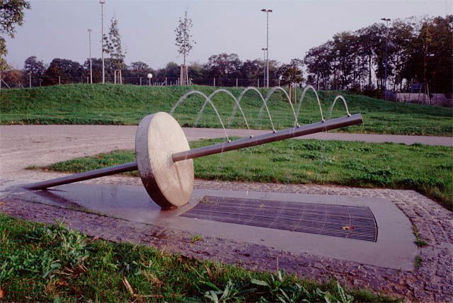 Das Künstlerduo gab dem Trinkbrunnen zwischen altem Schloss und modernen Schulbau eine Form, die ihn auf den ersten Blick nicht als solchen erkennbar macht. Im Spannungsfeld zwischen alt und neu entstand ein abstraktes Objekt, aus dem hervorkommend, Wasser fünf parallele Bögen zum Boden formt.