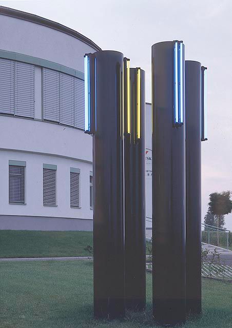 Vier blaue Leuchtstoffröhrenpaare nach außen gerichtet, vertikal in einer Höhe von 280 bis 400 cm installiert markieren die Skulptur als Zeichen für die Zu- bzw. Abgänger des Gebäudes, lenken die Aufmerksamkeit der Passanten durch die gesteigerte Präsenz infolge der fluoreszierenden Leuchtkraft auf dieses vertikal-skulpturale Zeichen und appellieren an die Sensivität bezüglich des "Innenraumes" der Skulptur. Vier gelbe Leuchtstoffröhren strahlen, nach innen gerichtet, warmes künstliches Licht ab. Der Einsatz dieser vier fluoreszierenden Leuchtstoffröhren führt eine lichtmalerische immaterielle Farbigkeit in die skulpturale, streng vertikale Konzeption ein. Dieses Licht erzeugt die Qualität einer nichtstofflichen Erscheinung und löst somit die Grenzen der faktischen Innengestaltung der Skulptur auf. Zugleich erzeugt das abgestrahlte künstliche Licht in Vermischung mit dem natürlichen (Tages-)Licht eine selbständige immaterielle Form und akzentuiert diese tektonisch in ihrer Erscheinungsform nach außen für den Betrachter.
