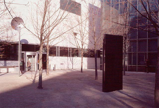 Minimalistisch und lapidar betitelte Bernhard Leitner seine neue Ton-Raum-Installation im Ahornwäldchen des Kulturbezirks St. Pölten zwischen Landesbibliothek und -archiv, schräg gegenüber dem neuen Landesmuseum, mit "Klangstein". Zwei Bereiche konstituieren das neue Werk: ein schwarzer, auf allen Seiten glatt polierter schwedischer Granit, der frei zwischen den Bäumen aufgestellt ist, sowie gegenüber, am Rande des kleinen Parks in neun Meter Entfernung, eine fünf Meter hohe Stahlrohrsäule mit einer Parabolschale, in deren Brennpunkt sich ein über Computer gesteuerter Lautsprecher befindet, von dem aus ein Klangstrahl in die Parabolschale und von dieser auf den Stein projiziert wird. Bewegt man sich in den Bereich des Ausfallswinkels des durch den Stein reflektierten Tonstrahles, so wird ein Wasserrauschen vernehmbar, das als Ausgangsmaterial analog "aus der Natur heraus" aufgenommen wurde. Der Höreindruck ist dabei so intensiv, dass man meint, das Wasserrauschen komme direkt aus dem Stein. Es entsteht in einem begrenzten Raumsegment des Ahornwäldchens das akustische Bild eines fließenden Wassers. Mit der Installation "Klangstein" 2003 gelang Bernhard Leitner die Transgression von Raum, Körper, Sehen und Hören zu einem neuen sinnlichen Phänomen. Allerdings geht es dabei erstmals um den Ton als Strahl, der, weil gebündelt, eine neue verdichtete und projektive Naturerfahrung imaginiert.