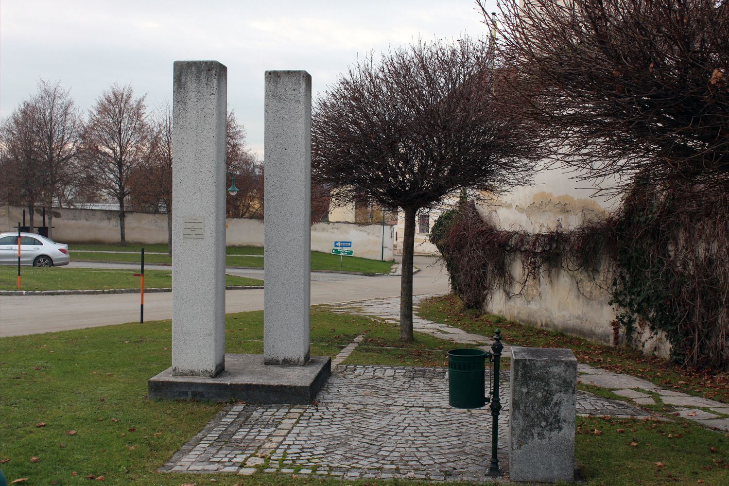 Geras, eine Stadt im Spannungsfeld von erdgebundener Bevölkerung und einer starken, prominenten Anwesenheit geistlicher Tradition, ist ein herbes Beispiel für die Koexistenz von Widersprüchen. Gelebte Koexistenz, die sich im Laufe der Zeit zu einer gewissen Harmonie zurechtgerückt hat. Diese Grundstimmung schwingt in dem für die Skulptur vorgesehenen Standort mit: im Rücken die massive, hohe, alles verschließende Stiftsmauer, vor sich offen und weit der Hauptplatz mit dem alten Brunnen und einer mächtigen "Kaisereiche". Durchkreuzt von Straßen und Wegen. Die Eindrücke dieses sehr zurückgenommenen Ganzen engen den Spielraum für die skulpturale Thematik ein, was in diesem Falle jedoch positiv zu bewerten ist. Einer gewissen Logik folgende, setzt man der umfassenden geistlichen Präsenz ein "Denkmal" des "Mensch-Seins" entgegen. Präziser: die irdische Antipode zur Göttlichen Einheit, die Zweipoligkeit unseres Lebens. So ist ALPHA & OMEGA ein Versuch, diese Ur-Problematik menschlicher Existenz plastisch in Materie umzusetzen. Die tiefe Symbolik von Stein und Stahl ist in 44 x 44 im Grundmaß gefügt. Vier und vier ergibt die gnostische Zahl 8, die Zahl der Unendlichkeit. Die Höhe der Stelen endet bei 312. Drei, eins und zwei sind die Zahlen der Allerheiligsten Dreifaltigkeit, drei und zwölf sind aber auch für sich heilige Zahlen. An einem kleinen Granitquader unmittelbar neben den Stelen sieht man in Textform die wesentlichen Gegensätze des Themas umrissen, wie Kosmos (Ordnung) und Chaos. Zeit und Ewigkeit (Nicht-Zeit, Allgegenwart).