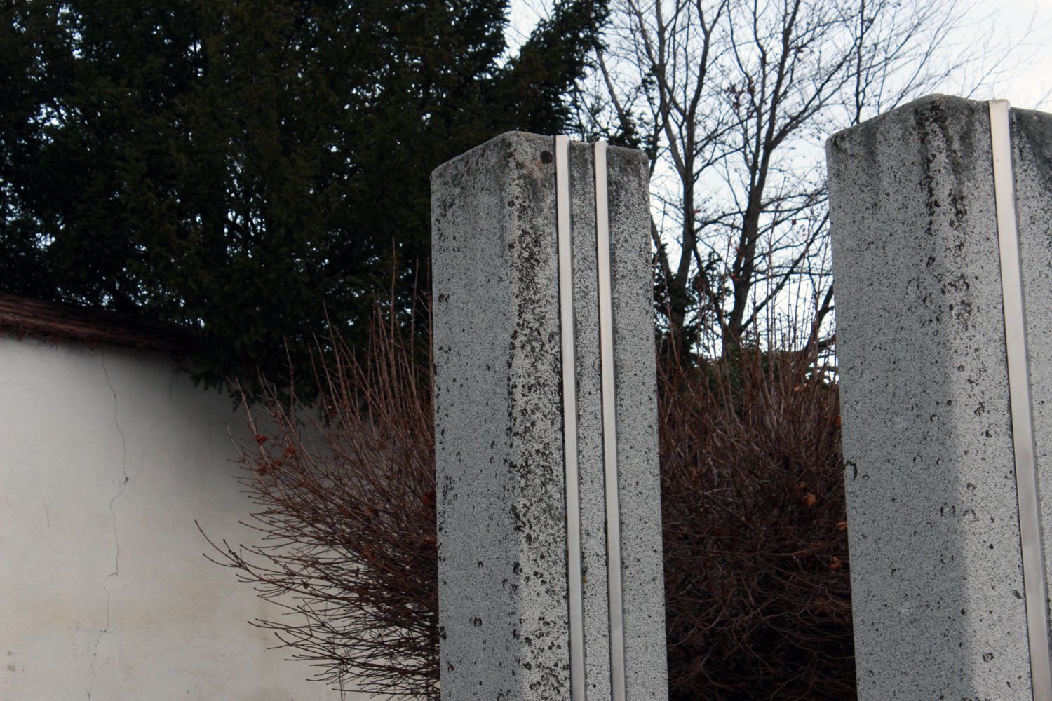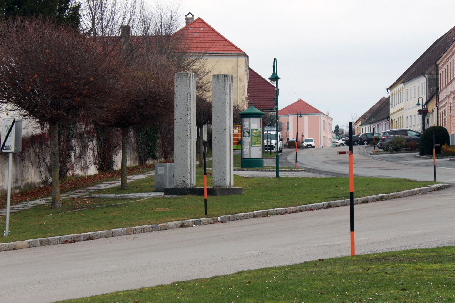 Die zwei Granitstelen mit eingesetzten Edelstahl-Lisenen tragen den Titel "Alpha & Omega, das bipolare Gesetz". Der Künstler versteht sie als Versuch der göttlichen Einheit, die in Geras durch das Chorherrnstift präsent ist, die Zweipoligkeit des irdischen Lebens entgegen zu setzen.