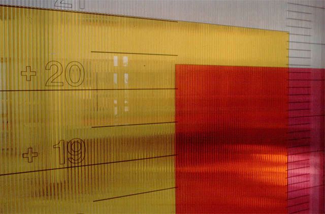 Eine Fensterfläche wurde mit zwei hintereinander liegenden, flachen, transparenten Kunststoffbehältern, die mit Meß-Skalen für die Temperatur versehen sind, ausgefüllt. Das jeweils gelb und rosa eingefärbte Öl in den Behältern übernimmt die Anzeigefunktion der Innen- und Außentemperatur.