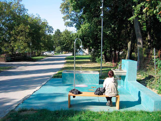 Durch sein bestechendes Blau lockt der Badebrunnen schon von Weitem und irritiert auch gleich ob des Anblicks von Dingen, die ansonsten der Privatsphäre vorbehalten sind. Das überdimensionale Badezimmer aus Beton, das mit Dusche, Badewanne und Waschbecken die übliche Badezimmermöblierung zitiert, ist mit blauen Glas-Mosaiksteinen ausgelegt. Aus allen drei Spendern rinnt das Wasser, und dies in überbordender Art und Weise, wenn das Waschbecken überläuft, die Dusche im Dauerbetrieb ist und in der Badewanne das Wasser gleich in den Abfluss rinnt. Das Badezimmer mutiert also zum Wasser spendenden Brunnen und nimmt die historische Verknüpfung von Quelle, Brunnen und Bad auf. Assoziationen von Tröpferlbad, Wellness und Jungbrunnen sind ebenso gegeben wie die durch den Besucher in Gang gesetzte und immer wieder neu inszenierte öffentlich gewordene Ambivalenz des Privaten und Intimen. Das "freie" Bad ist schließlich auch als kultureller Ort angesprochen, der hier zum Annex des Dorfraumes wird. Rastende Radfahrer, die es in dieser Gegend häufig gibt, nehmen ihn ebenso in Anspruch wie die Kinder, die ihn längst zum fixen Bestandteil ihrer Aktivitäten auserkoren haben.