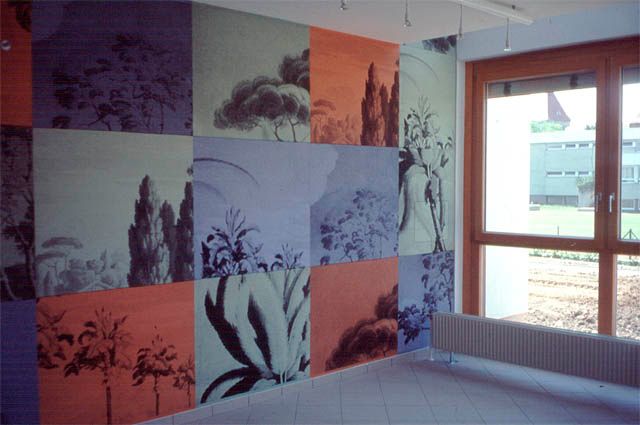 Von den verschiedenen möglichen Orten für eine künstlerische Intervention wählte Sigrid Kurz den Wintergarten, der sich über drei Etagen erstreckt und eine bis ins zweite Obergeschoß durchlaufende Fensterfront aufweist. Mit der Arbeit auf die Bewohner des Pensionistenheims einzugehen und in der Wandgestaltung für sie einen Blickpunkt zu schaffen, war Intention der Künstlerin, der Wintergarten als Ort der Ruhe und Muße - und vom alltäglichen Ablauf ausgenommen - dafür gut geeignet. Die ausschnitthaften Bilder verschiedener südlicher Pflanzen und Bäume, deren Vorlage idealisierte Landschaftszeichnungen aus dem 19. Jahrhundert sind, reihen sich in Siebdrucken an- bzw. übereinander, der reale Blick geht auf die angrenzenden Grünflächen (Sportplatz), der imaginäre in eine Eigenzeit romantischer Schönheit. Die Landschaft ist also Ort sehnsuchtsvoller, zugleich paradiesischer Reisen, die sich immer wieder beginnen und fortführen lassen. Mit dem Realen haben sie nichts zu tun, denn sie finden abseits einer Dynamik von Wachstum und Erblühen statt. Ihr Zustand ist ein Angebot an die Erinnerung, wenn der Raum um den alten Menschen kleiner wird, aber trotzdem die Erinnerung viel Platz braucht, um in die Weite (und Ferne) zu schauen. Dabei ist der Betrachter aber an einen flexiblen Blickpunkt gebunden, denn immer wieder sieht er neue Fragmente und Bilder, ein etwaiges paradiesisches Gesamtbild wird dadurch aufgebrochen; er soll nicht starren, sonders sein Blick soll wandern, was bedeutet, daß er lebendig und wach bleibt und auch die Erinnerung nicht abreißt.