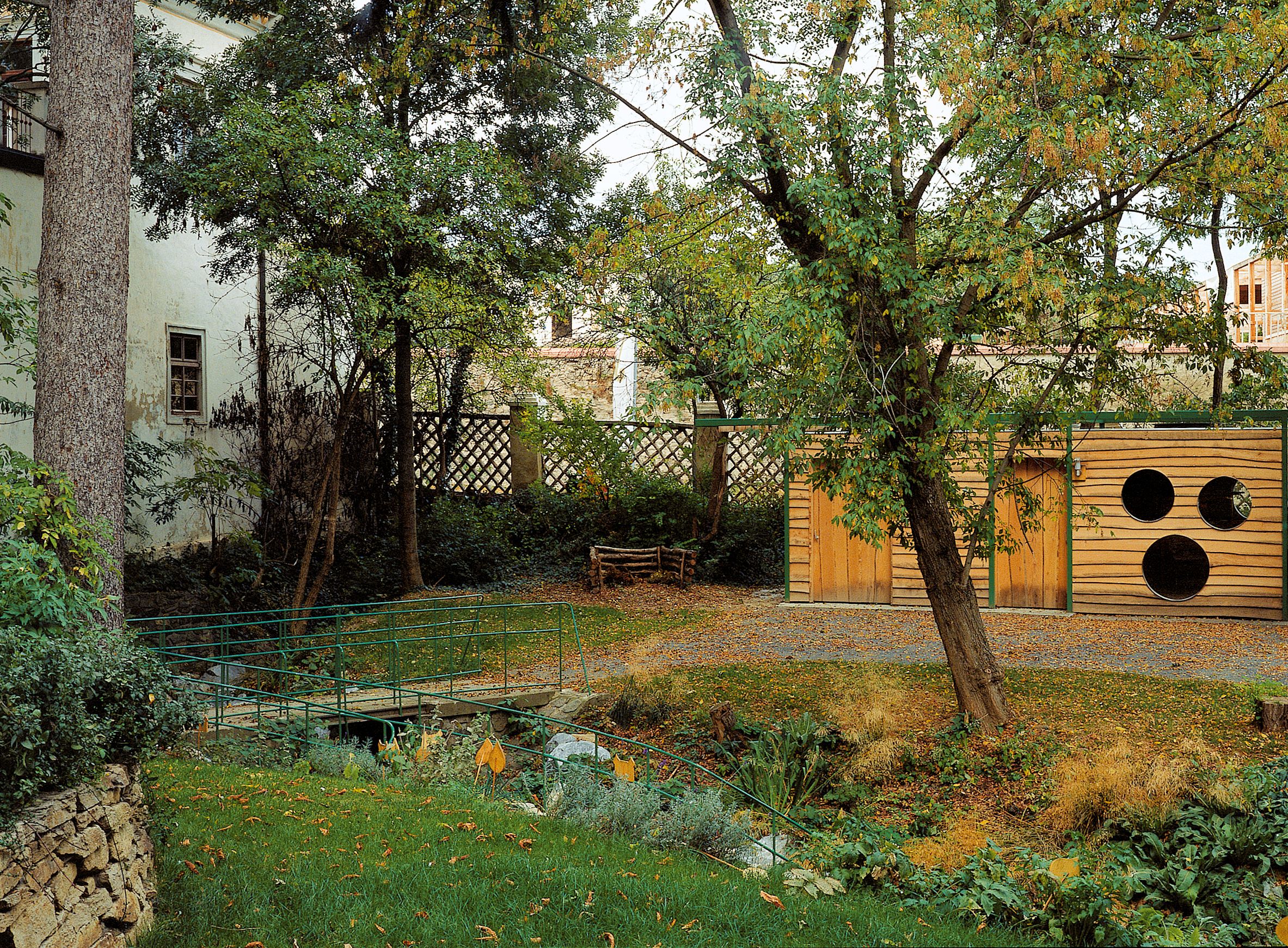 Wir erhielten das Angebot, bei dem in Planung und Aufbau befindlichen Therapiegarten des Psychosozialen Zentrums im Schloss Schiltern mitzuwirken. Bei gemeinsamen Gesprächen mit BetreuerInnen und KlientInnen des Zentrums ging es um deren Vorstellungen eines Gartens. Realisiert wurde ein umzäuntes Gemüsebeet in Verbindung mit einer Gartenarchitektur; ein Pavillon mit beigefügtem Schuppen, die anschließende Laube und die Gartenmöblierung bilden eine Einheit, die sich auf das umgebende historische Ensemble bezieht.