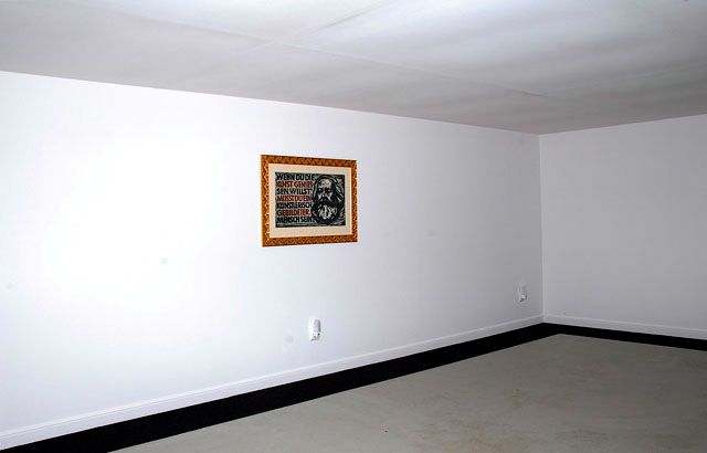 Dieses Zitat von Karl Marx in Form eines Holzschnitts, angefertigt 1965 von einem Arbeiterkünstler in der Deutschen Demokratischen Republik, rückte Mona Hahn ins Zentrum ihrer Installation. Der Raum wurde durch eine Zwischendecke in zwei Räume aufgeteilt, zirka zwei Drittel machten den unteren Raum aus, ein Drittel den oberen, der nicht begehbar, jedoch durch die große Glasscheibe an der Stirnseite des Kunstraums von außen sichtbar war. Mona Hahns Intervention war ein kritischer Kommentar zu Irrtümern in der Entwicklung der Kunst im öffentlichen Raum, sowohl in der Herangehensweise der Künstler*innen als auch in der Erwartungshaltung des Publikums. Gemeint war damit die mittlerweile von einer Vielzahl von Künstlerinnen und Künstlern auffallend einhellig praktizierte Arbeitsmethodik im öffentlichen/politischen/sozialen Raum, vorrangig soziale Missstände vor Ort zu suchen und zu thematisieren, die meist ohnehin allen BewohnerInnen bekannt sind. "Kunst, die, um politische Ziele zu erreichen, ihre formale Sprache vernachlässigt, ist bestenfalls illustrierte Politik, doch keine politische Kunst".