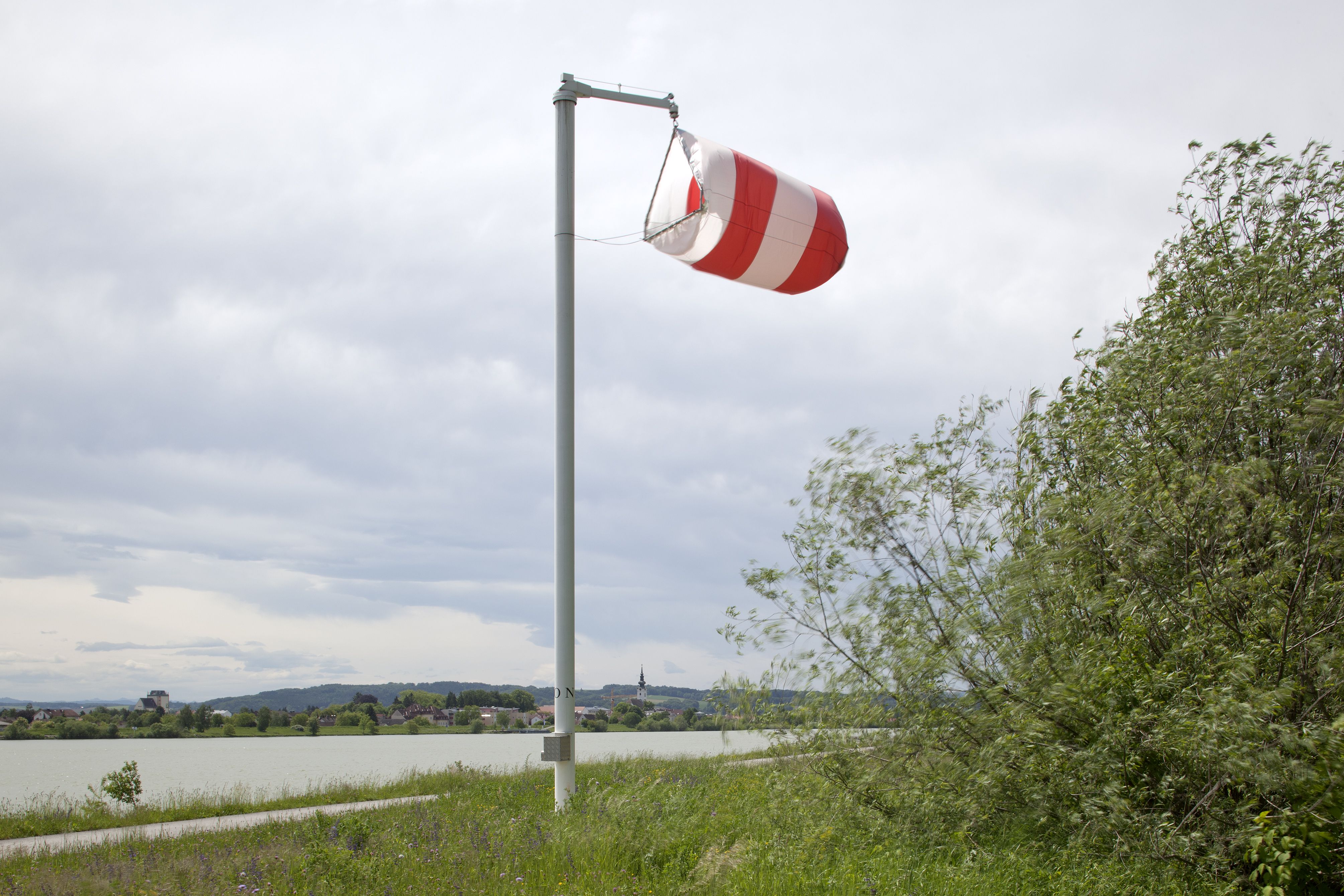 Mit ihrer Installation "Camp NOSW" bei der Donaubrücke in Klein-Pöchlarn thematisiert Katrin Hornek aktuelle Formen der Mobilität und des temporären Verweilens in allen ihren Ausprägungen – von prekär bis romantisch – und wirft die damit verbundenen Fragen nach den sozialen und politischen Hintergründen auf. In diesem Sinne, quasi als gedanklicher Einstieg in ein komplexes Denk- und Assoziationsgeflecht, spielt "Camp" auf das Leben in einem Zeltlager an. "NOSW" steht für die vier Himmelsrichtungen. Die Künstlerin errichtete neben dem Radweg Donaulände einen Mast, auf dem sie die vier Buchstaben N, O, S und W anbrachte. An der Spitze des Mastes befestigte sie ein sogenanntes Zweimannzelt, das sich je nach Windrichtung in einem Radius von 360° drehen kann. Bei viel Wind bläht es sich auf, bei Windstille hängt es herunter. In seiner Materialität, seinem physikalischen Verhalten und seiner farblichen Unterteilung in rote und weiße Ringe erinnert das Zelt an die in der Luftfahrt und im Straßenverkehr verwendeten Windsäcke, die Windrichtung und ungefähre Windstärke anzeigen. Ein solcher befindet sich auch oben bei der Brücke neben der Fahrbahn. Gleichzeitig ist die Assoziation mit einem Symbol für ein Zeltlager möglich, so die Künstlerin: "Katastrophencamps, Campingurlaub, Flüchtlingslager, Sommercamps, Survivalcamps, Festivalcamps, Pfadfinderlager, Terroristencamps, Auffanglager, Forschungscamps. Camps sind stark durch die Zeit determiniert und liegen an der Schnittstelle zwischen Aufbruch und Ankunft, zwischen Sesshaftigkeit und Mobilität. Sie behausen oft positive wie negative Ausnahmezustände und platzieren sich an Peripherien. Sie verorten sich inhaltlich im Spannungsfeld politischer, militärischer und romantischer Extreme." Die Künstlerin suchte sich für ihre Installation im Rahmen der Initiative "Orte zum Verweilen" nicht ohne Grund die Donaubrücke aus: "Durch die Verknüpfung des sehr flüchtigen Ortes zwischen Transport- und Freizeitrouten – mit der Autobrücke, Geh- und Fahrradwegen inklusive Radspindel – werden hier unterschiedlichste Geschwindigkeiten und Nutzungsabsichten gebündelt." Sie geht die künstlerische Fragestellung also nicht dokumentarisch, sondern mit einer gleichzeitig analytischen und synthetischen Dialektik an: Zunächst einmal stülpt sie das lokale Leitthema "Verweilen" ins Negativ um, um es dann von allen Seiten genauestens zu betrachten und Verbindungen zu aktuellen gesellschaftspolitischen, die globale Ordnung betreffenden Fragen herzustellen.