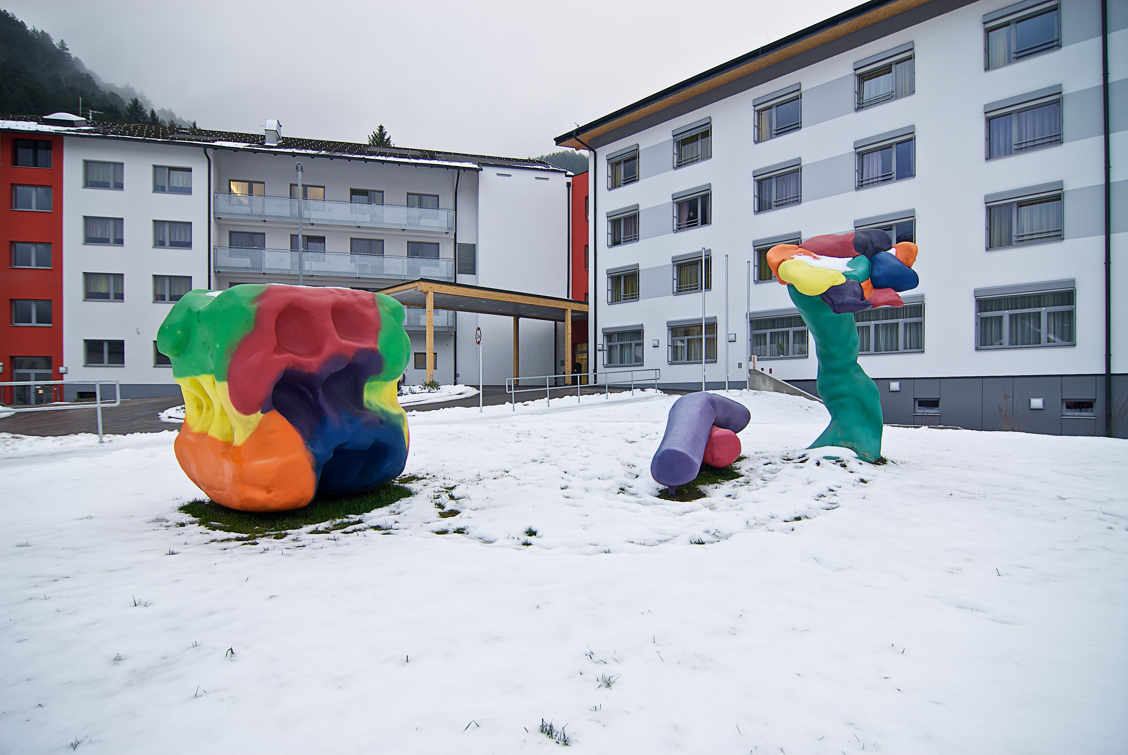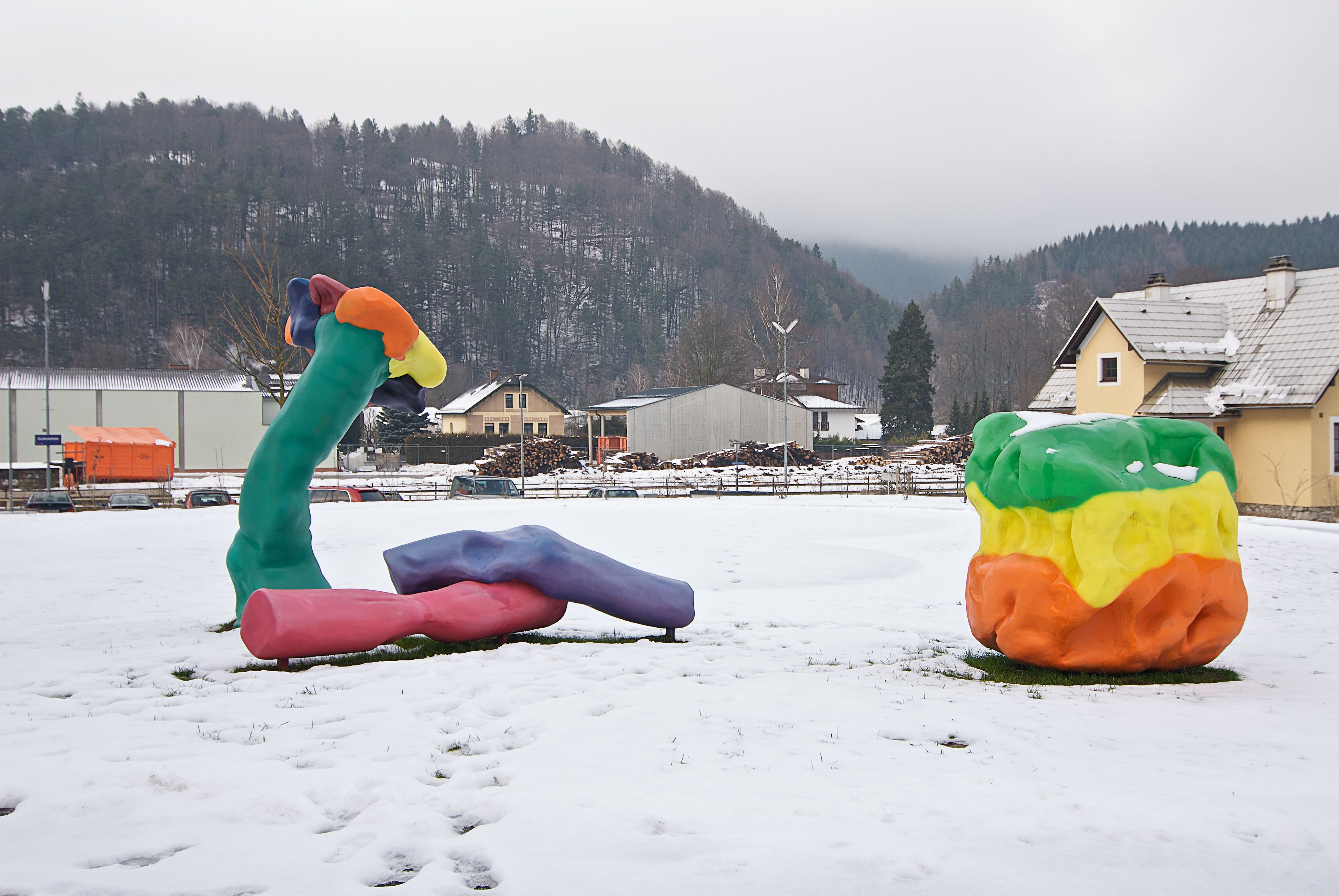 Robert Reszner gewann den Wettbewerb für die künstlerische Gestaltung des Platzes vor dem Landespflegeheim Gutenstein mit einem partizipatorischen Konzept, das einige HeimbewohnerInnen zu künstlerischen Akteuren machte. Als Resultat stehen nun drei überlebensgroße bunte Plastiken aus wasserabweisendem, mit faserverstärktem Spritzkitt und Epoxidharz überzogenem Styropor auf der Rasenfläche vor dem Haus. Es sind Vergrößerungen dreier Objekte, die von BewohnerInnen aus Plastilin gefertigt wurden.