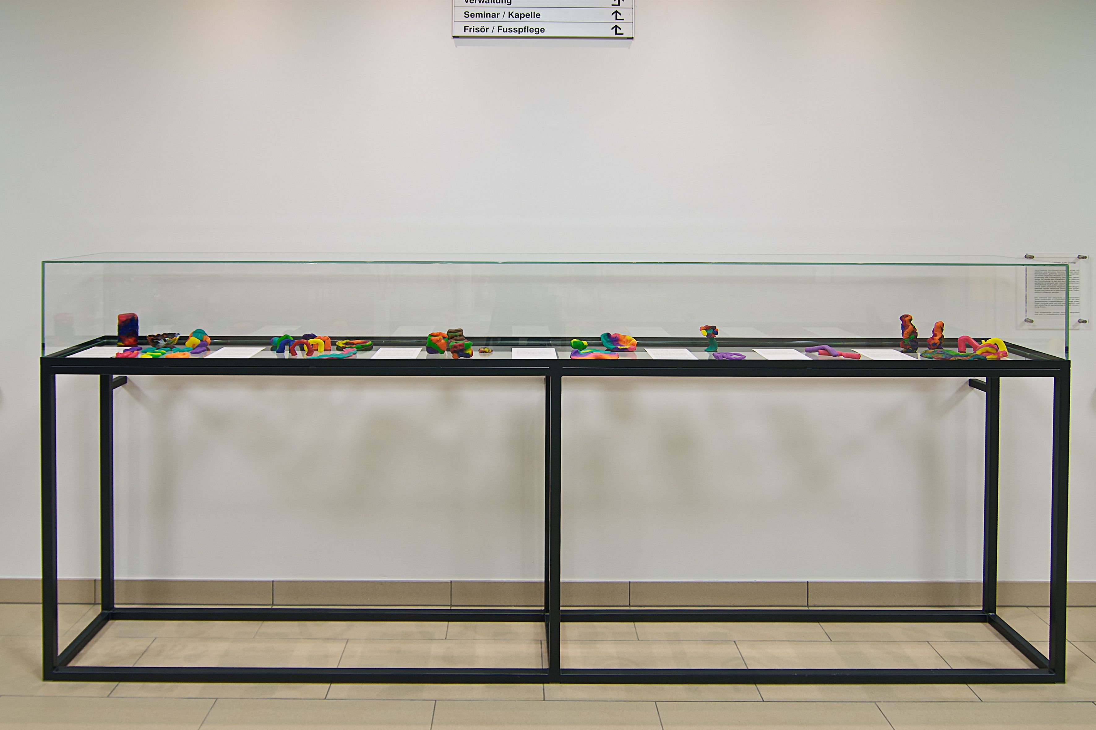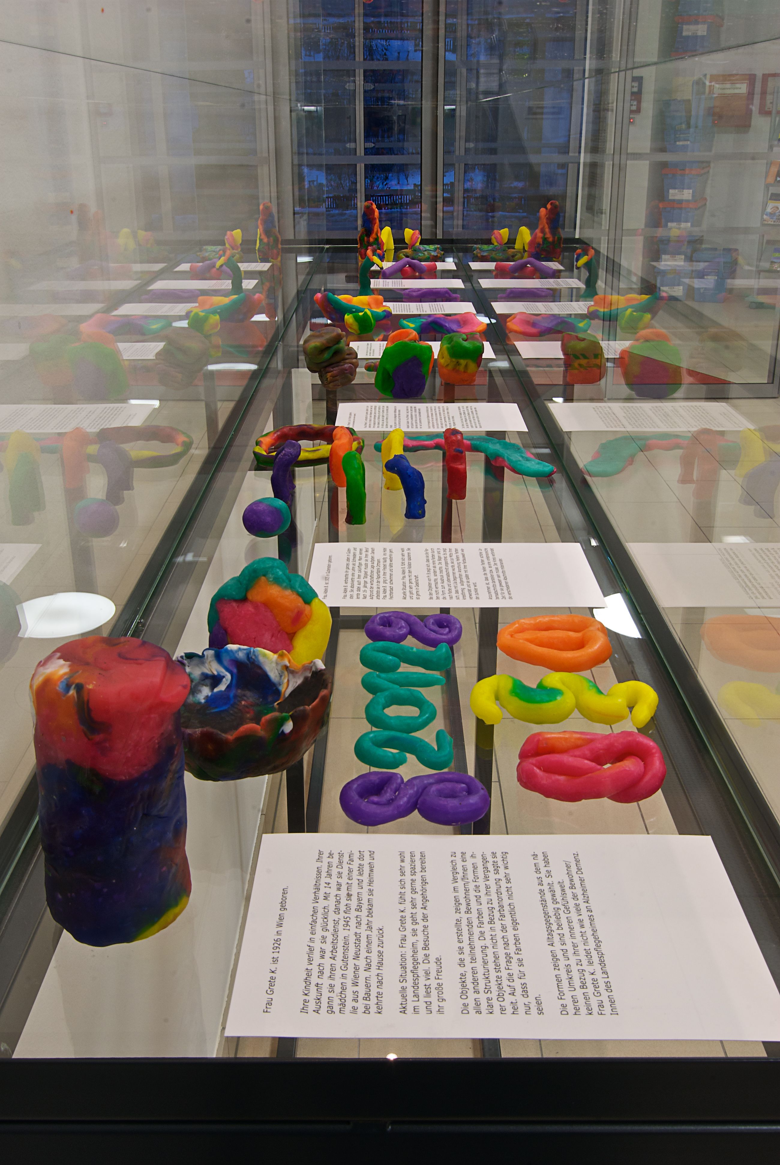 "Form als Möglichkeit zum Dialog" ist der Titel des Projekts, mit dem sich Robert Reszner den großteils demenzkranken Personen im Landespflegeheim widmet. In Zusammenarbeit mit einem ausgebildeten Krankenpfleger führte er mit mehreren HeimbewohnerInnen Gespräche über ihr Leben. Während dieser Gespräche bat Reszner seine Gegenüber, farbiges Plastilin nach ihrem Belieben zu formen. Die dabei entstandenen Objekte sind Form gewordene Erinnerungen, Manifestationen von Empfindungen – teilweise parallel zu Erzählungen entstanden, teilweise anstelle dieser. "Das Faszinierende bei dieser Arbeit ist für mich, dass Erlebtes sich direkt beim Formen umsetzt und die Form durch die Bewohner des Pflegeheimes entsteht. So wird das Pflegeheim zum Zentrum der Formfindung, in der sich eine innere Welt schöpferisch nach außen überträgt", sagt der Künstler. Die Erzählungen wurden schriftlich zusammengefasst und mit den Objekten in einer Vitrine ausgestellt. Aus allen Objekten wählte Robert Reszner drei aus, die er in bis zu zweieinhalb Meter große Außenraumskulpturen aus wettertauglichem und UV-beständigem Material übertragen ließ. Es ist die erste Arbeit des Bildhauers mit einem partizipatorischen Zugang. Robert Reszners Anspruch bei diesem ist wohlgemerkt ein künstlerischer. Der Vorgang der Formfindung ist dabei gleichzusetzen mit einem Vorgang der Sprachfindung. Es geht darum, unmittelbare Ausdrucksformen für das Unsagbare zu finden. Doch Robert Reszner hat für Gutenstein keinesfalls seine künstlerische Methode geändert. Er ist eine Art Alchemist, der in seinem künstlerischen Werk von der Beschaffenheit des Materials ausgeht, um eine – dieser entsprechenden – ideale Form zu finden. Seine Installationen, räumlichen Interventionen und benutzbaren Objekte erinnern an Versuchsanordnungen. Es sind Ergebnisse prozessualer Vorgänge, denen er das Material aussetzt, indem er unterschiedliche Aggregatzustände erzeugt, verschiedene Komponenten und Elemente mischt. Das sagen bereits Titel wie "Im Holz", "Innere Wasser", "Luftverhältnis" oder "Brutanstalt" aus. In diesem Sinne könnte das Projekt für das Landespflegeheim auch "Dialog als Möglichkeit zur Form" heißen.