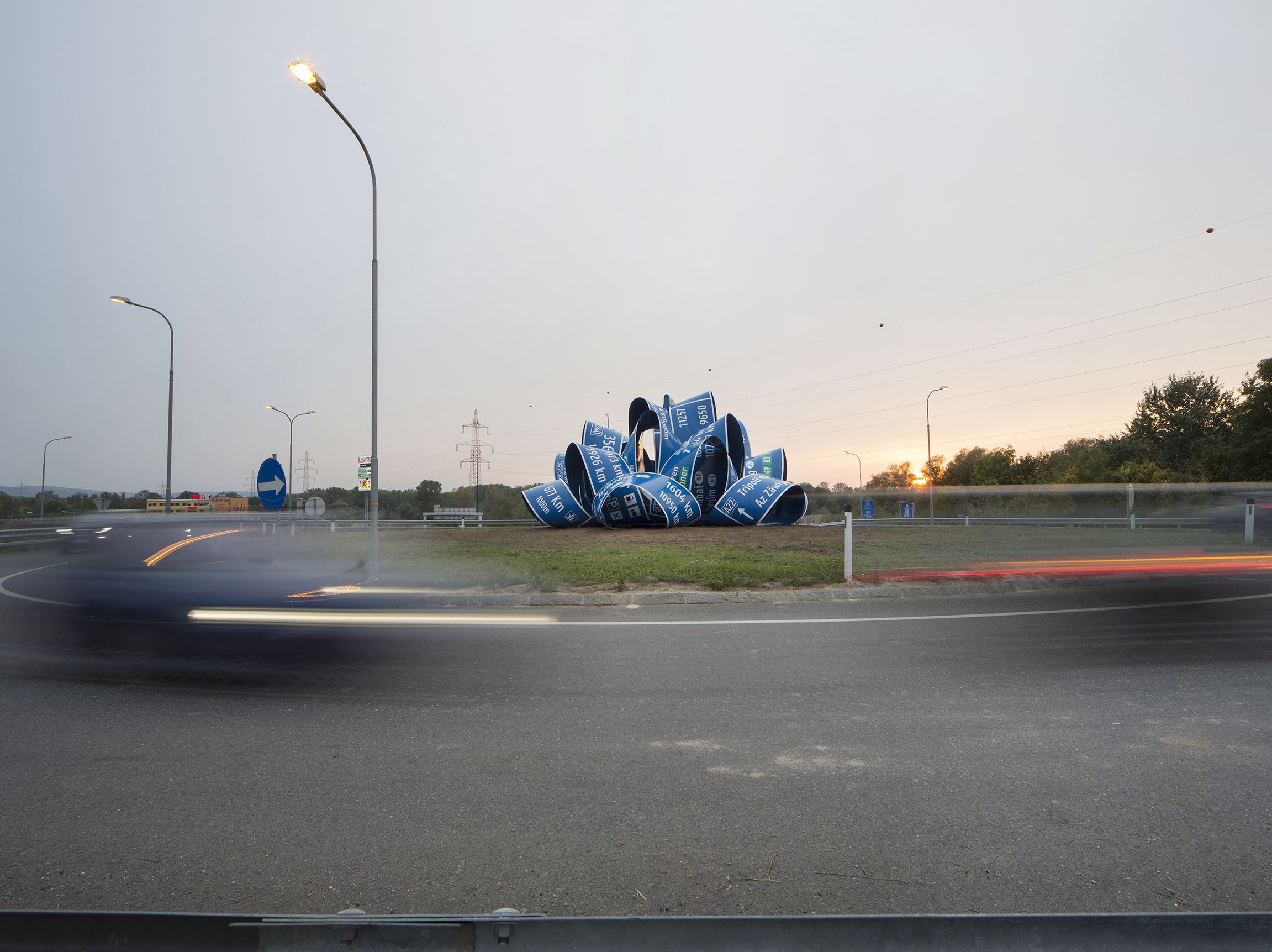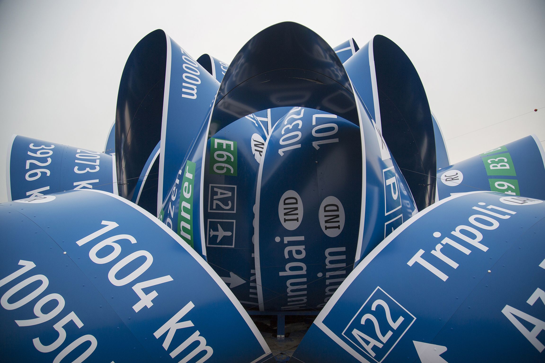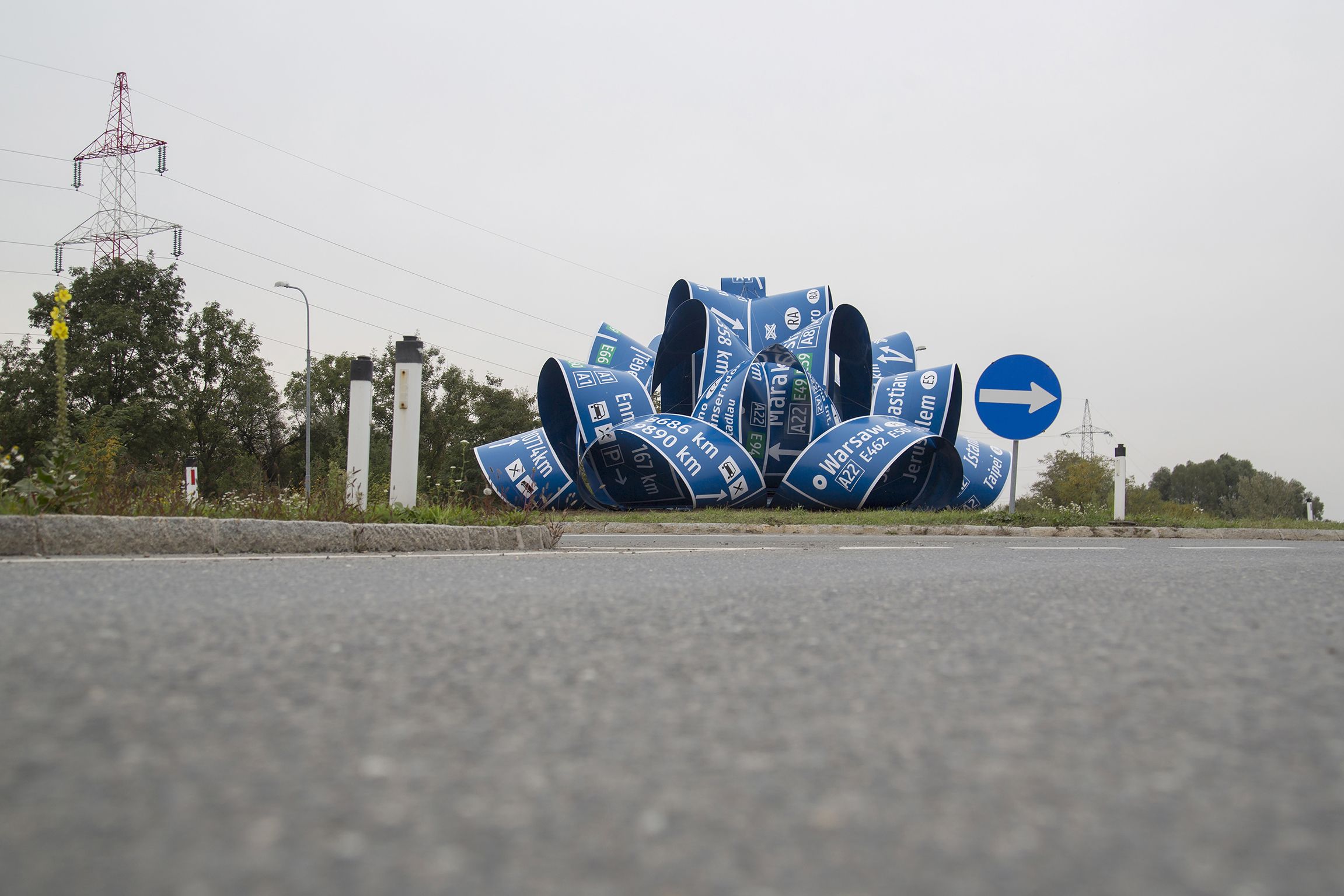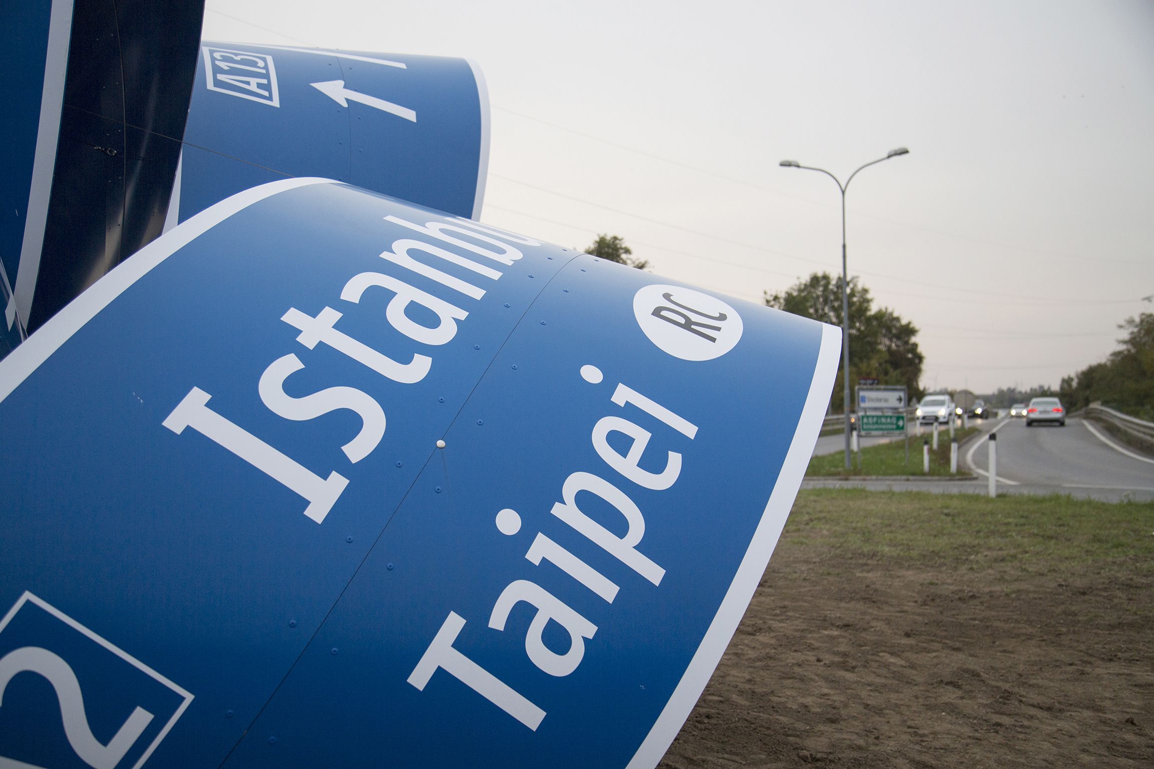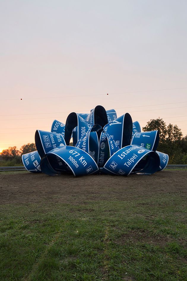 Der indische Künstler Jitish Kallat biegt und verknotet beim Kreisverkehr in Stockerau Autobahnschilder zu einem gigantischen Knäuel aus Endlosschleifen. Auf den ersten Blick, wenn man in die Rundung einbiegt, wirken die Schilder trotz ihrer skulpturalen Überformung vertraut. Farbe und Schrift stimmen. Erst beim Weiterfahren schleicht sich eine Irritation ein, eine Vermutung dehnt sich aus wie ein visueller Dopplereffekt: Die Schilder weisen nicht in den Nachbarort und auch nicht in die nächst größere Stadt. Marakesh, Sidney, Warschau, Mumbai, Caracas, Los Angeles – die ganze Welt scheint sich in diesem Kreis zu ballen.